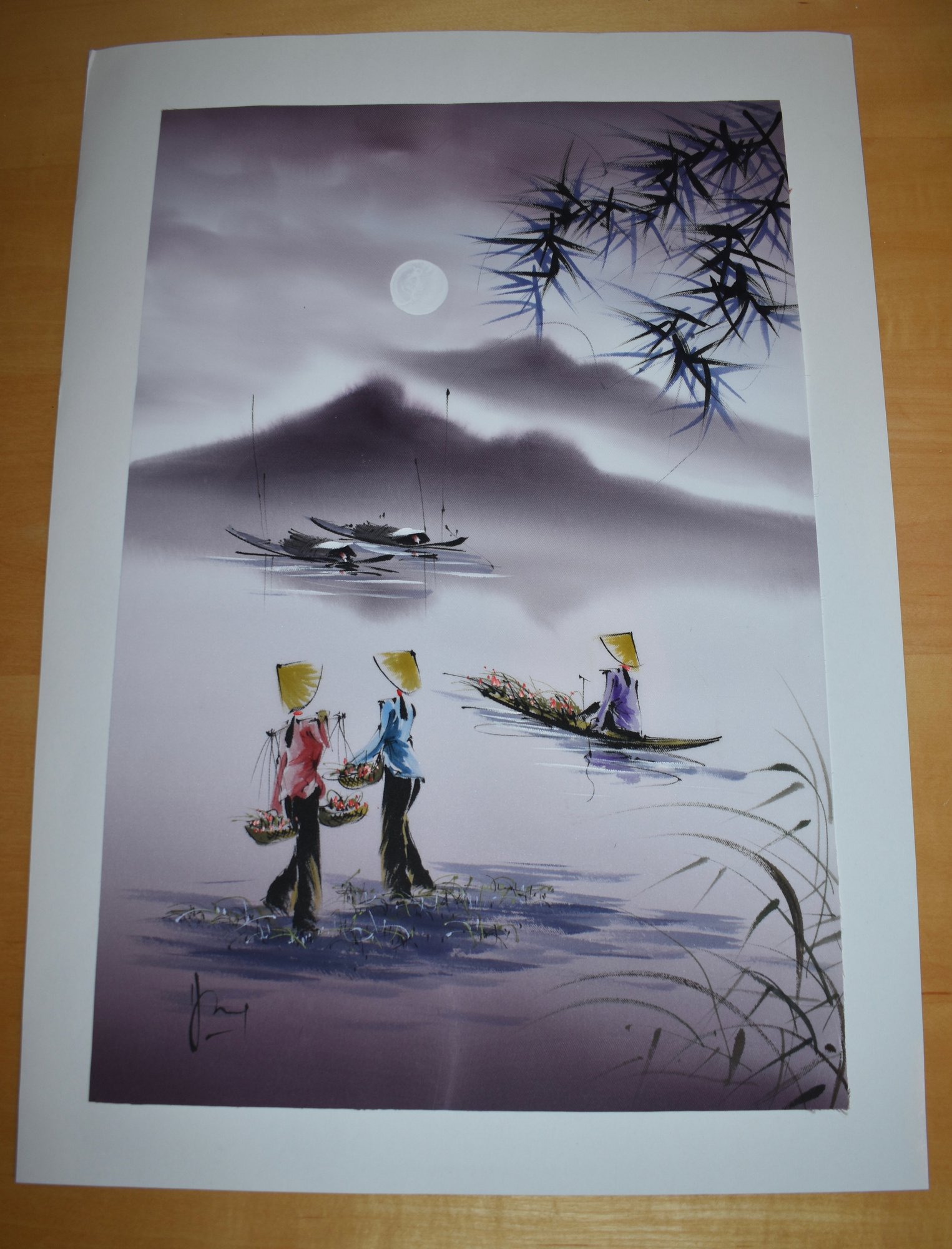 Cambodian Painting On Silk Women In Field With Boat Textile Art