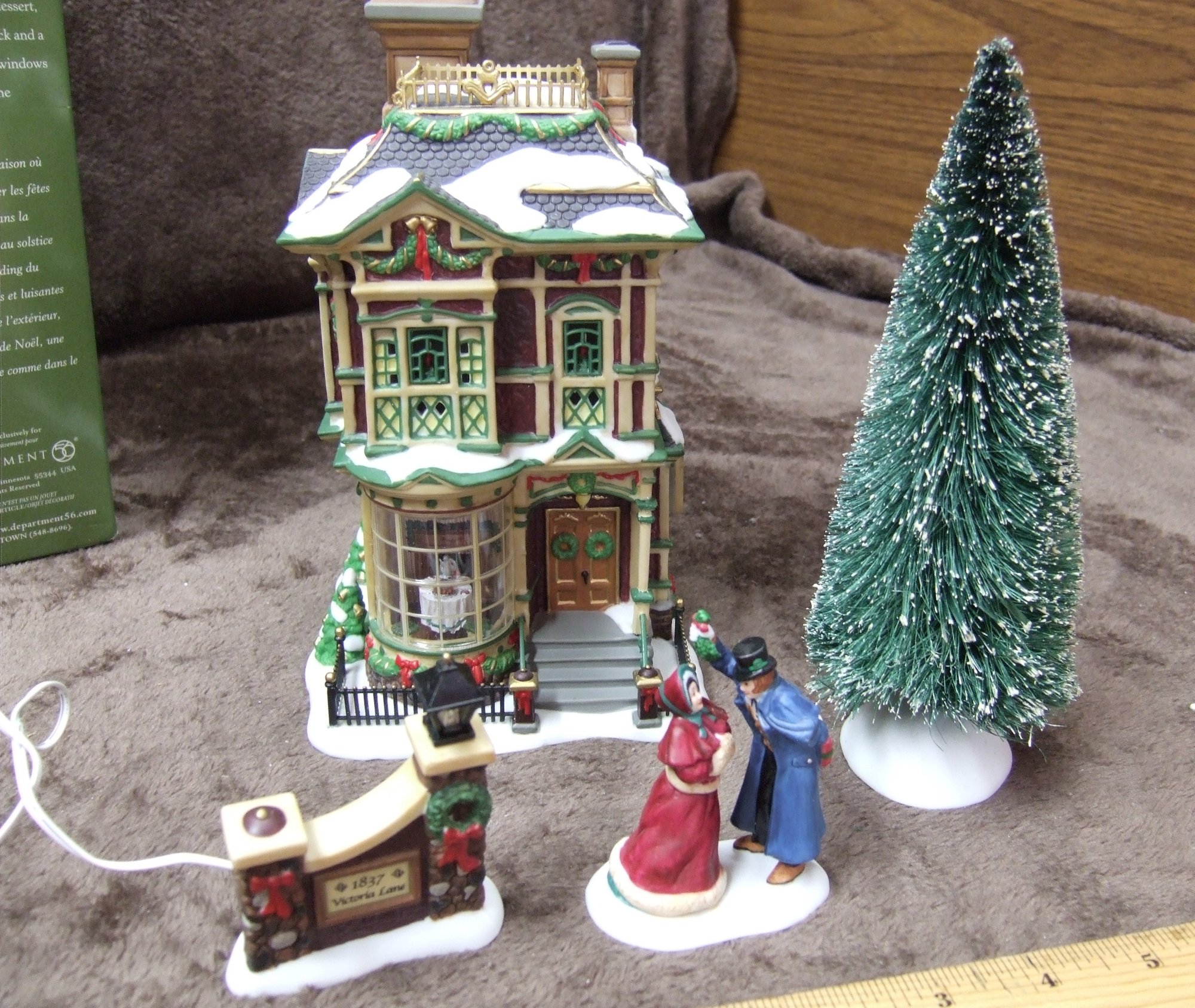 Dimensions Approx: Victorian House L 5" x W 5.5" x H 8 ", Frosted Sisal Tree L 3" x W 3" x H 8", Kissing Under the Mistletoe L 2.5" x W 1.5" x H 3.5", Lit Sign L 2.5" x W 1" x H 3.5",