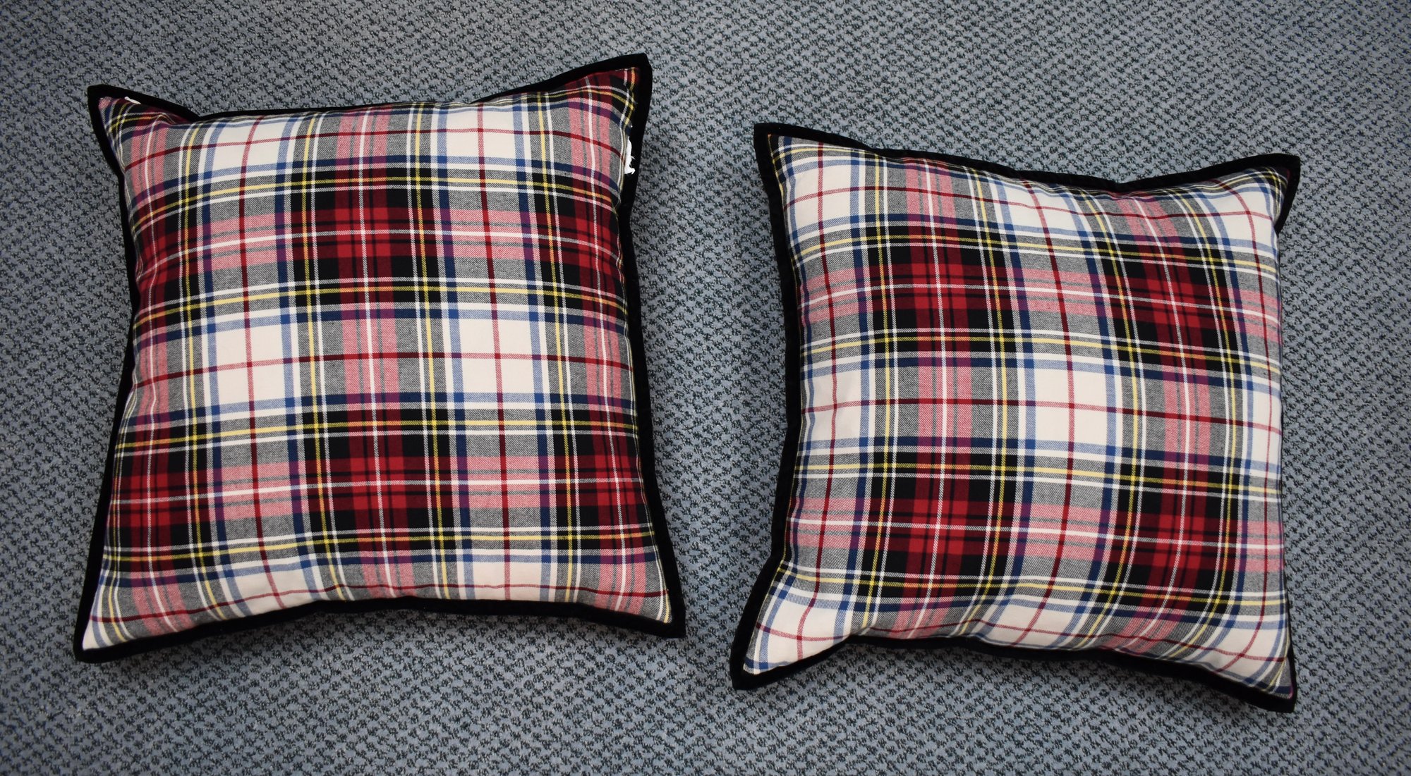 20 x 20" square multicolored plaid pattern made of velvet and 100% cotton material and filled with plush waterfowl feathers