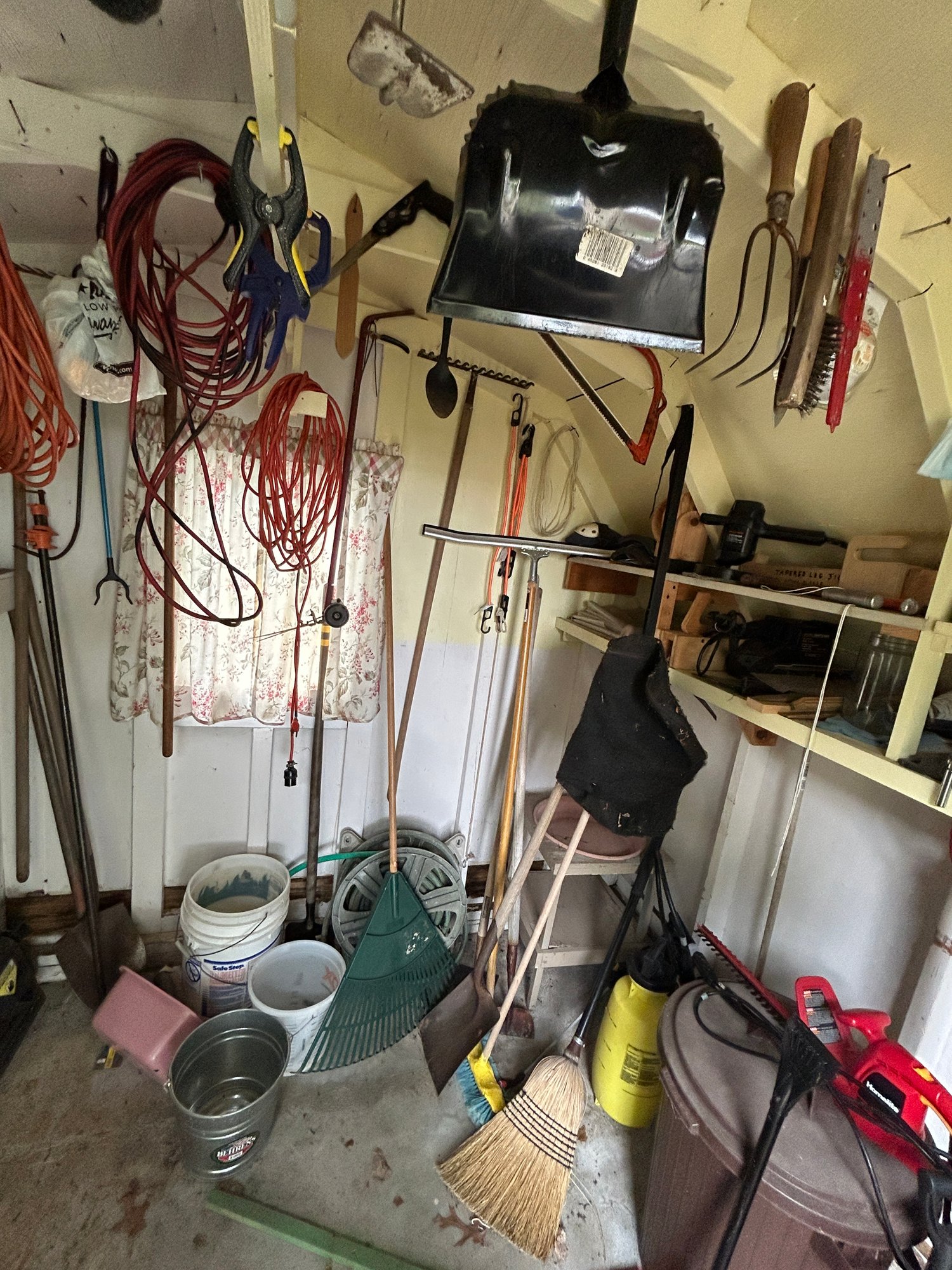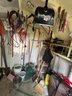 tools, garbage barrel, misc items including planting stand with bowl, see photos, also folder found with a couple manuals