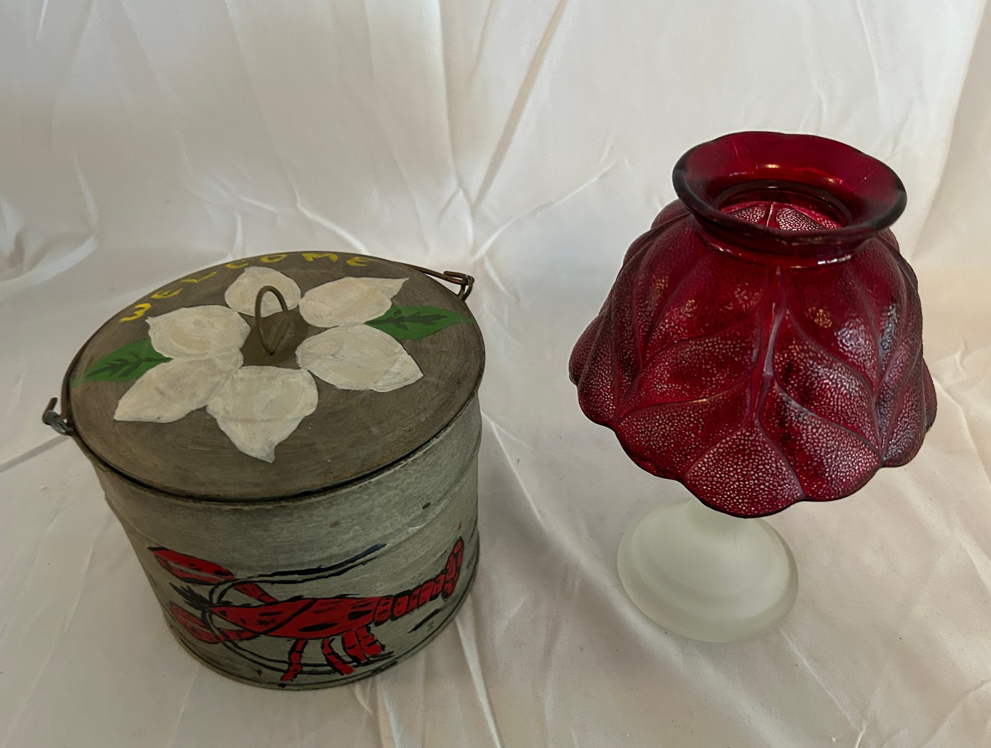 Vintage LE Smith Candle Lamp And Hand Painted Lobster Tin Bucket