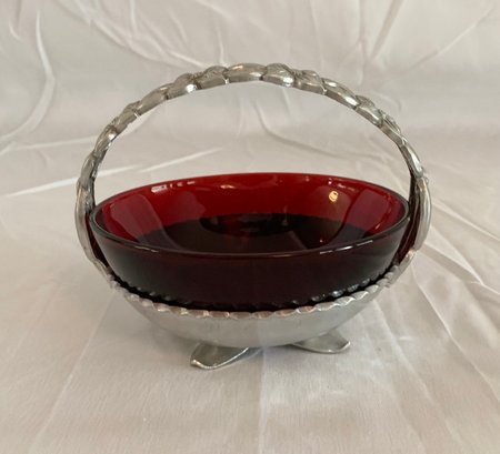 Vintage Rodney Kent Hammered Aluminum Metal Basket & Ruby Red Glass Dish Bowl