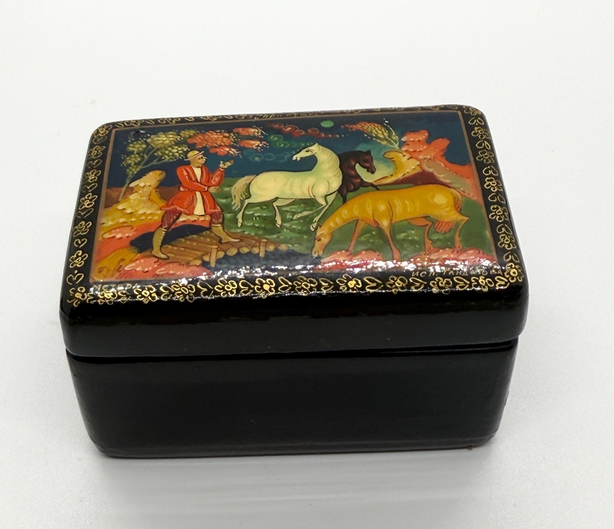 Vintage USSR Hand Painted Horse Castle Lacquer Mini Trinket Box Red Interior #702