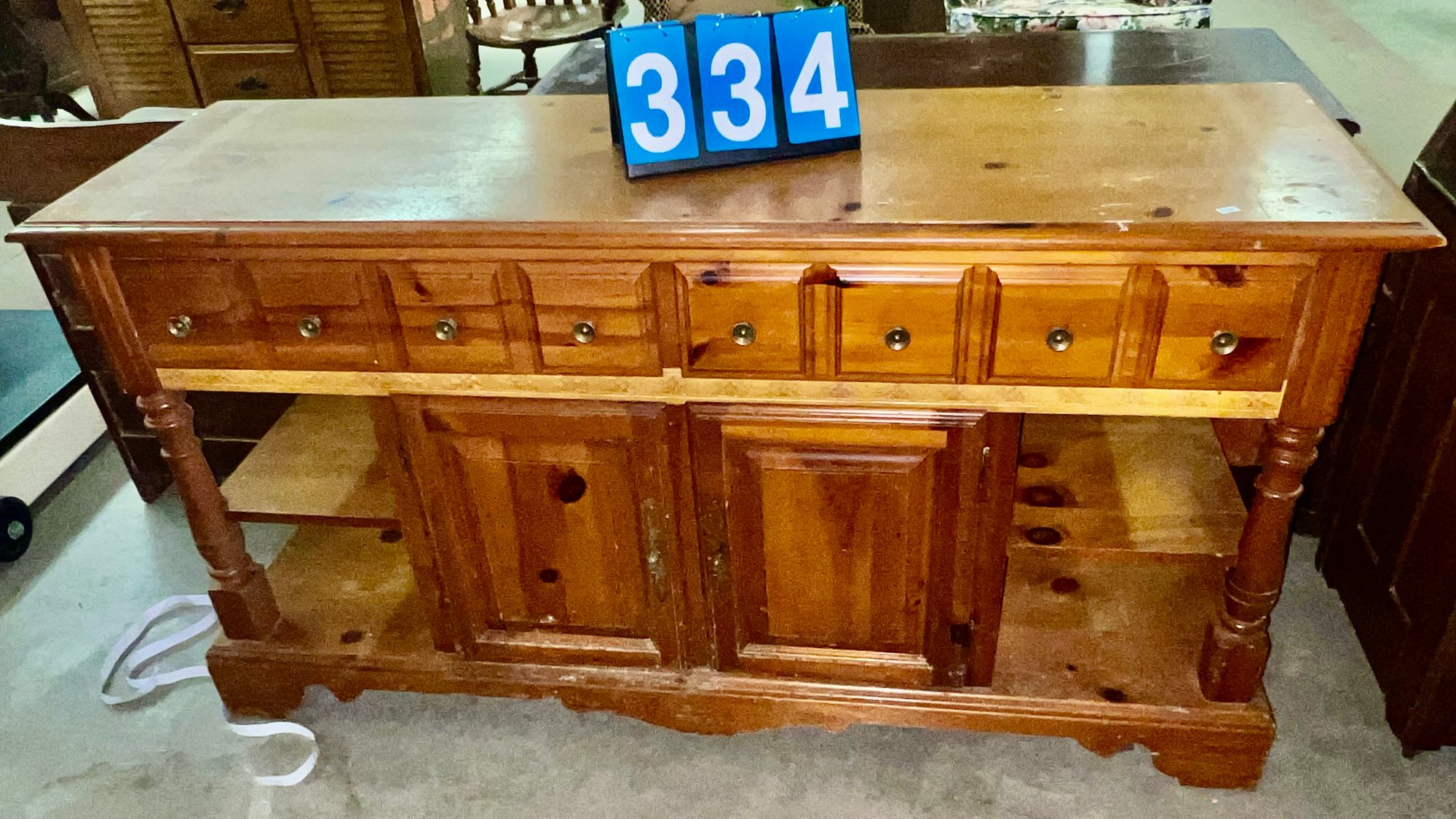 Pine Sideboard With Many Drawer And Shelfs At Each End, 5' Long