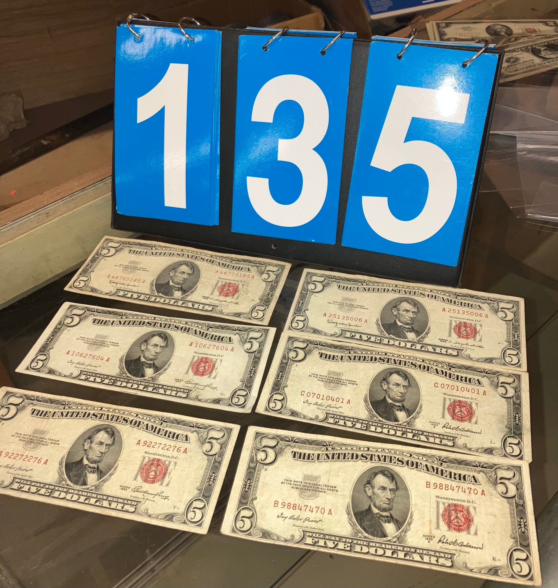 Lot Of 6 $5 Red Seal US Treasury Currency Bills, Lot 2