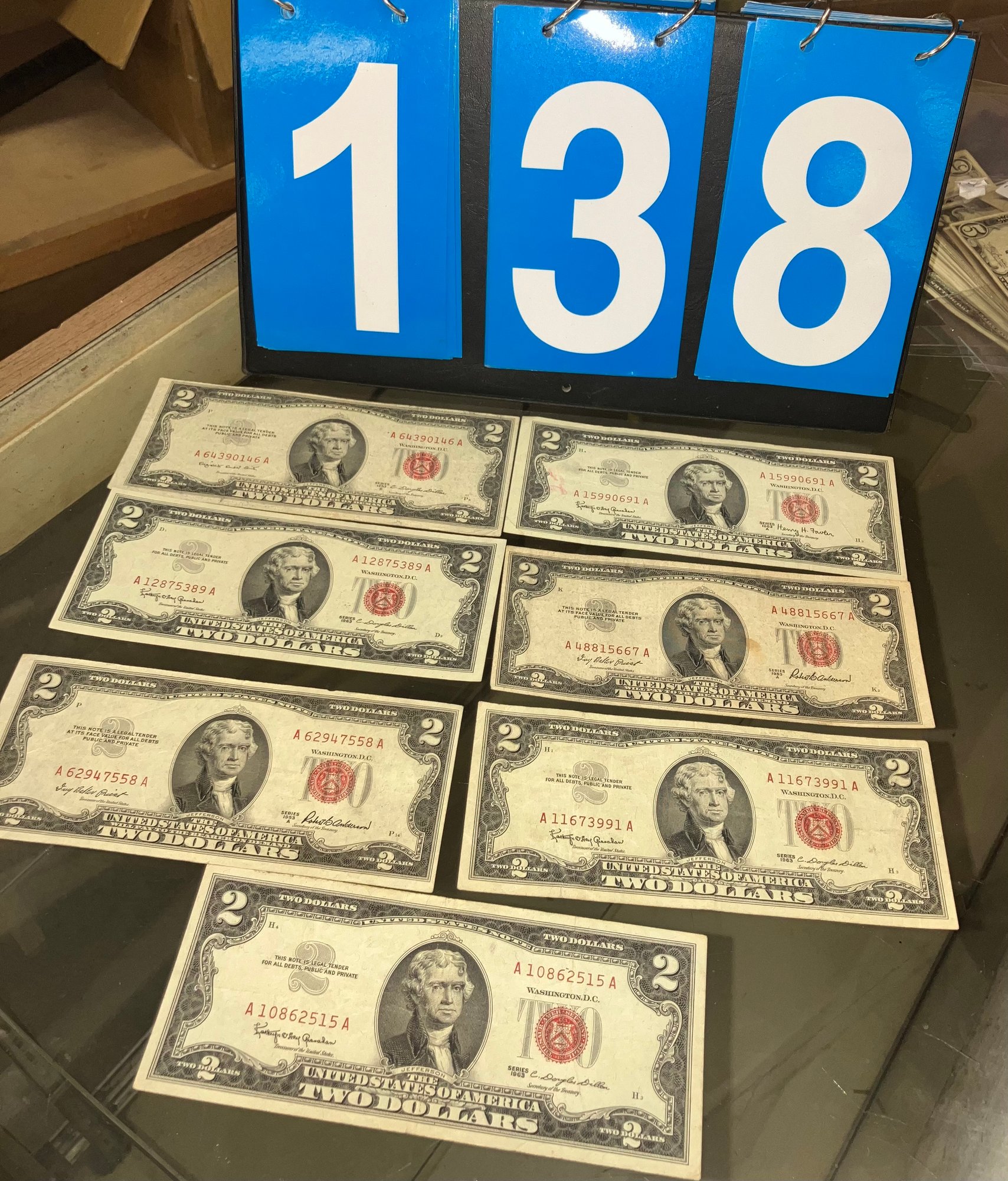 Lot Of 7 $2 Red Seal US Treasury Certificate Currency Bills