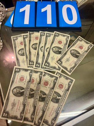Lot Of Currency Incl 11 $2 Dollar Bills In Plastic Storage Sleeve