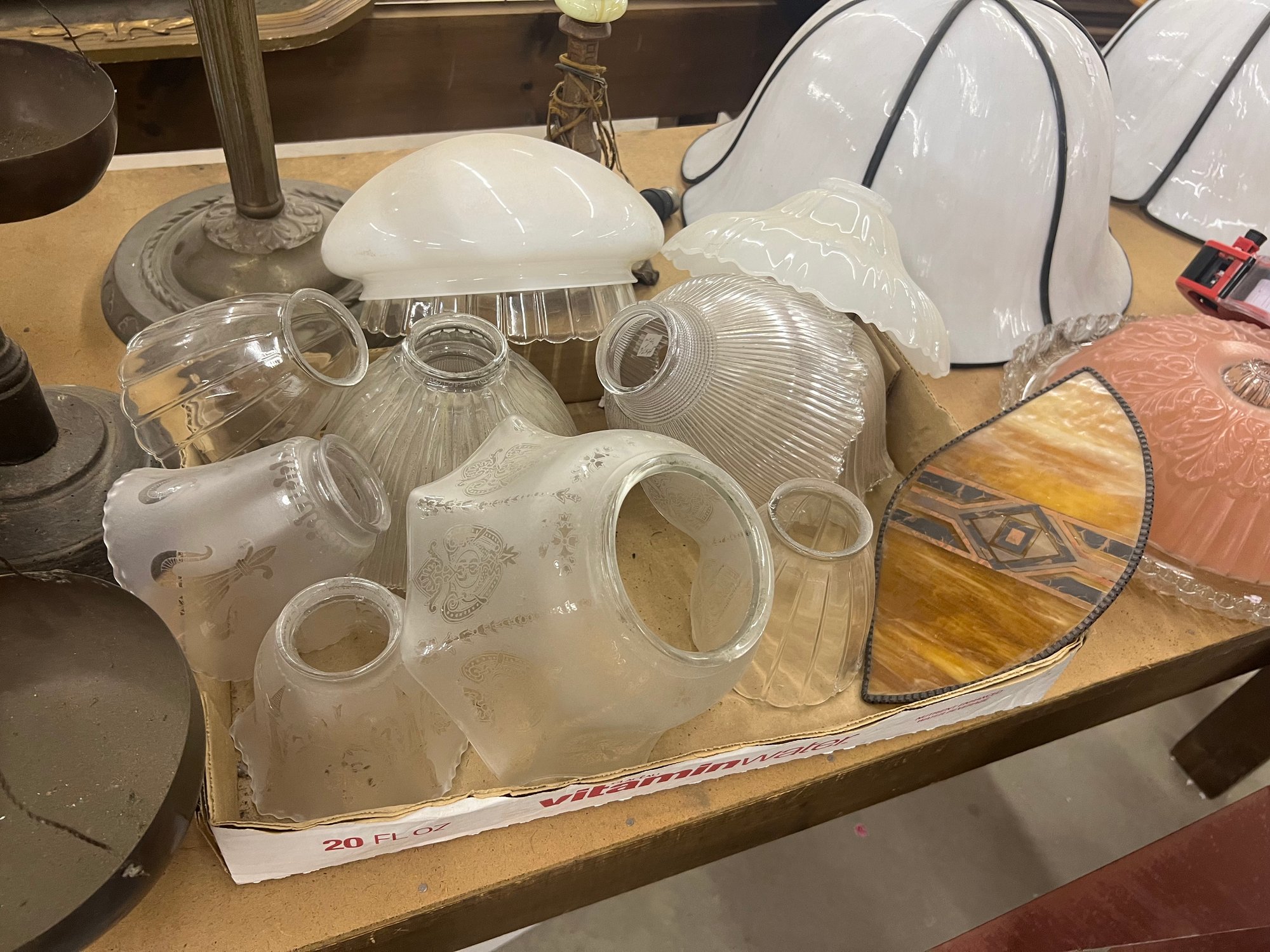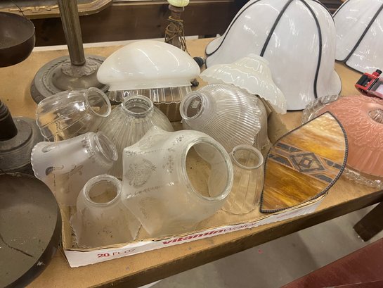 Group Lot Of Lighting Fixture Shades And A Slag Glass Panel With Deco Design