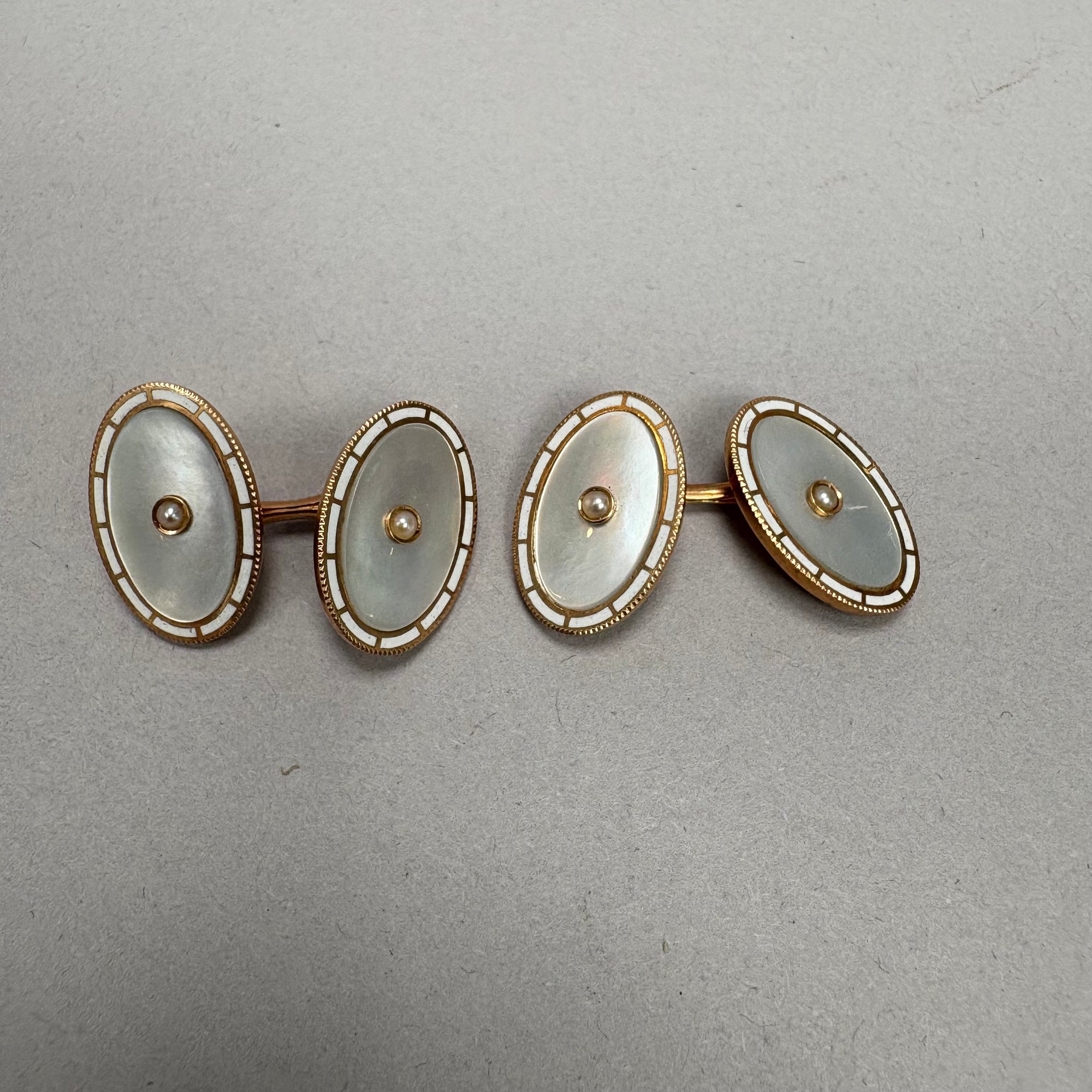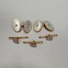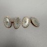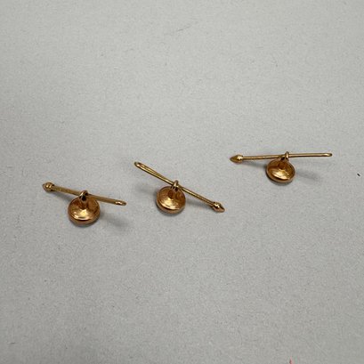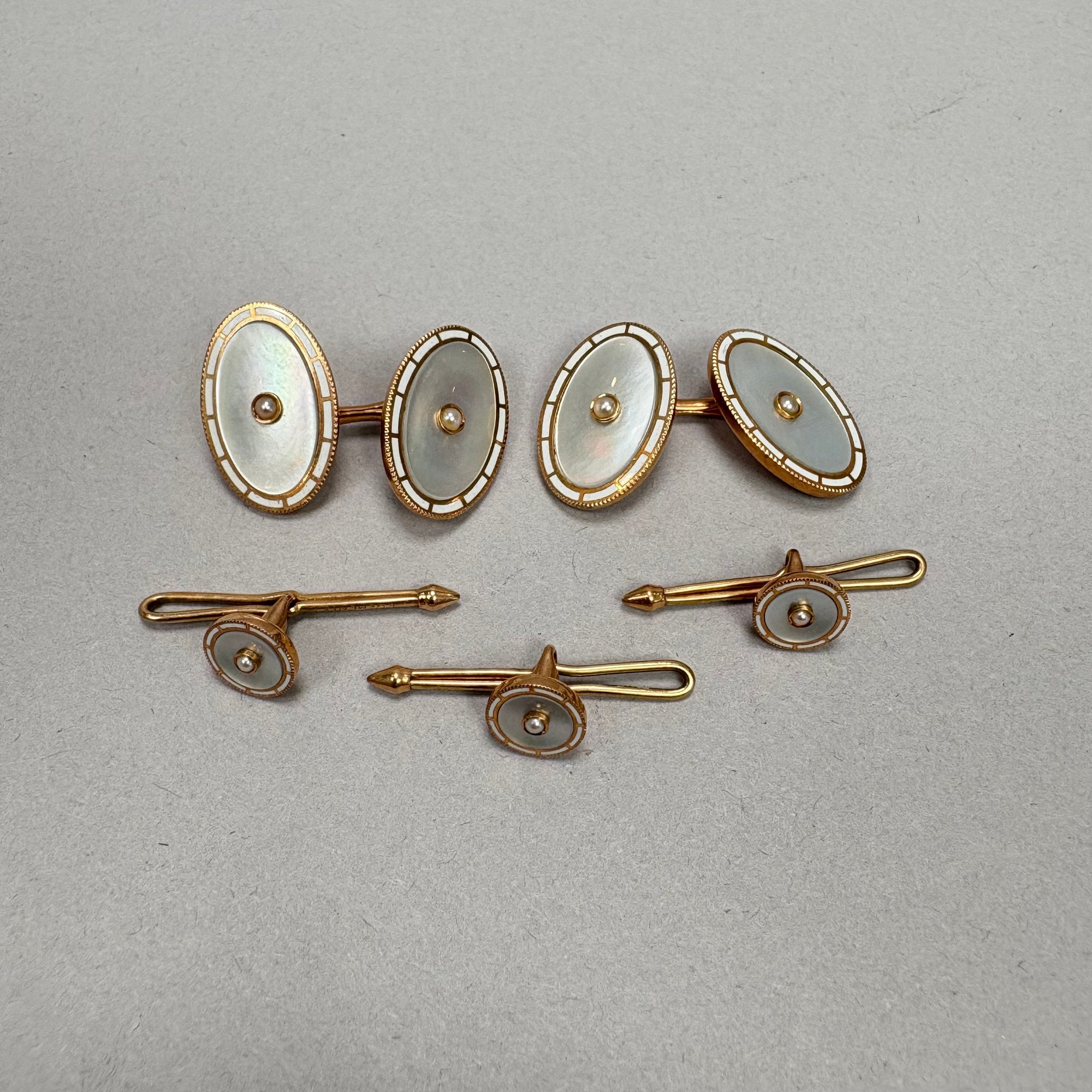 Pair of 14k Yellow Gold and Pearl Cufflinks and Three Studs, Krementz & Co., Newark, New Jersey. Each marked "14k," the studs also marked with the umbrella symbol and "KREMENTZ."