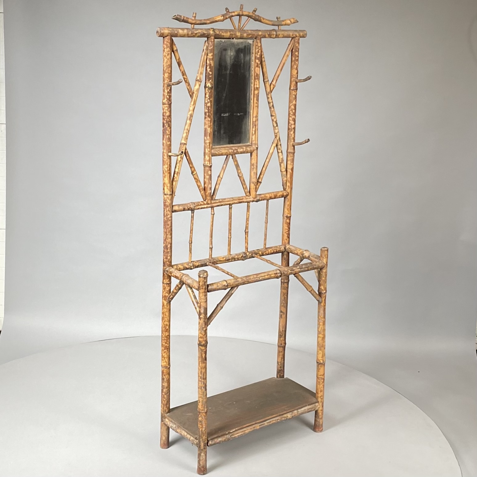 The fretwork back mounted with hanging hooks and centering a rectangular mirror plate, above a divided umbrella stand, on straight supports.