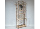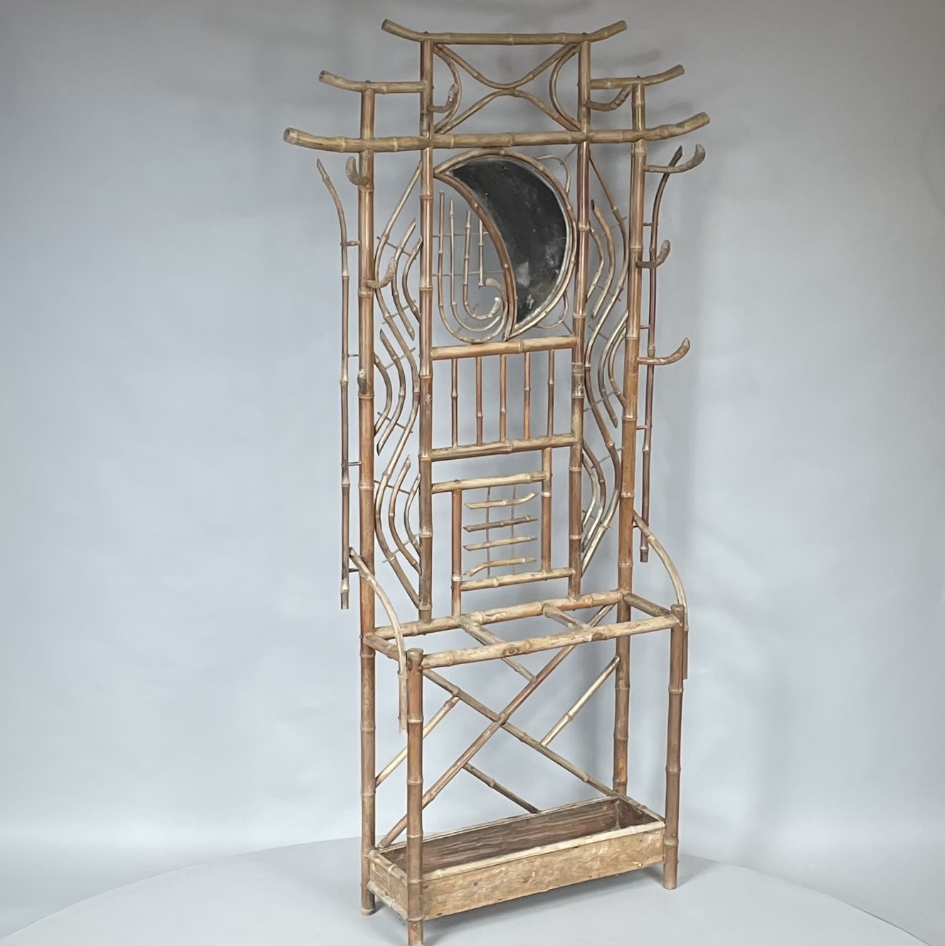 The fretwork back of pagoda form, mounted with hanging hooks and centering a crescent-shaped mirror plate, above a divided umbrella stand lined in grasscloth, straight supports.
