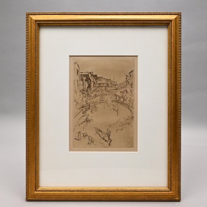 After James Abbott McNeill Whistler (American, Lowell, Massachusetts, London, 1834-1903). "The Bridge, Santa Marta." Print, faint butterfly monogram lower right, (image 6.875 x 4.75 inches).