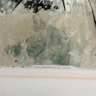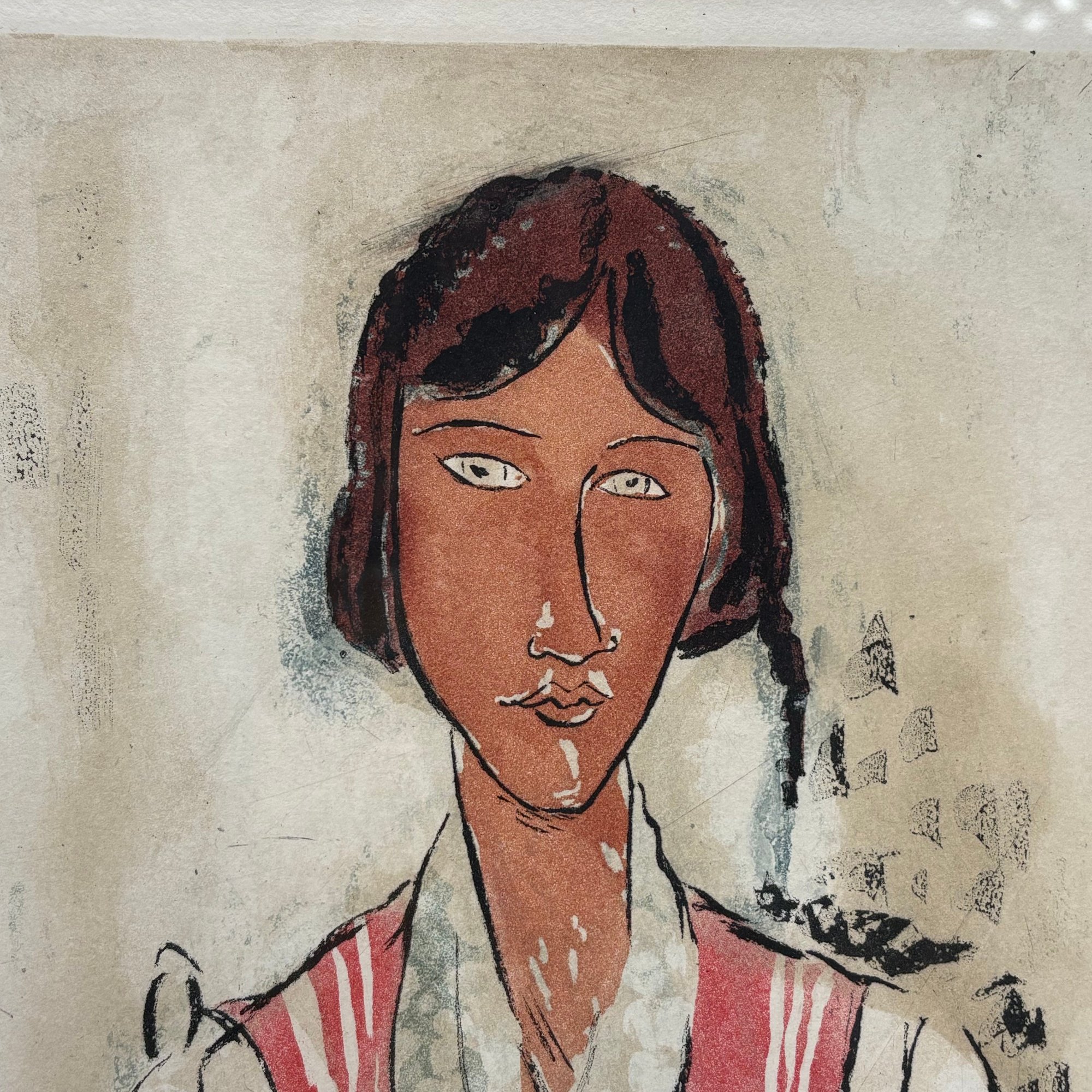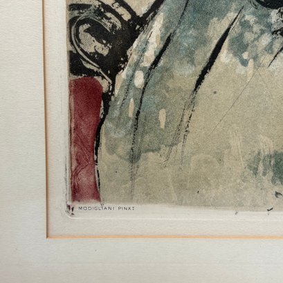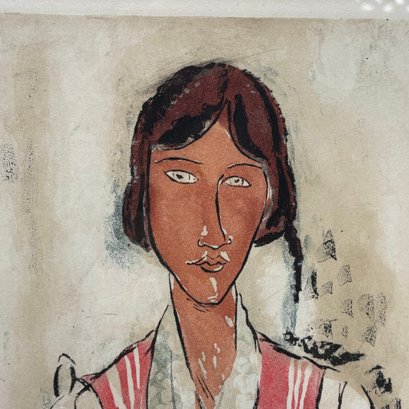 After Amedeo Modigliani (1884-1920, Italian). "L'Italienne," 1926-1927. Etching and aquatint in colors, signed in the plate "Modigliani" upper right, "MODIGLIANI PINXT" lower left," "CHARCOGRAPHIE DU LOUVRE" center and "JACQUES VILLON SCI" lower right, etched by Jacques Villon, published by the Chalcographie du Louvre, Paris, (20.125 x 12.875 inches, sight).