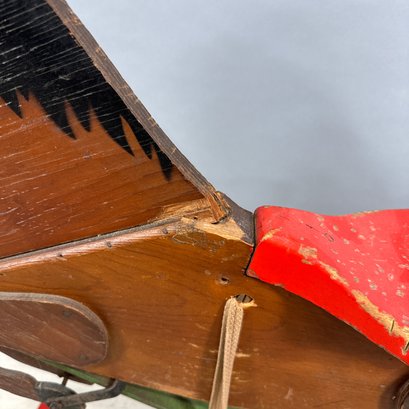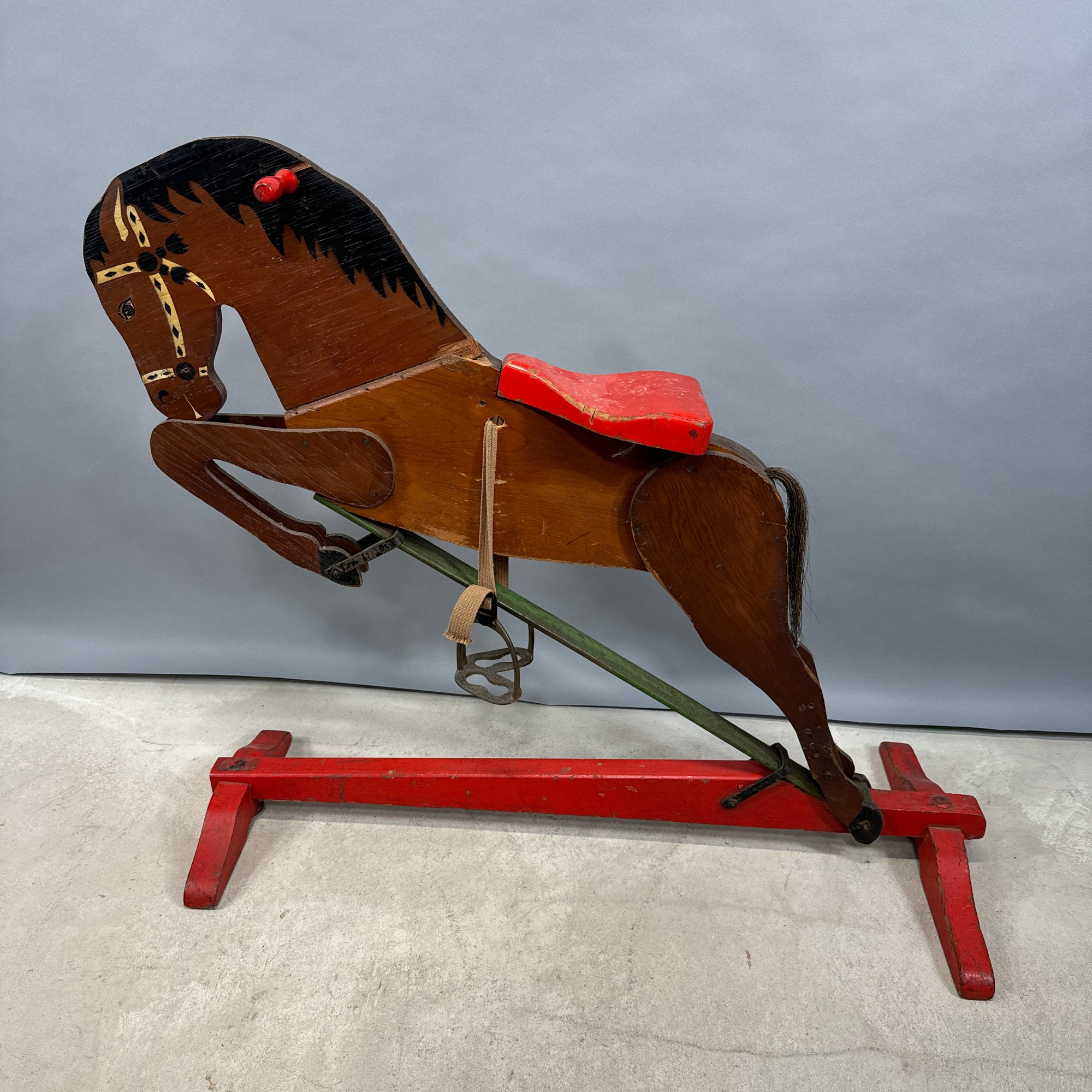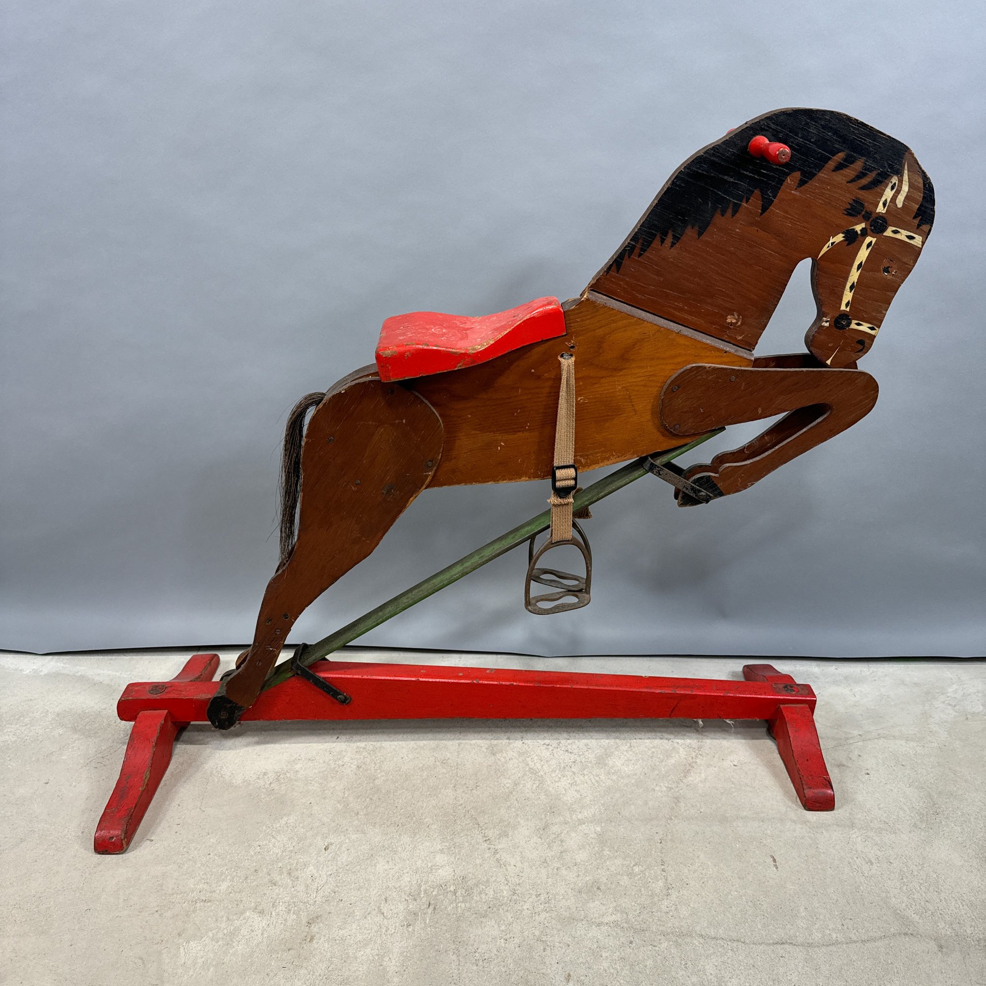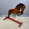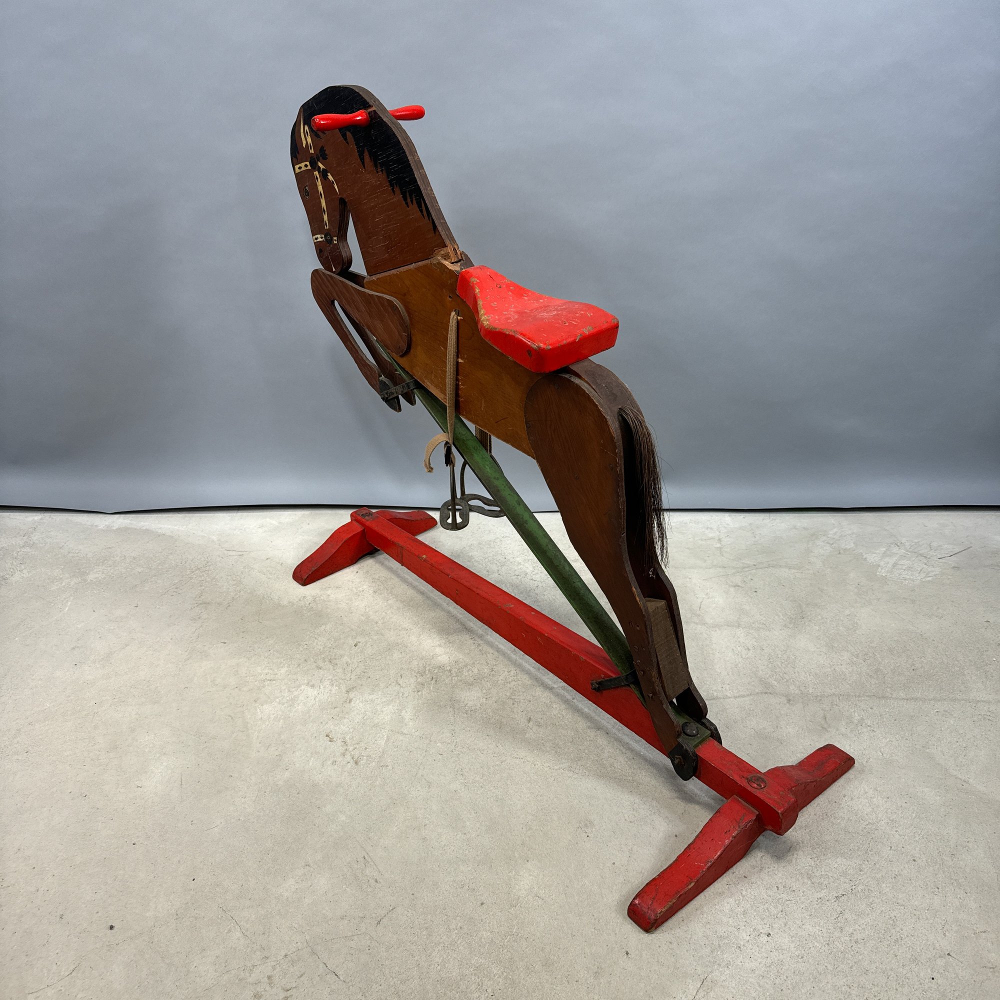 Painted Wood and Metal Bouncy Hobby Horse, Mid-20th Century. Painted facial features, hooves and saddle, steel stirrups, painted metal framework.