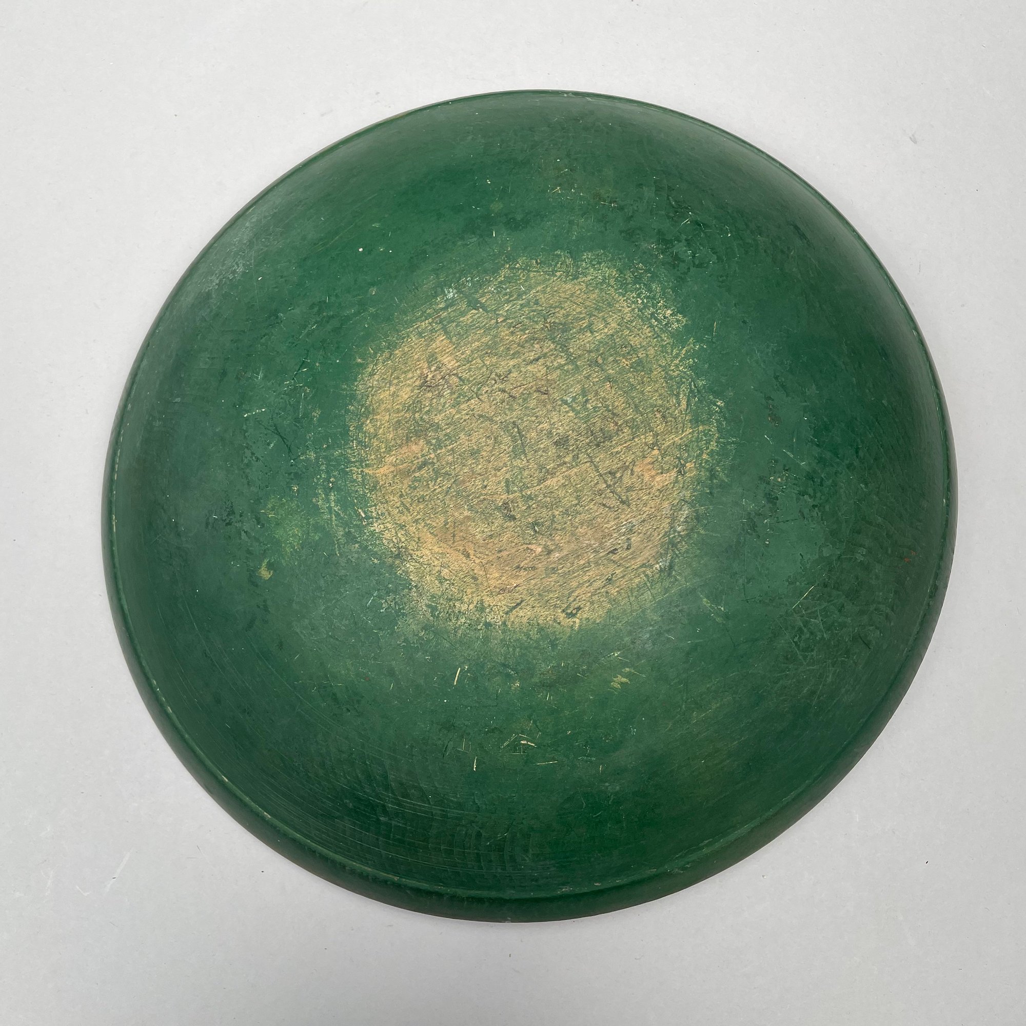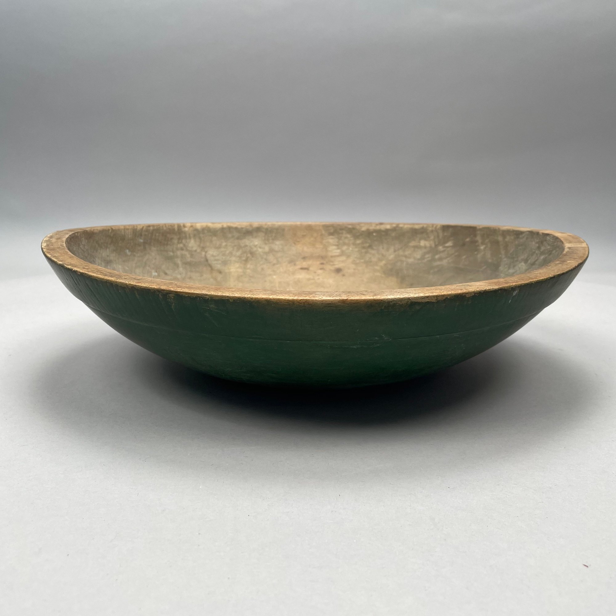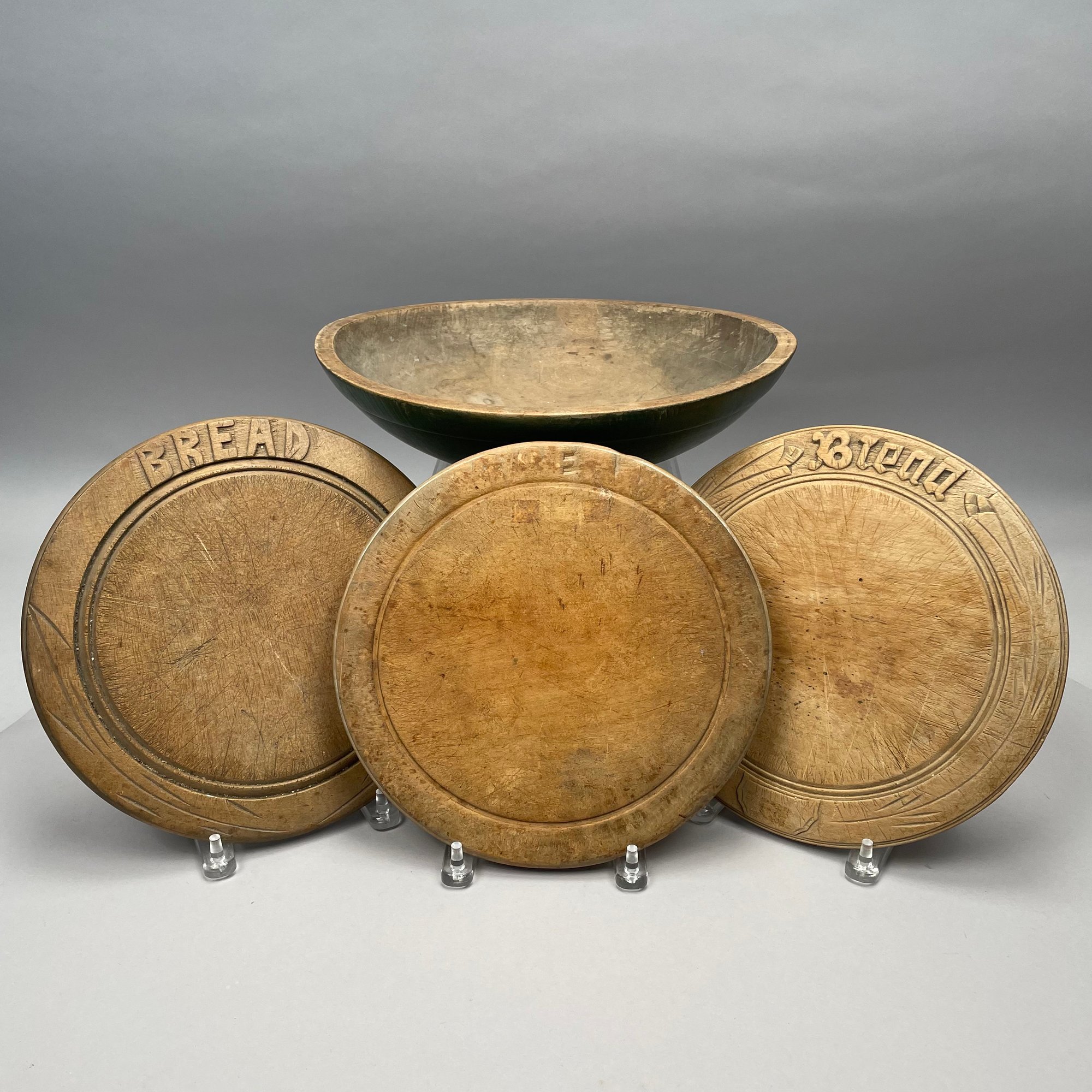Painted Wooden Bowl and Three Bread Trays. The bowl painted green on the exterior, each of the trays carved "BREAD."
