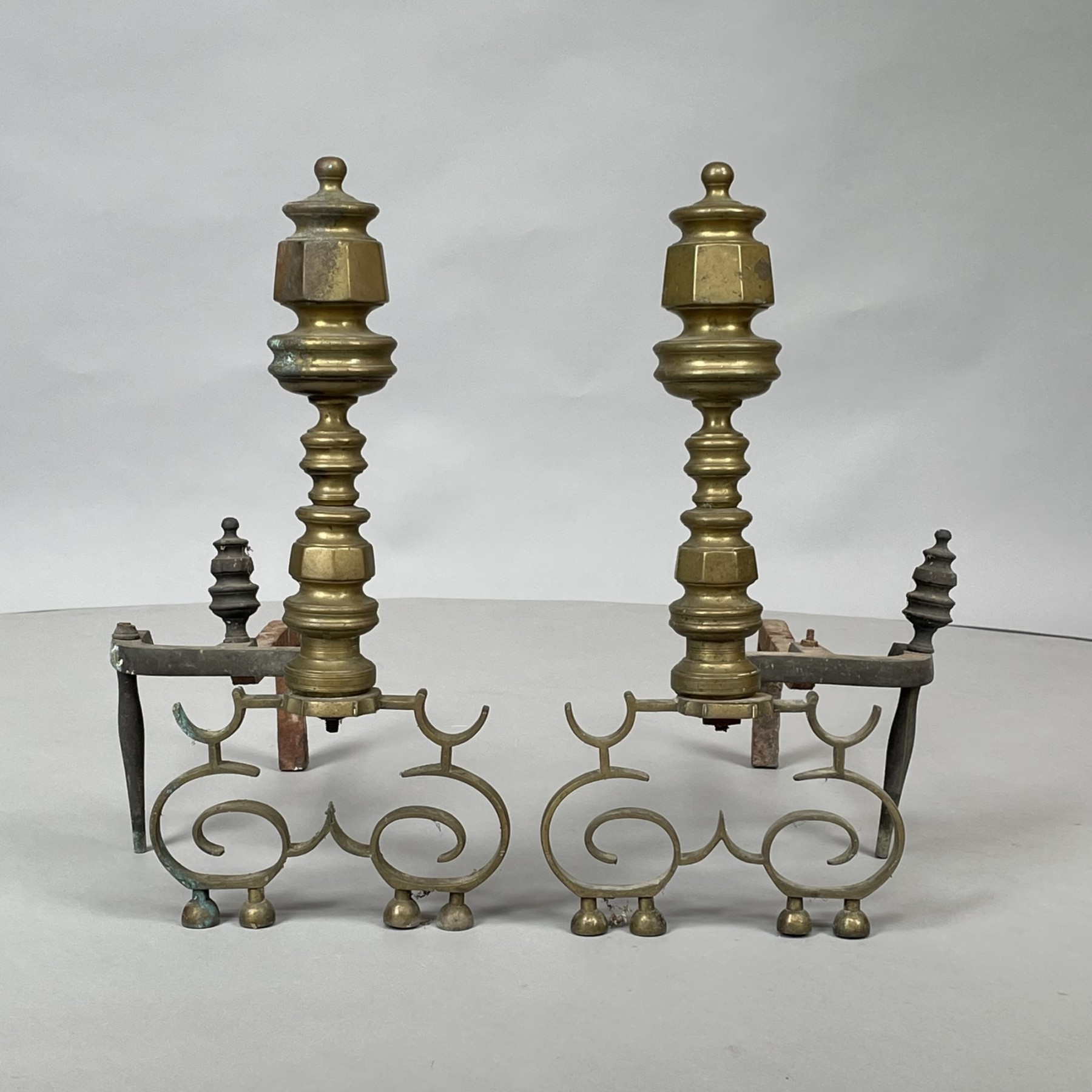 Each faceted knopped baluster standard raised on double curlicue supports set on bun feet, turned conical log stops.