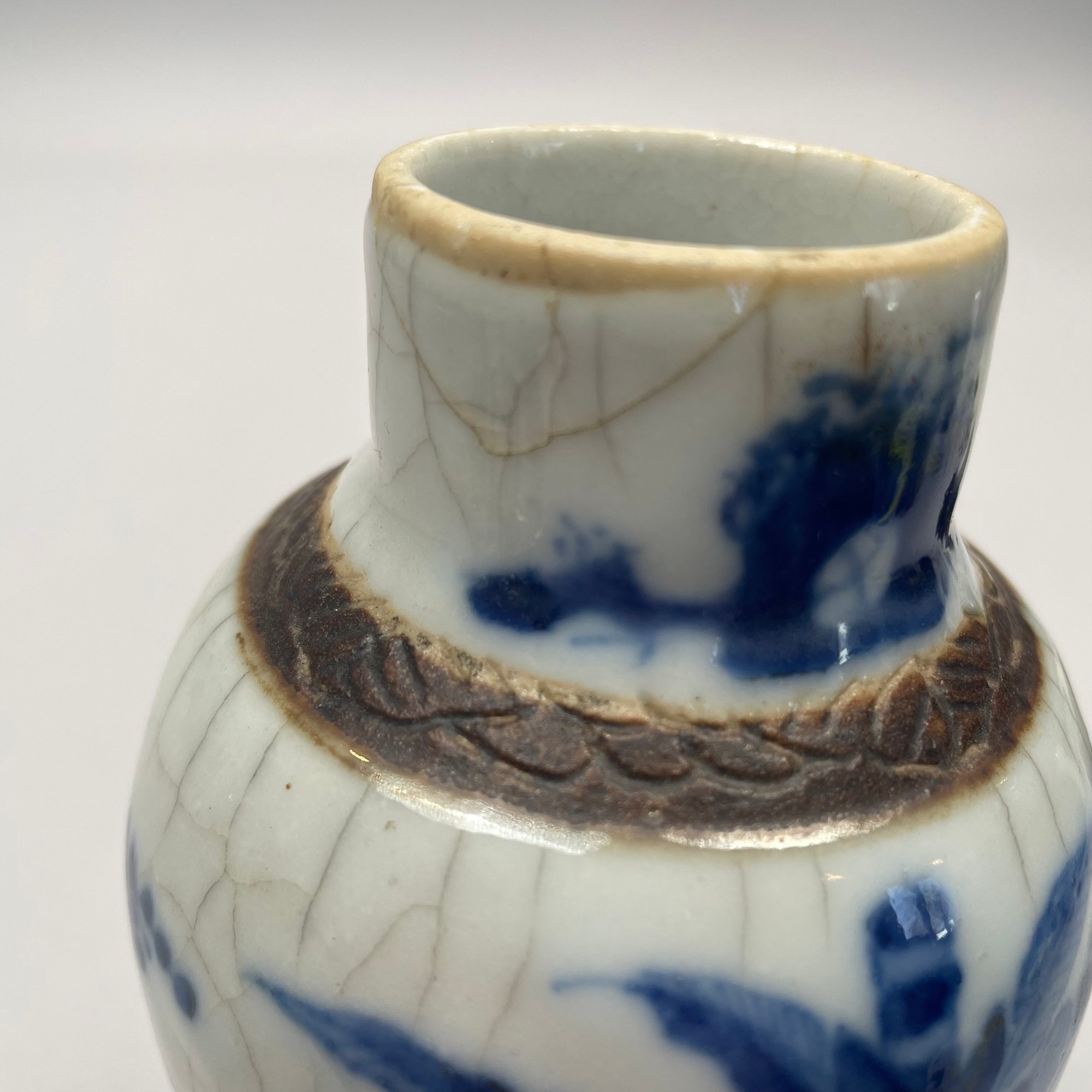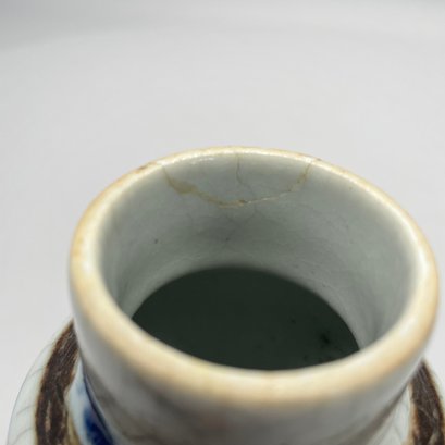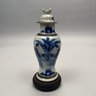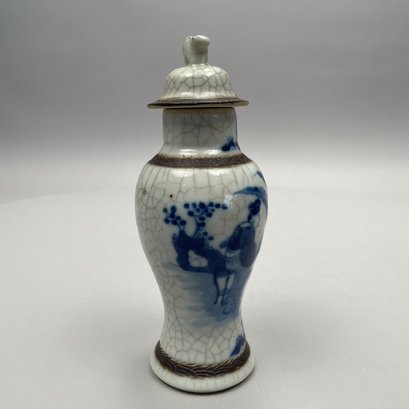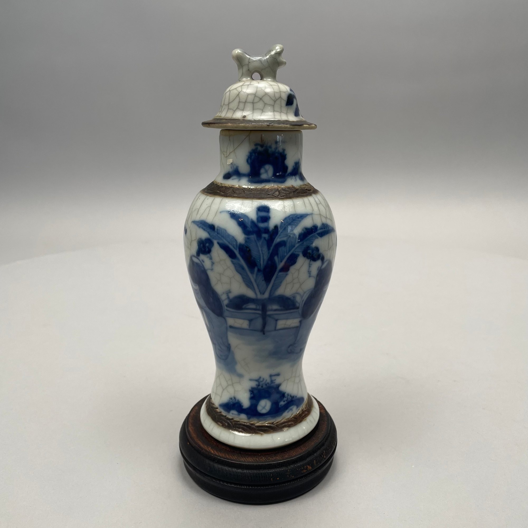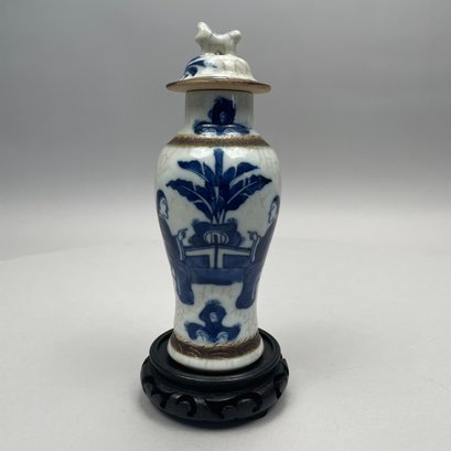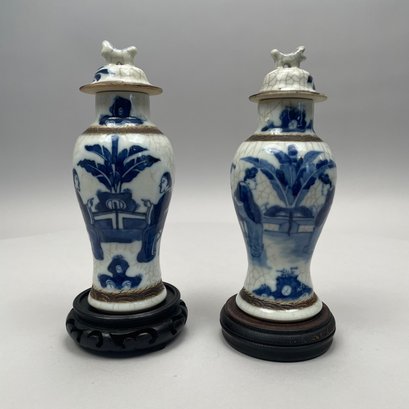 Pair of Chinese Blue and White Crackle-Glaze Porcelain Vases and Covers. Each marked, with hardwood stand.