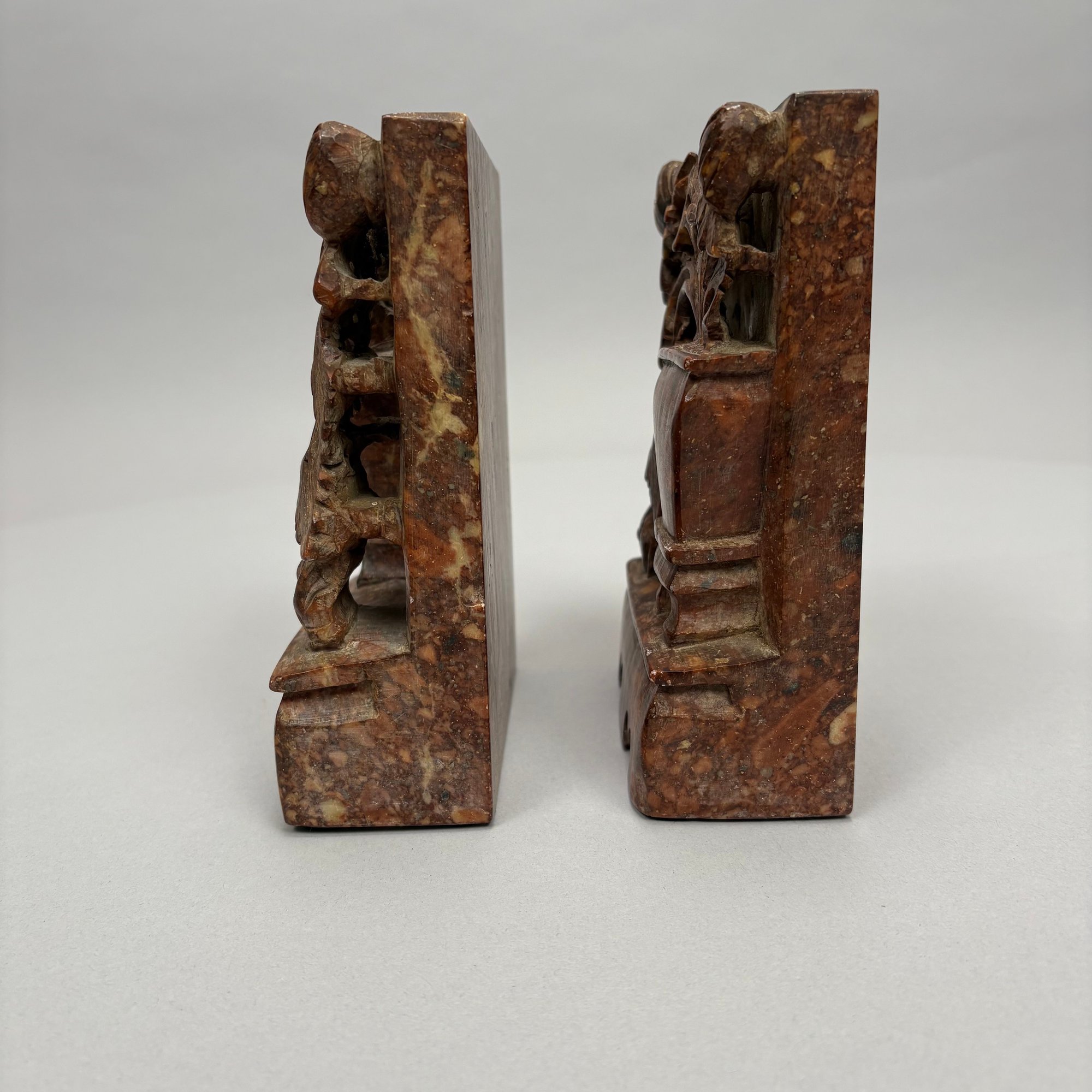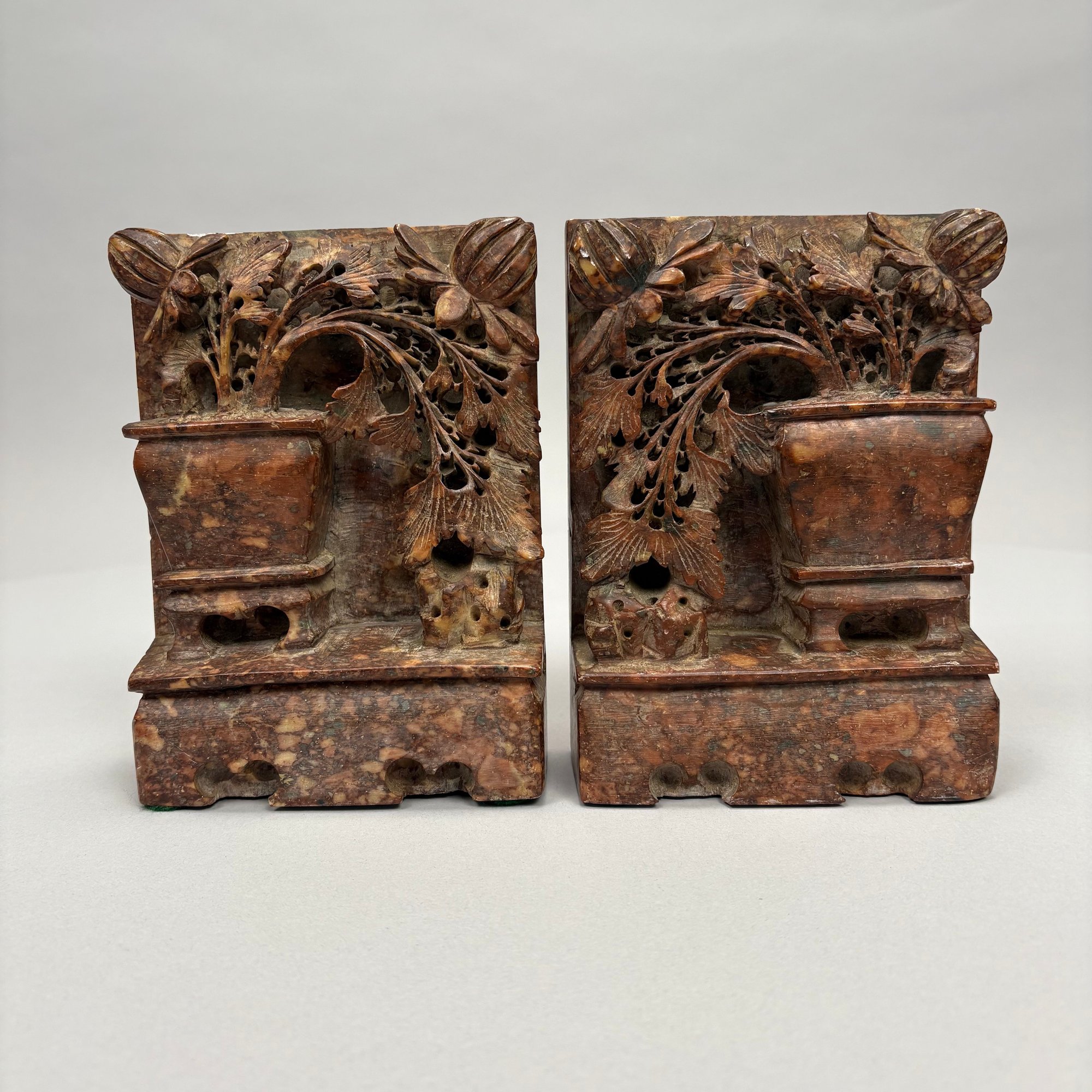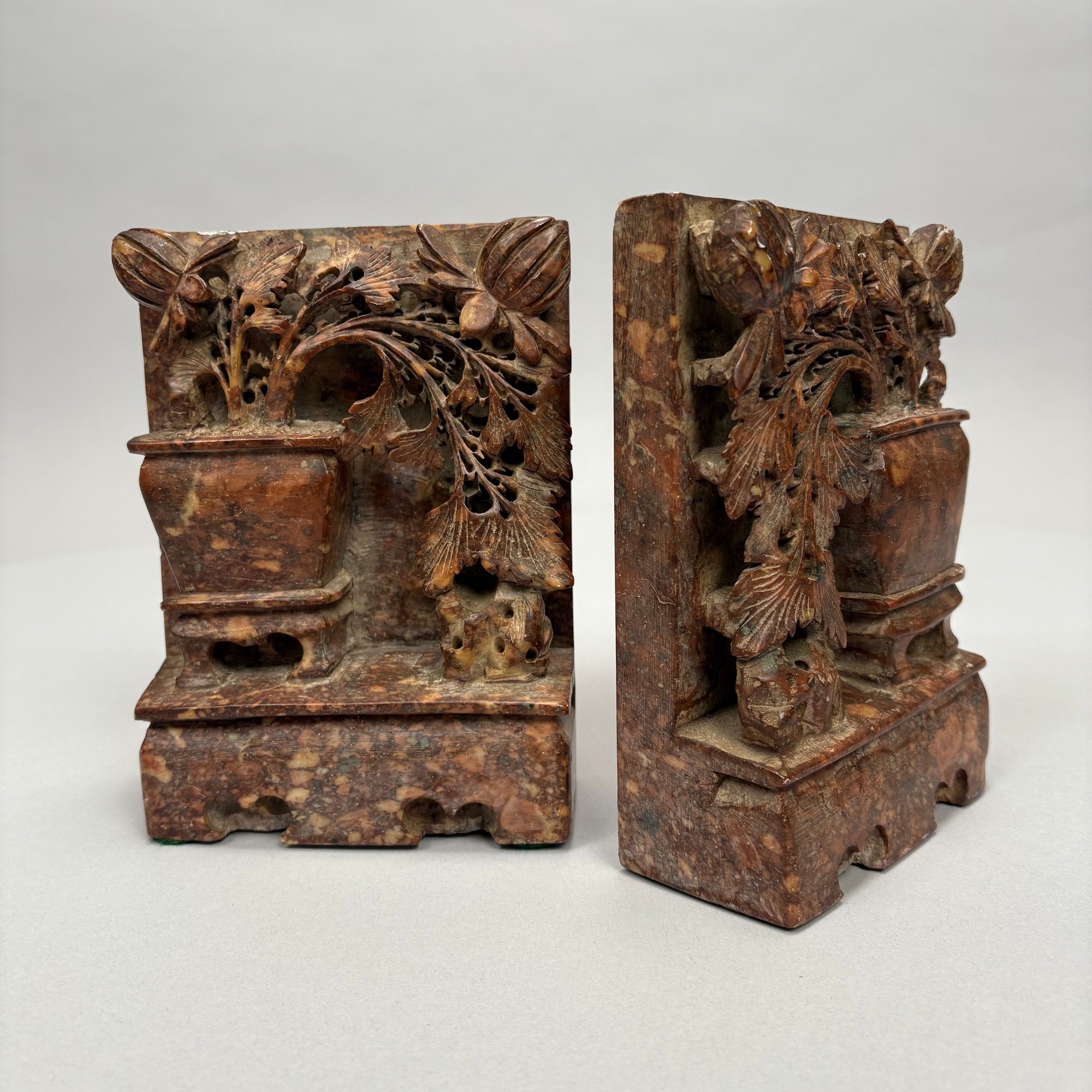 Pair of Chinese Carved Hardstone Bookends. In mottled brown, each carved in relief and pierce-carved with a jardiniere of flowers.