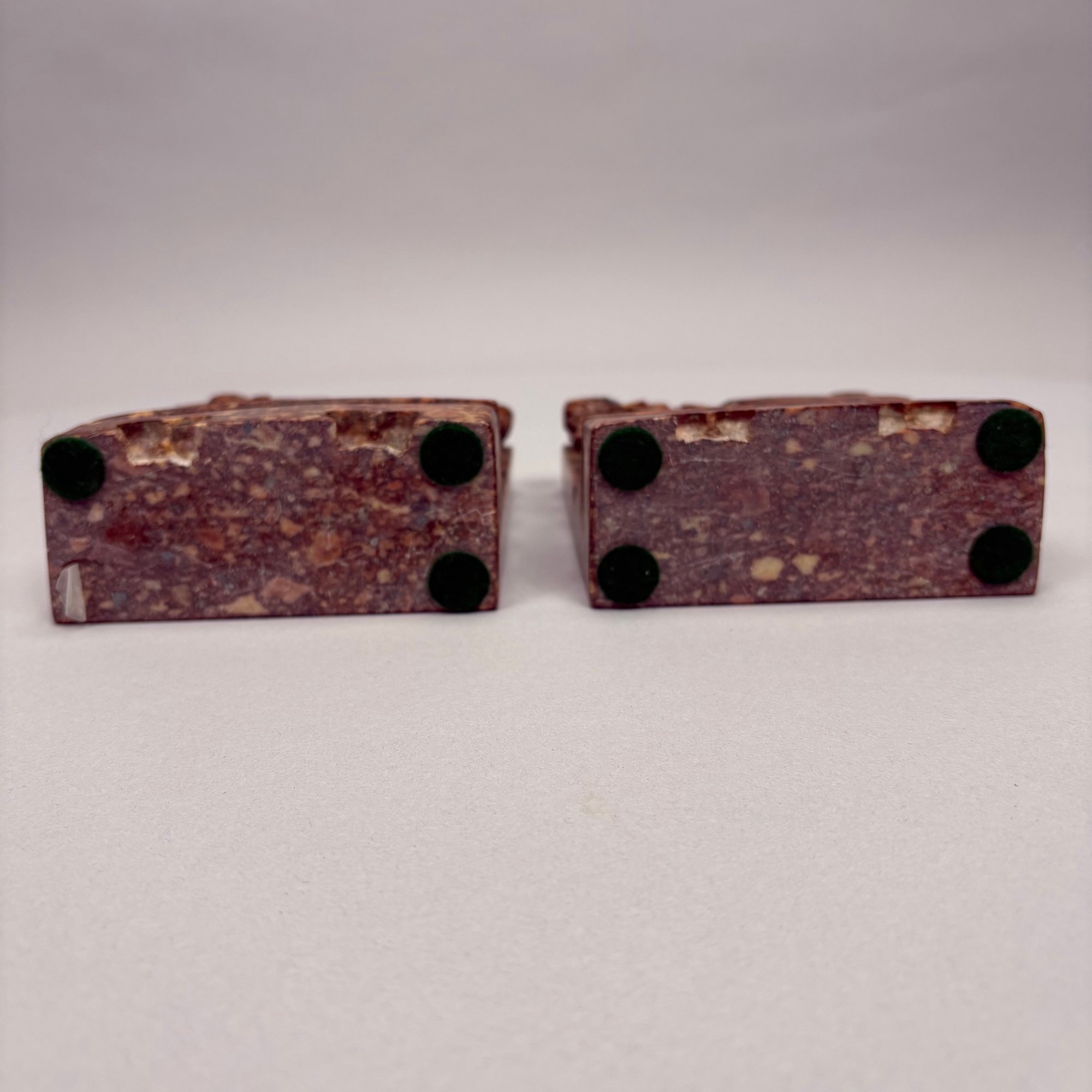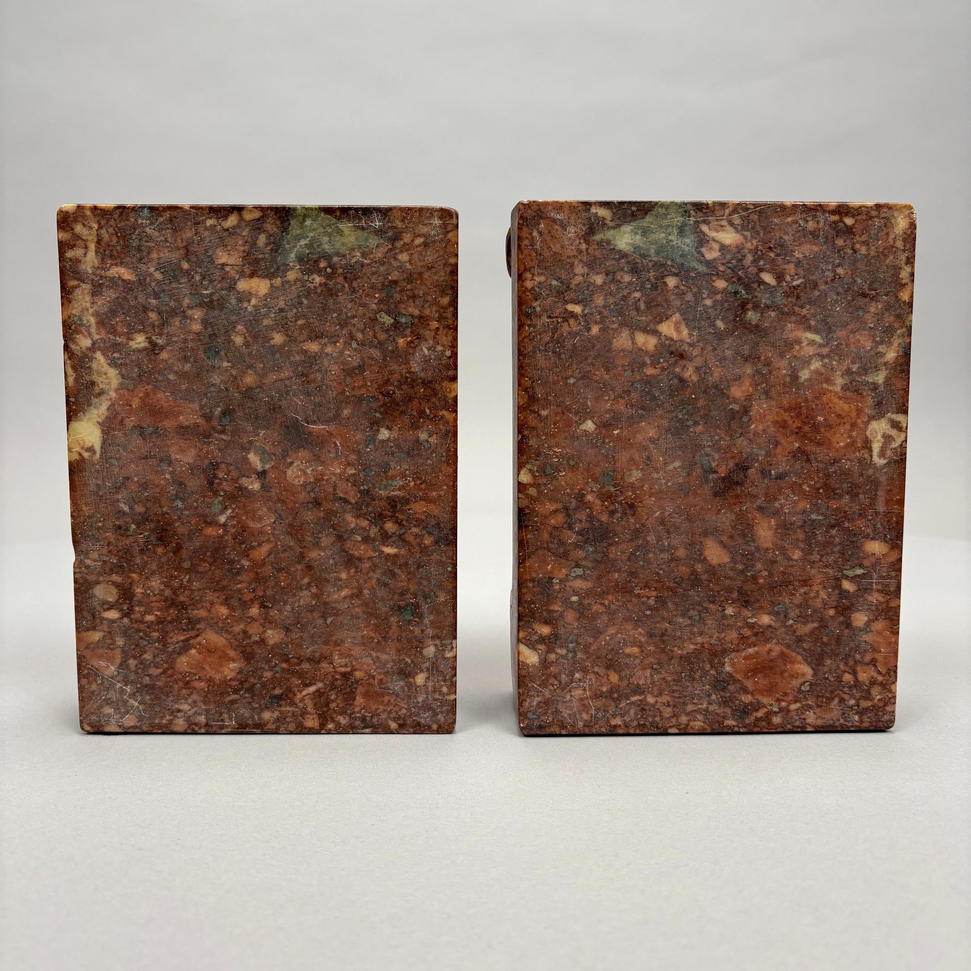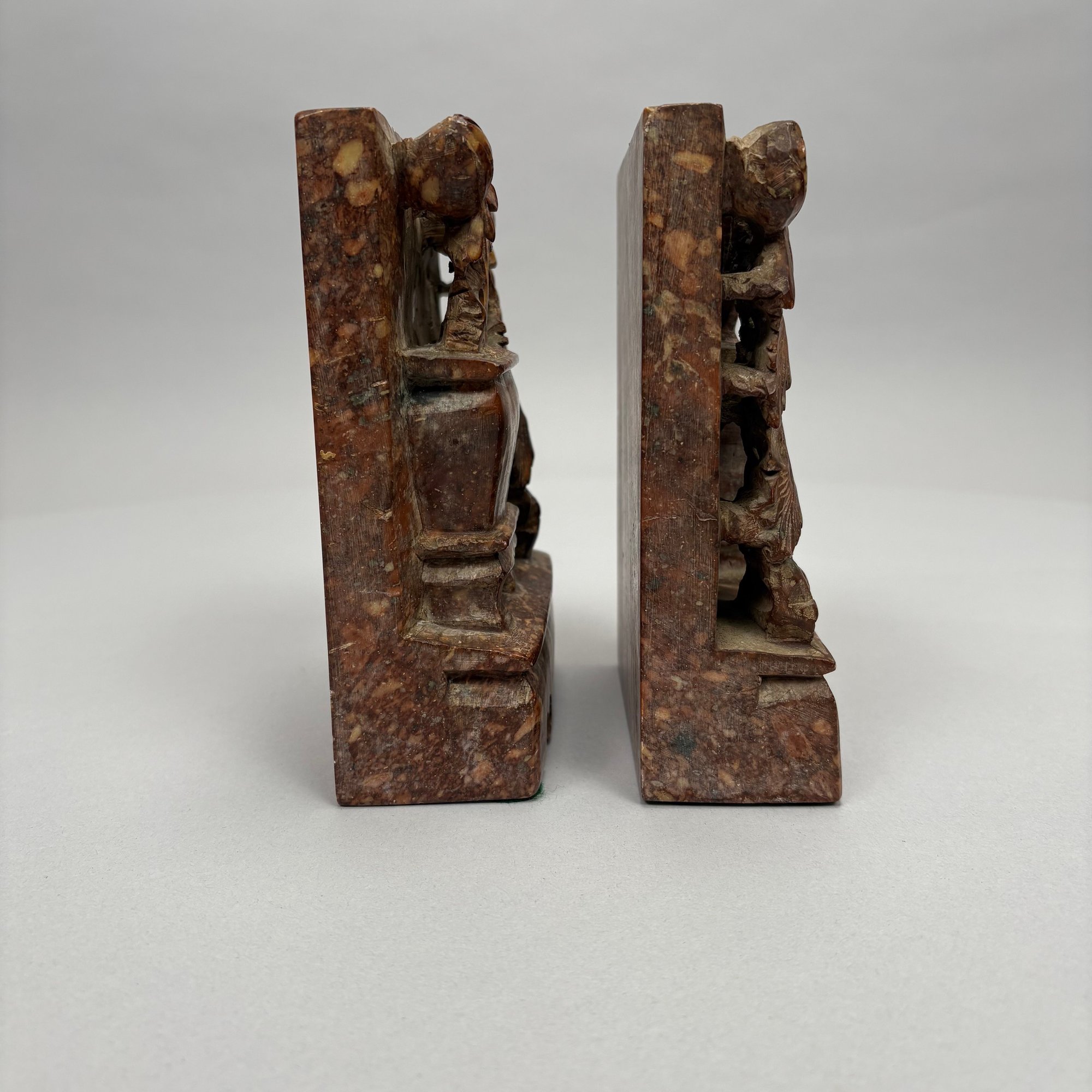 Pair of Chinese Carved Hardstone Bookends. In mottled brown, each carved in relief and pierce-carved with a jardiniere of flowers.