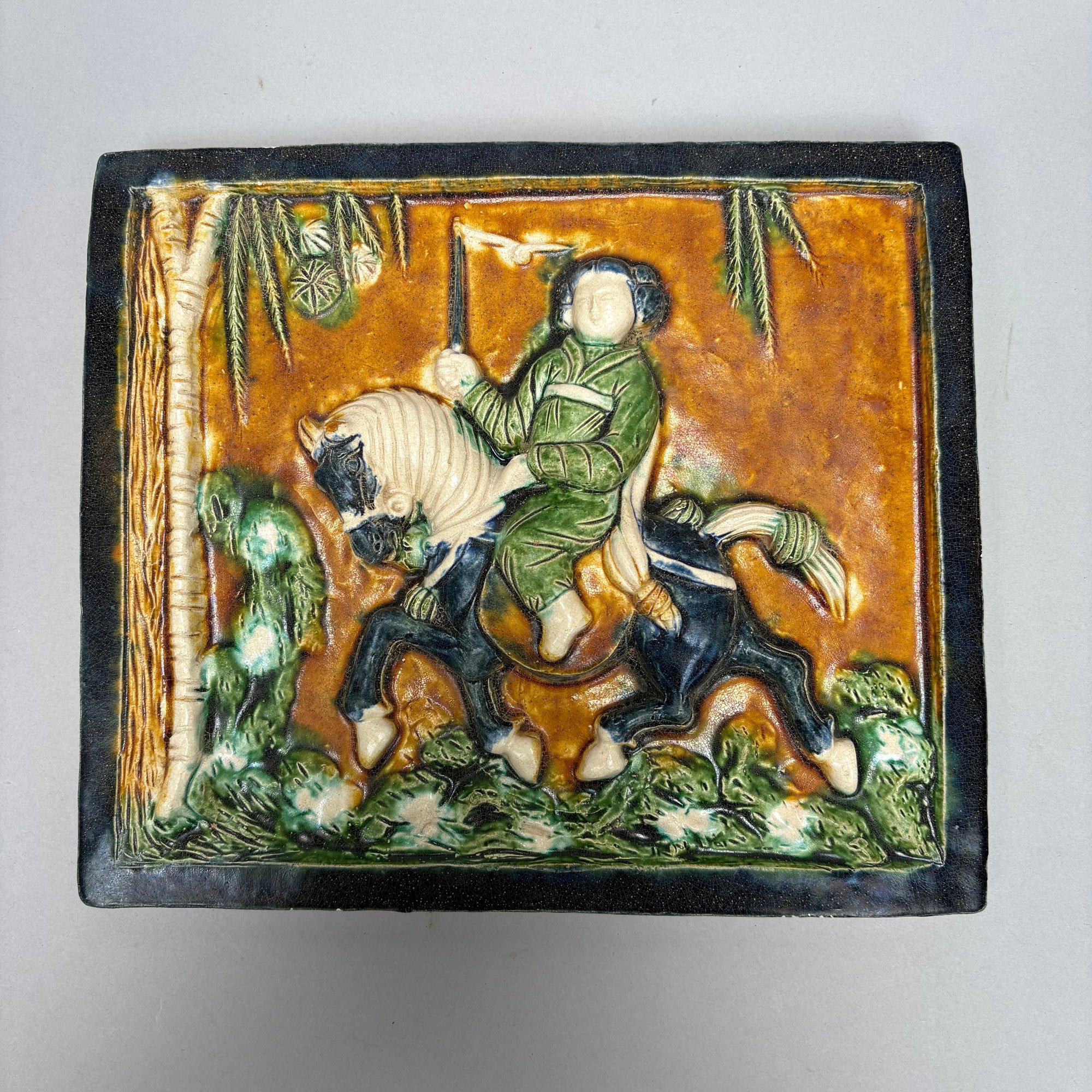 Pair of Chinese Earthenware Sancai-Glazed Plaques and a Modern Silk on Paper Scroll.