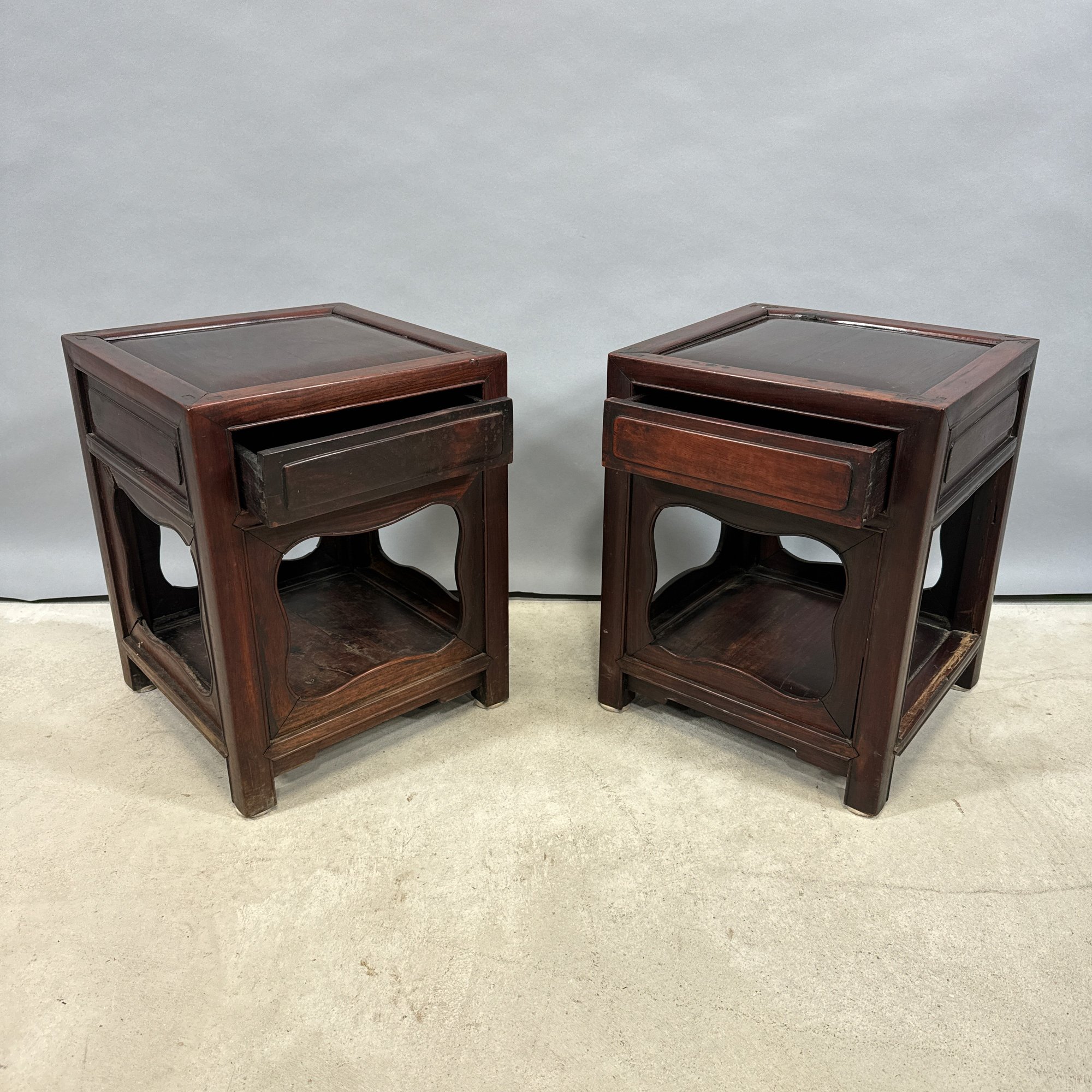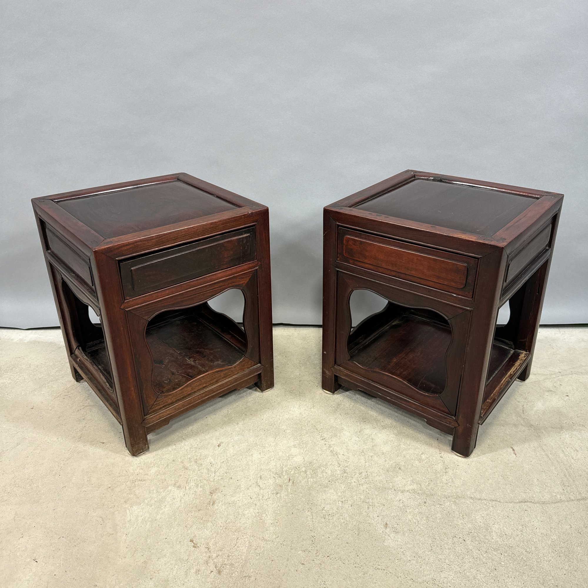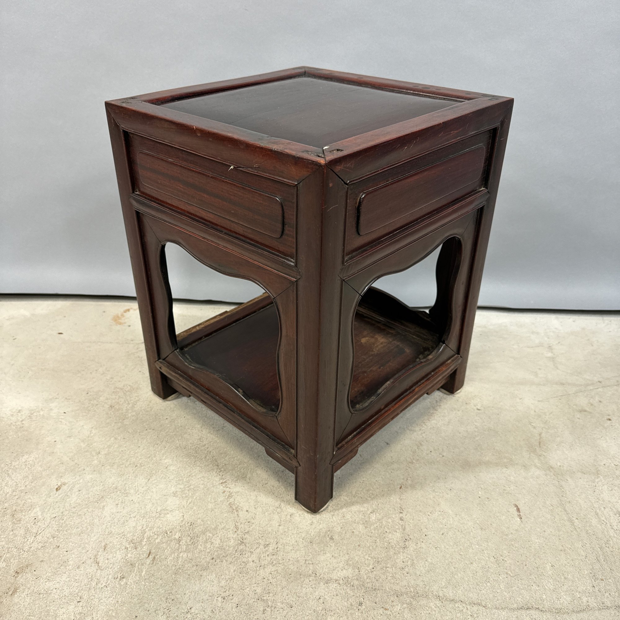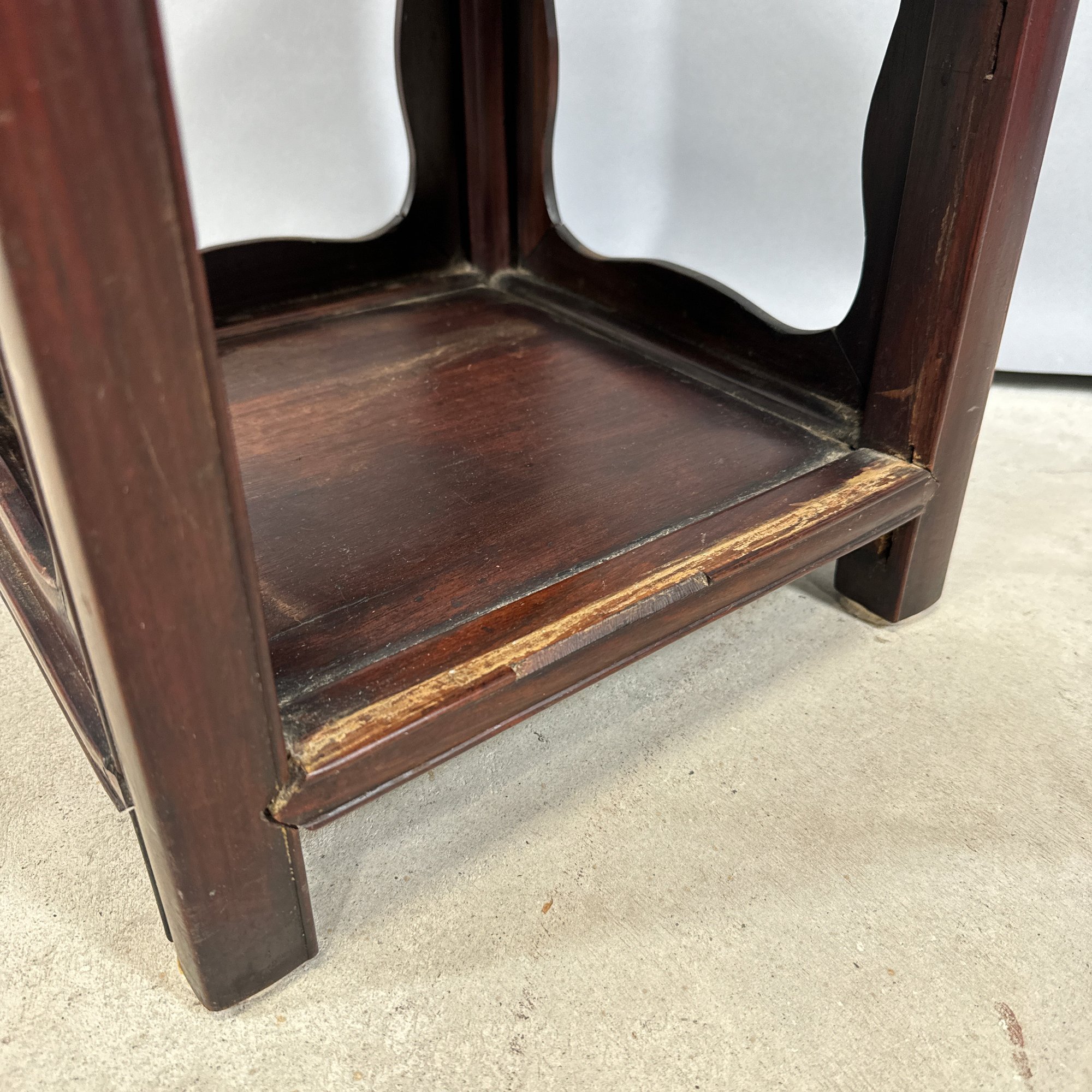 Pair of Chinese Hardwood Stands. Each inset square top above shaped open sides enclosing a shelf.