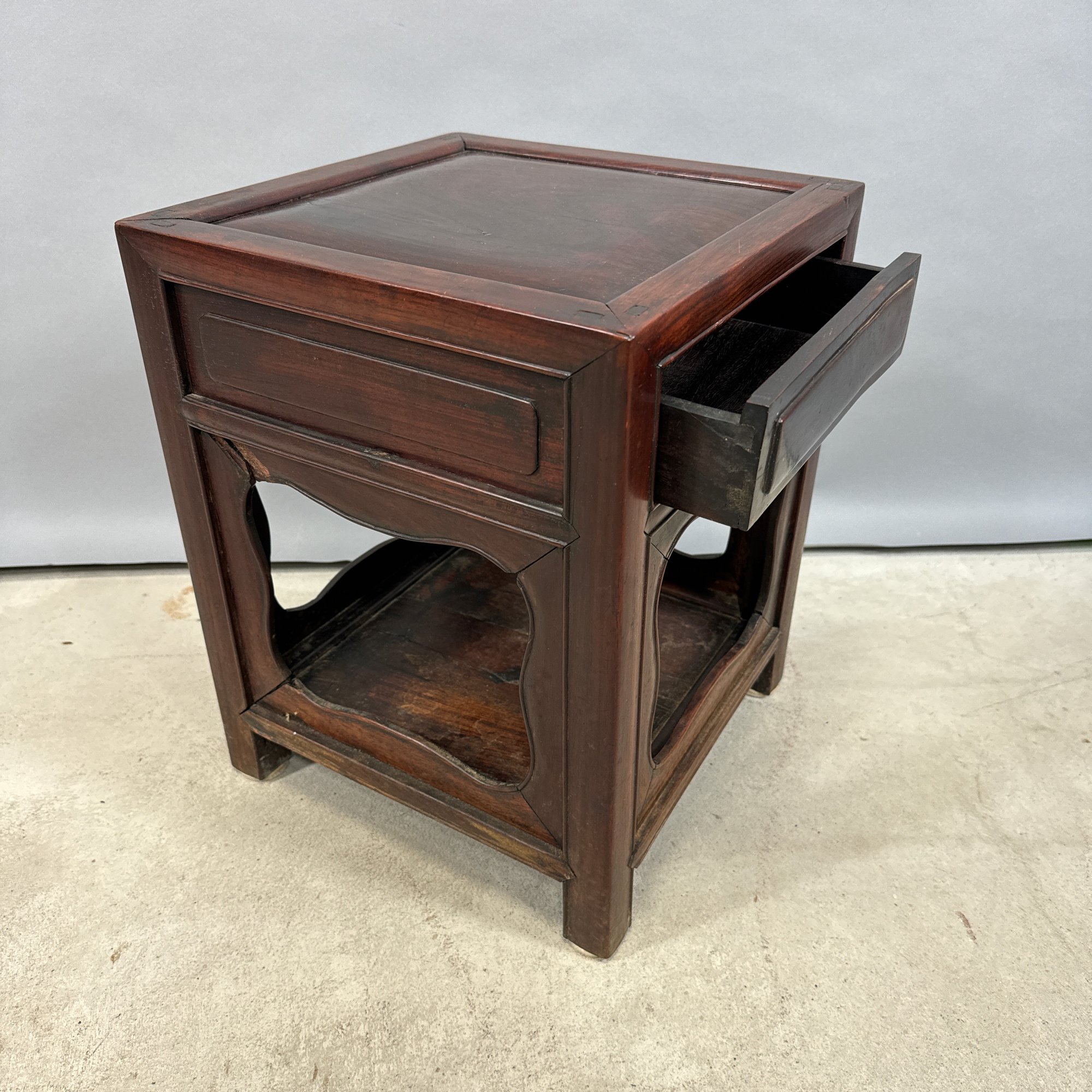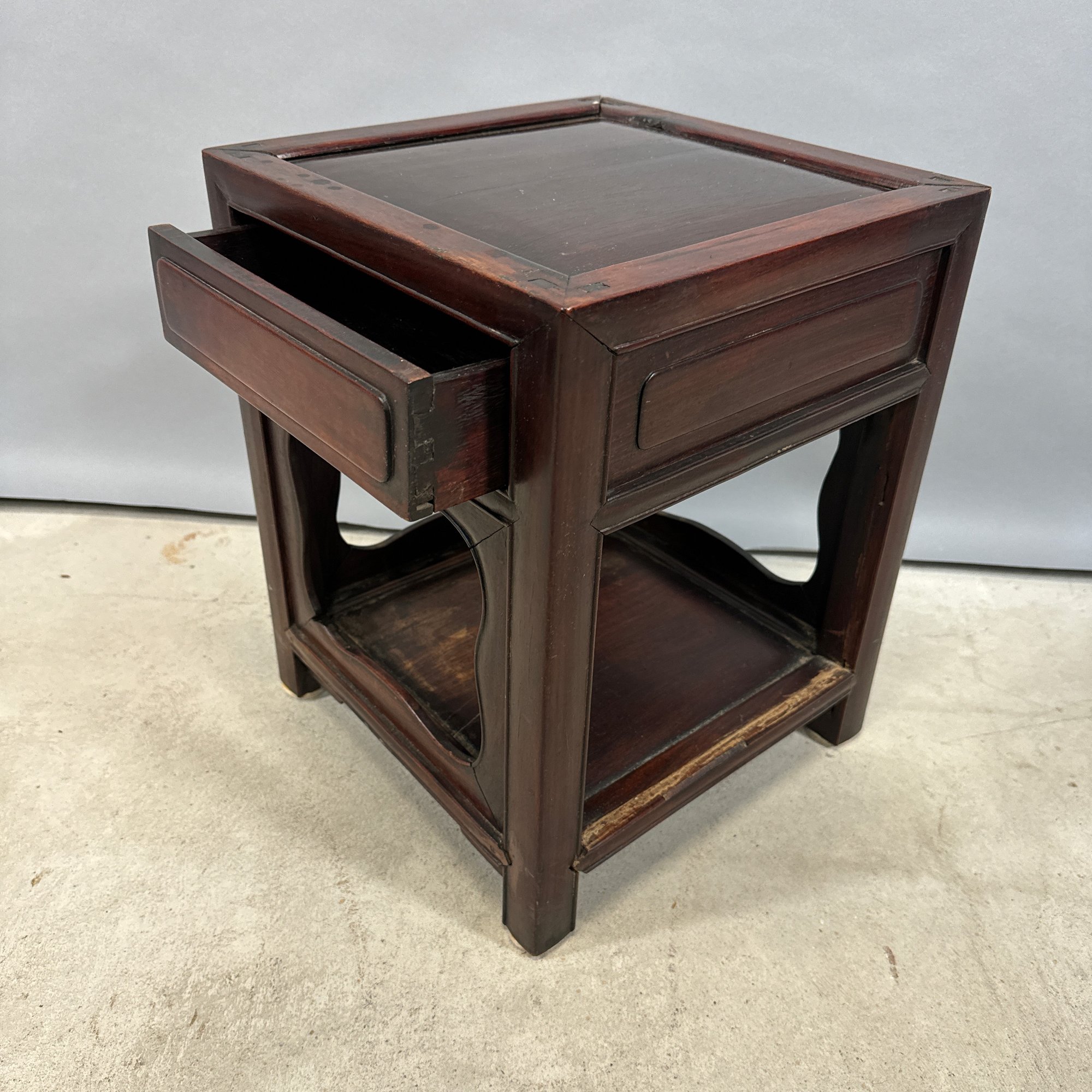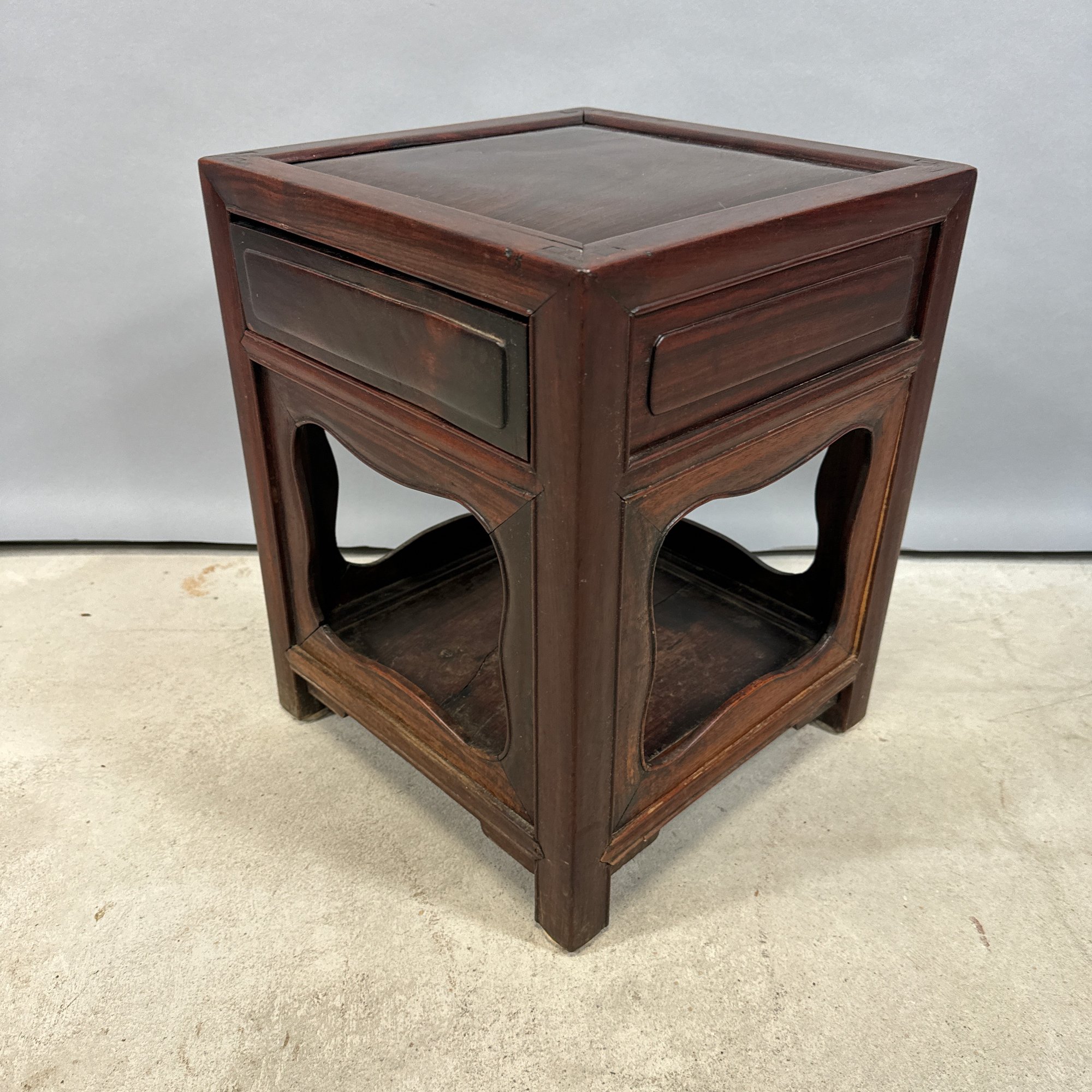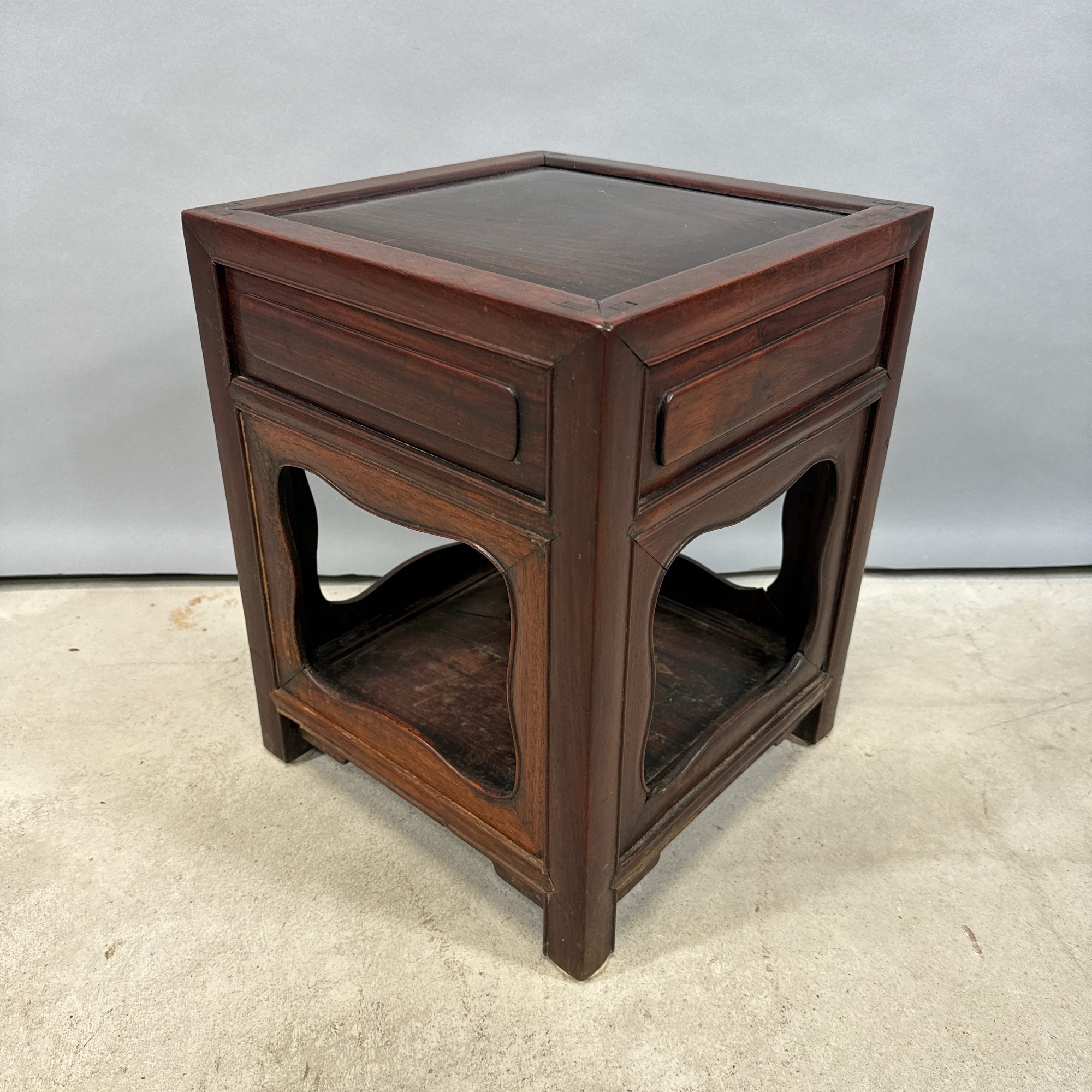 Pair of Chinese Hardwood Stands. Each inset square top above shaped open sides enclosing a shelf.
