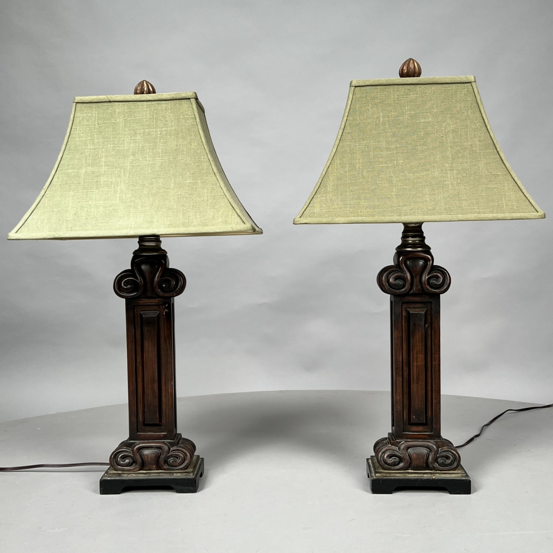 Each molded double-scroll standard fitted with a rectangular flared shade.