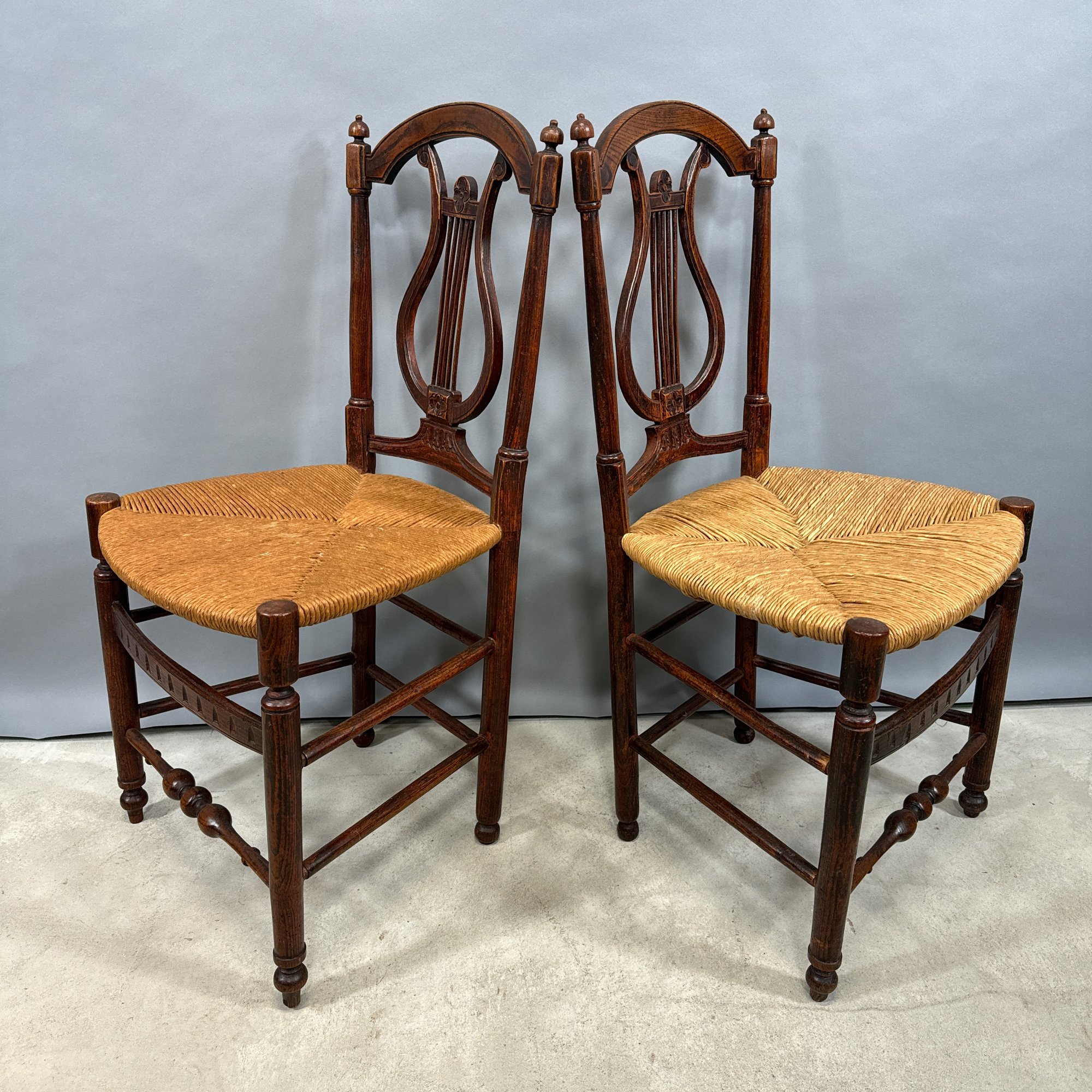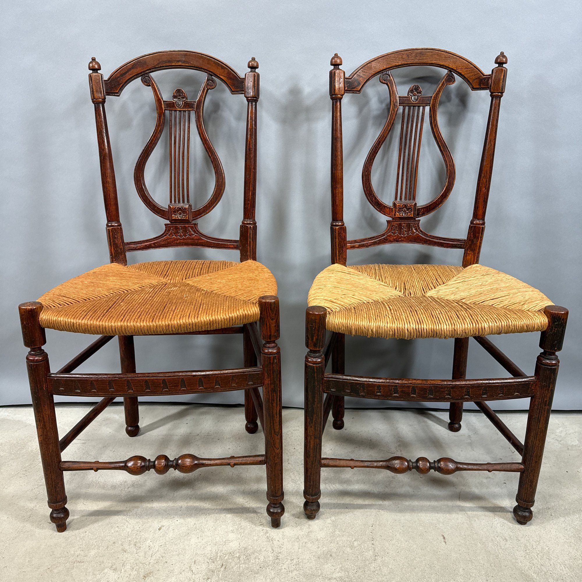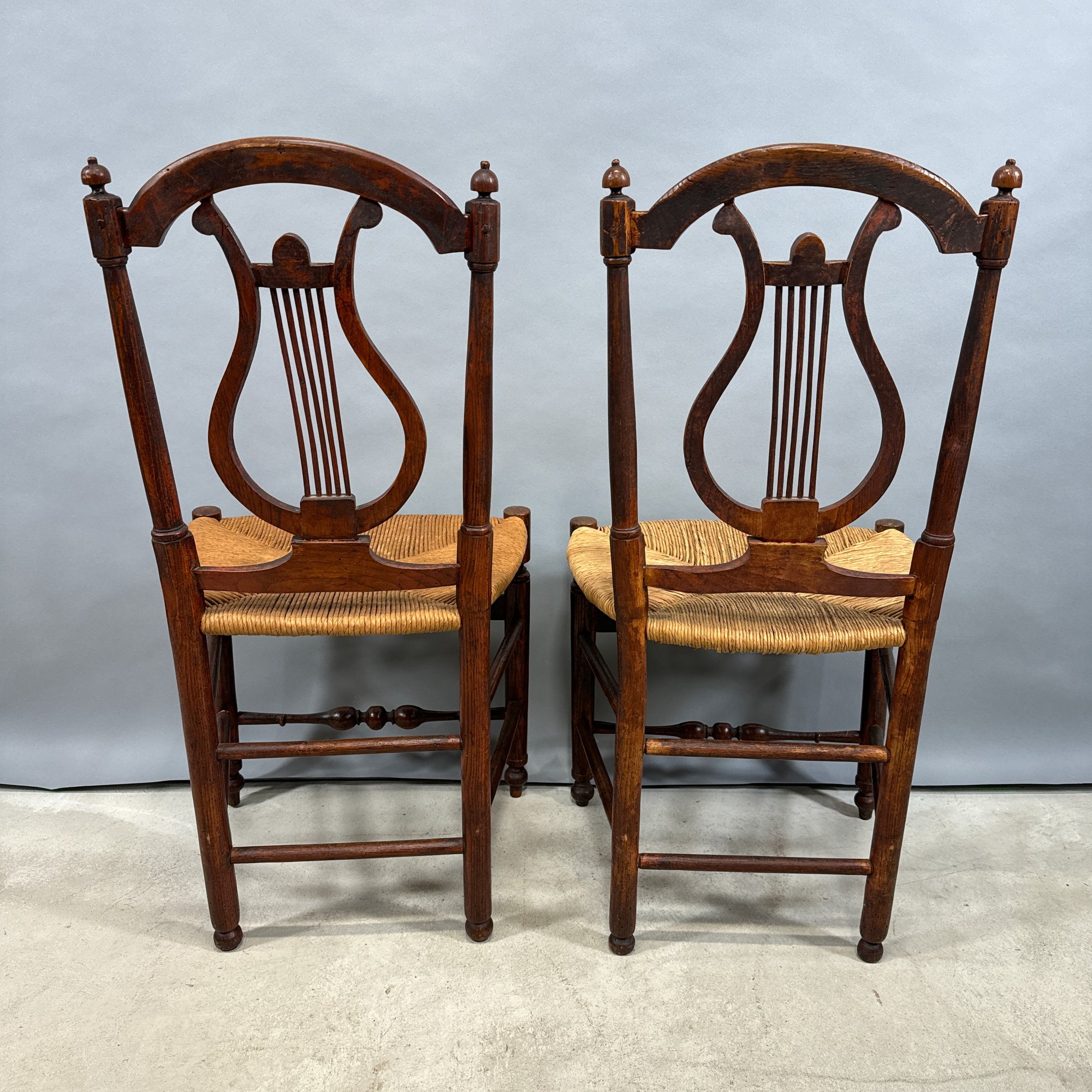 Pair of French Provincial Neoclassical Side Chairs. Each arched crest rail above a lyre splat and rush seat, raised on columnar legs joined by frontal spoon-gouged and turned stretchers.