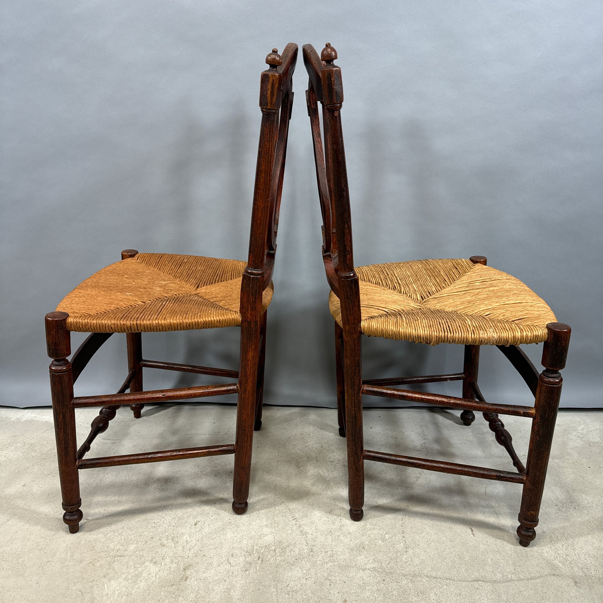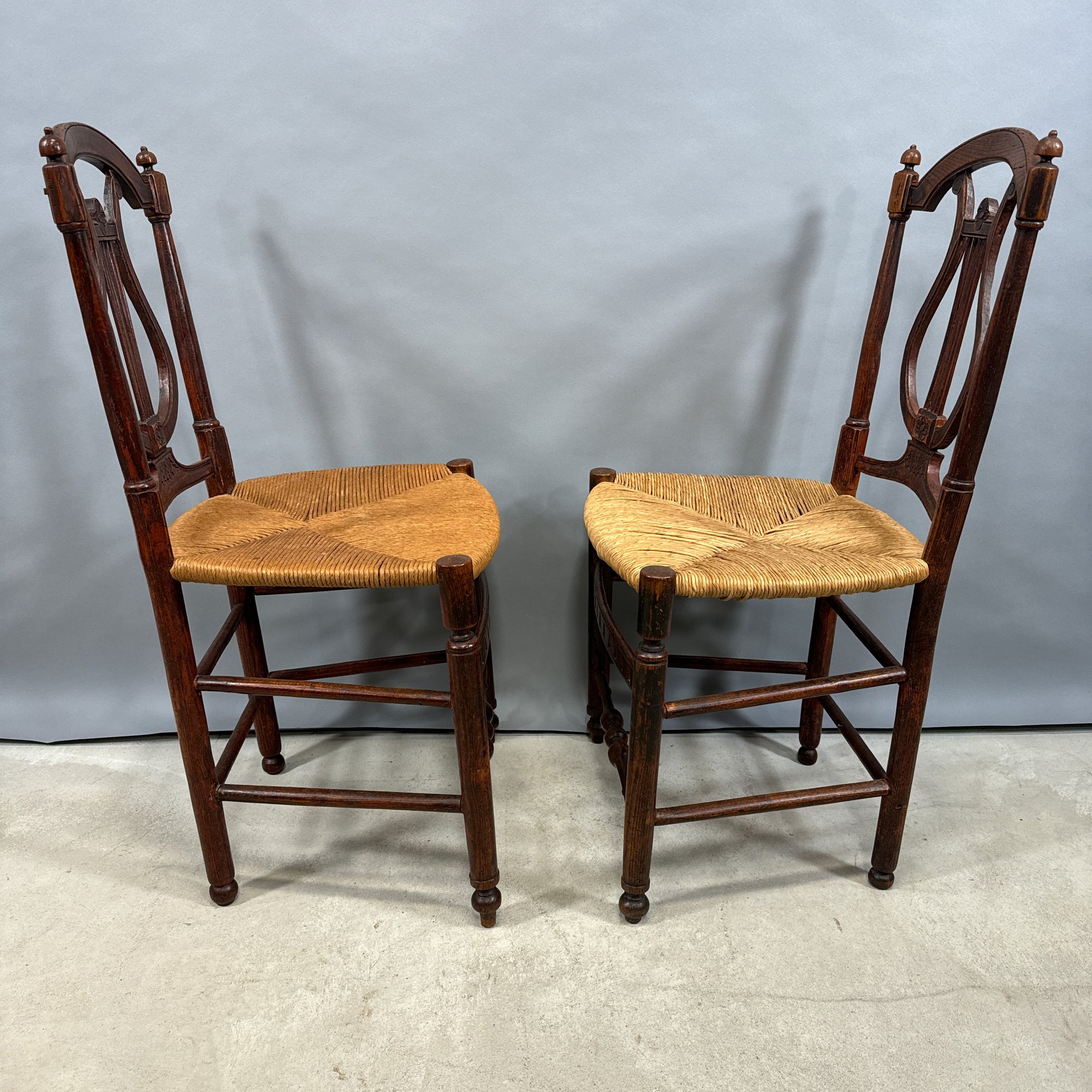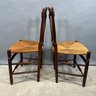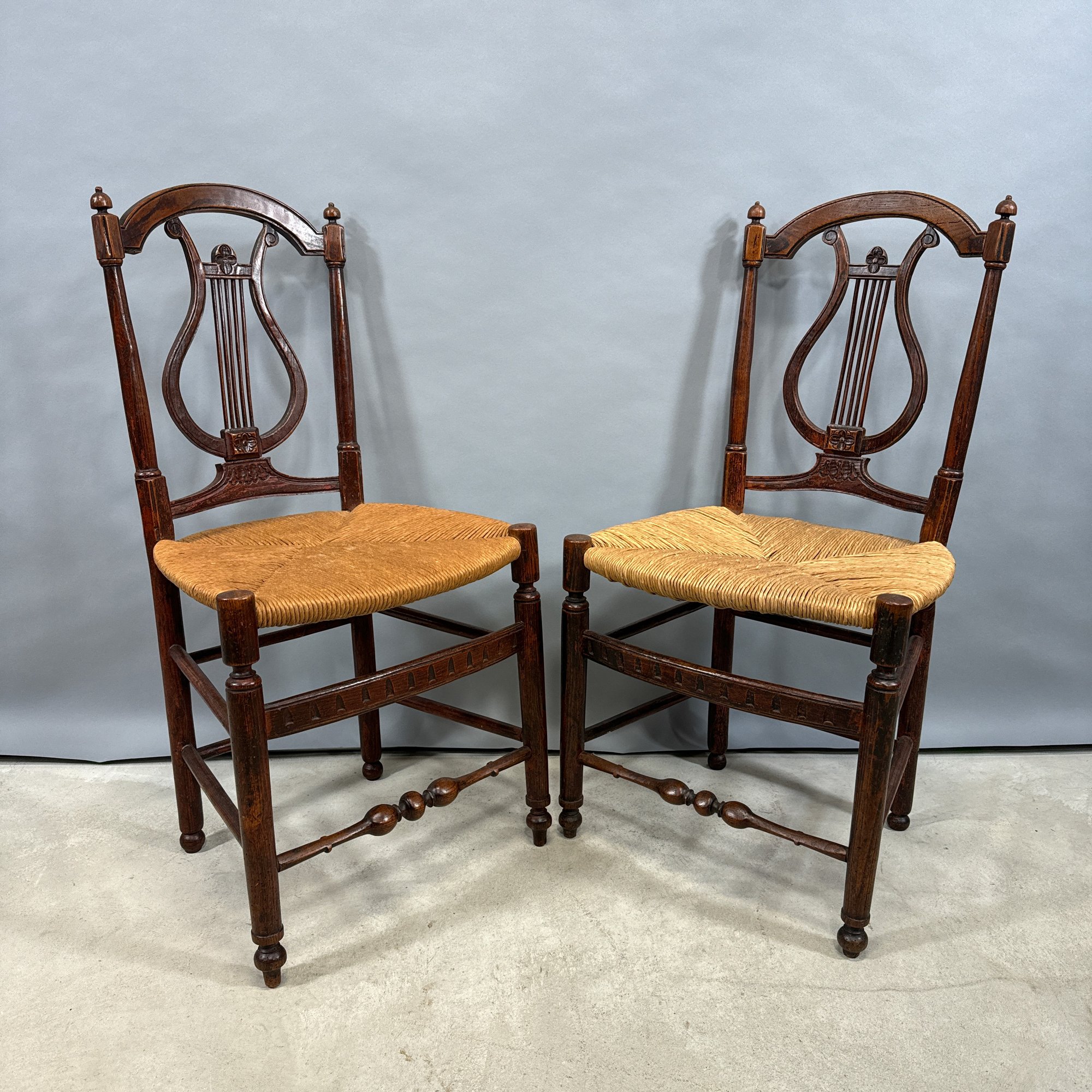 Pair of French Provincial Neoclassical Side Chairs. Each arched crest rail above a lyre splat and rush seat, raised on columnar legs joined by frontal spoon-gouged and turned stretchers.