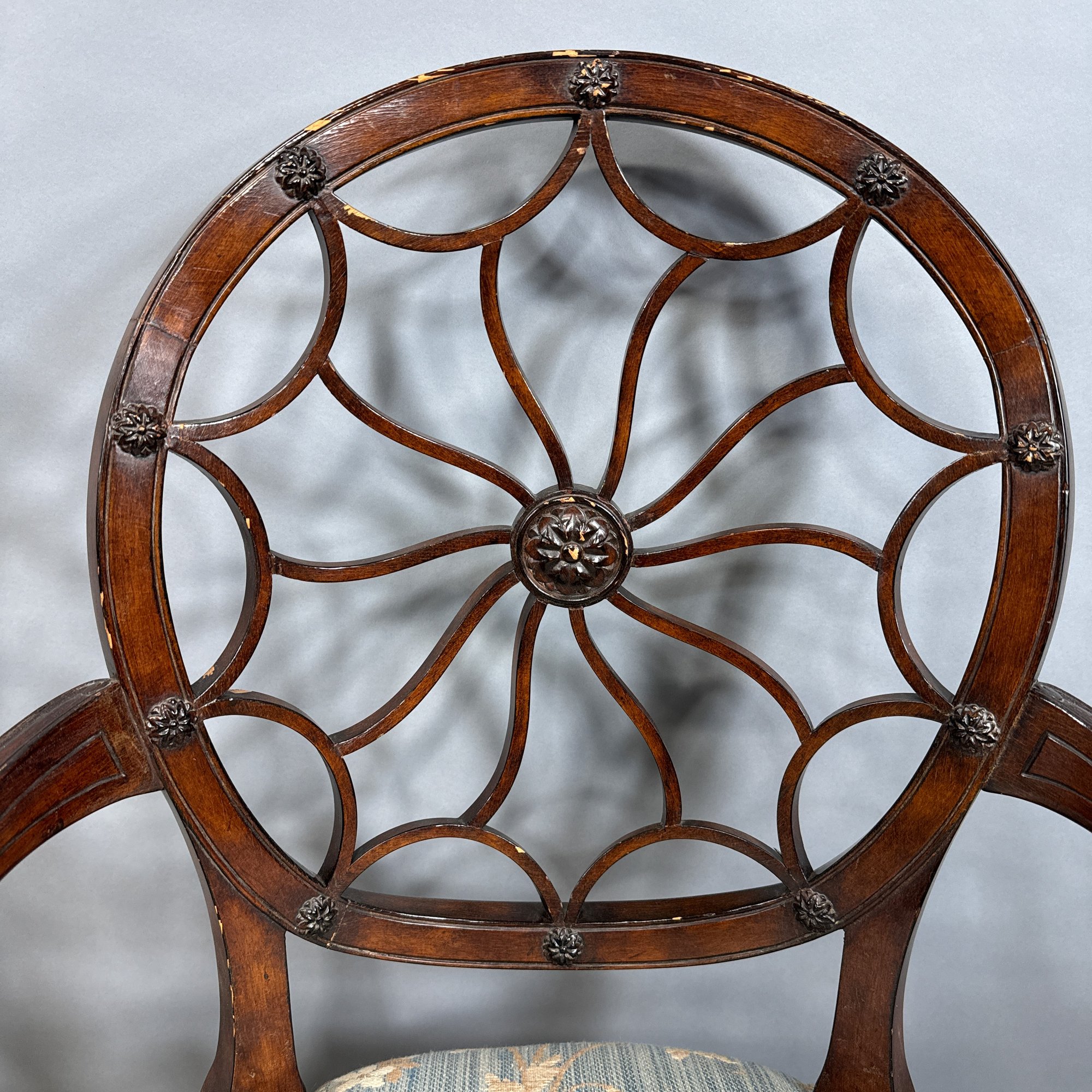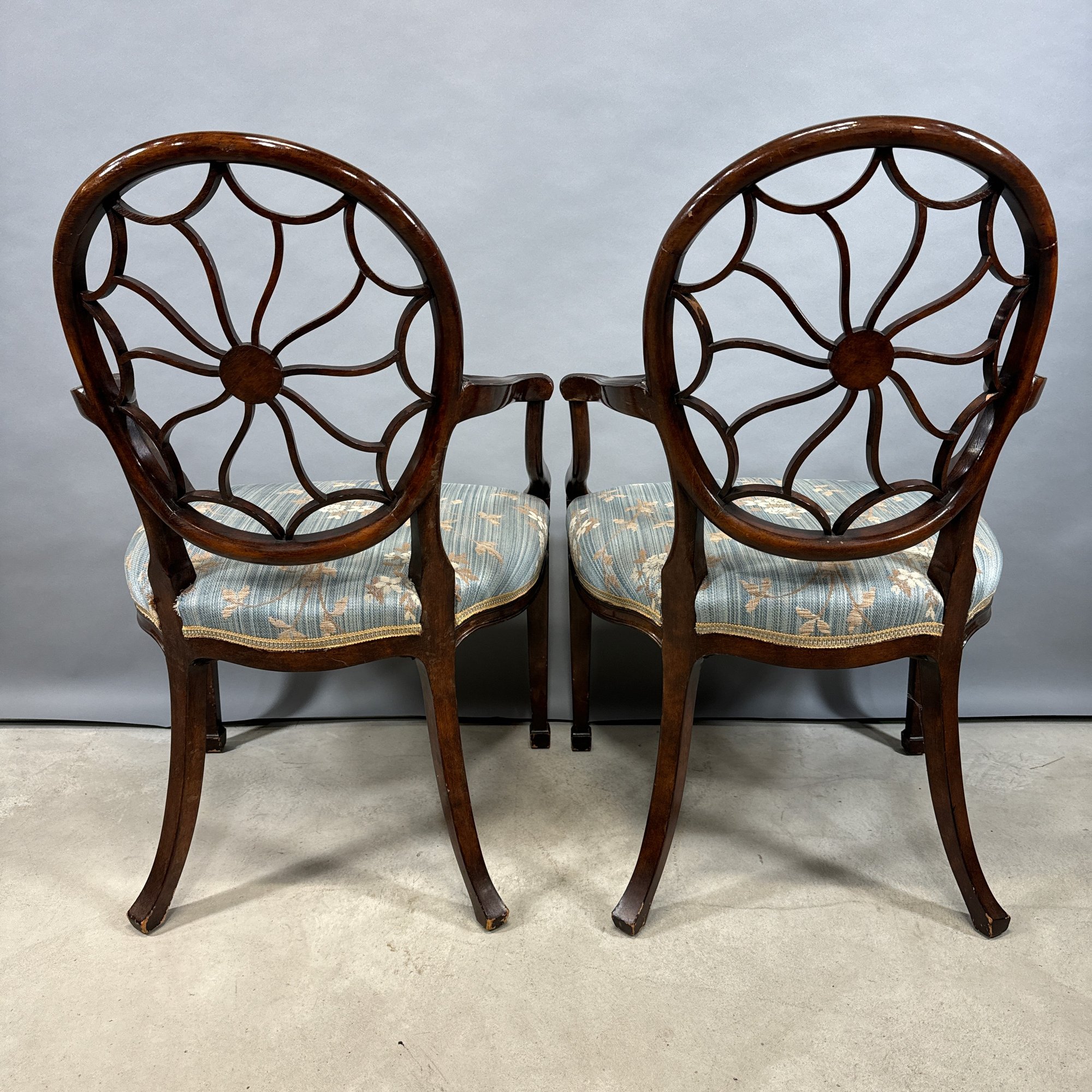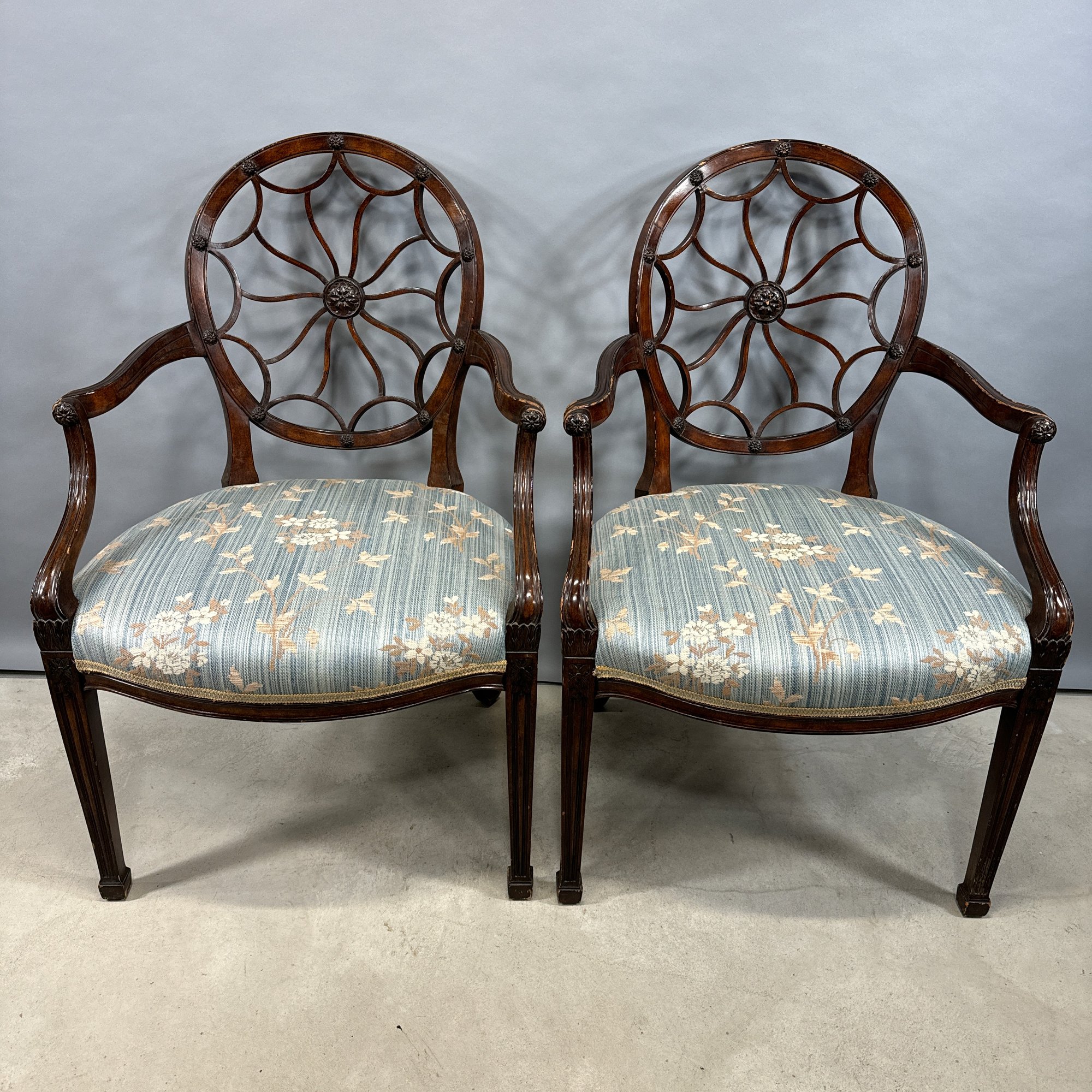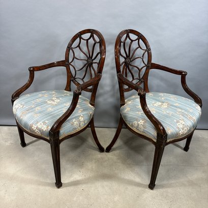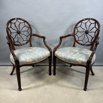 Pair of Hepplewhite Style Mahogany Armchairs, Maitland Smith. Each scalloped and spiraled wheel back centered with a rosette and the frame applied with matching rosettes, above molded out-scrolled arms and downswept supports, the over-upholstered seat raised on molded frontal legs ending in cuff feet.