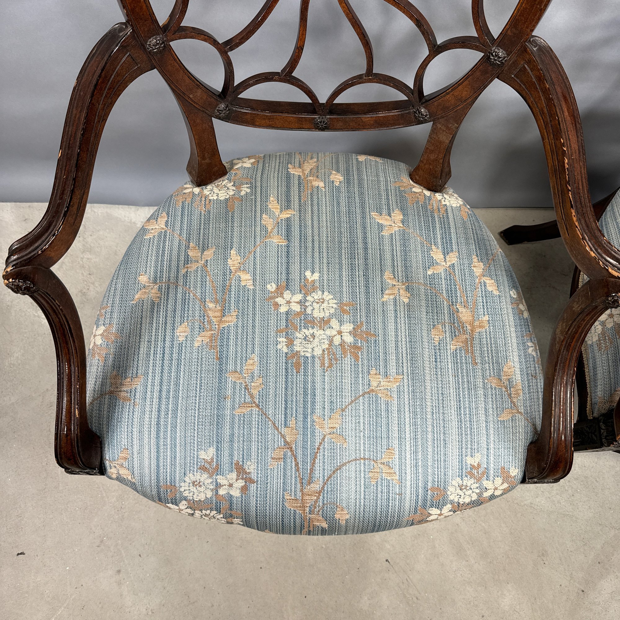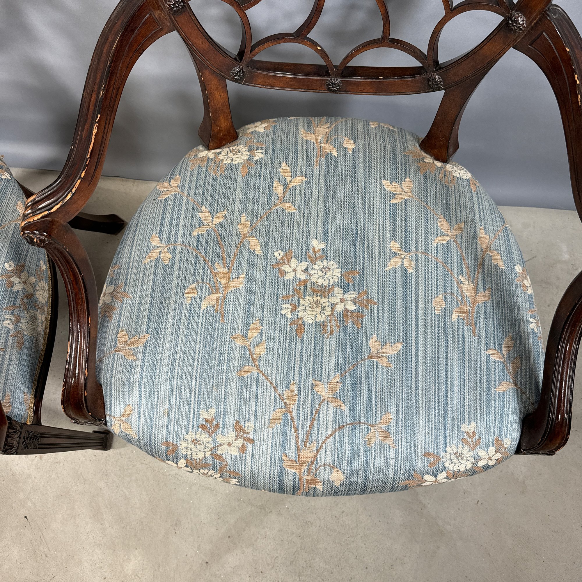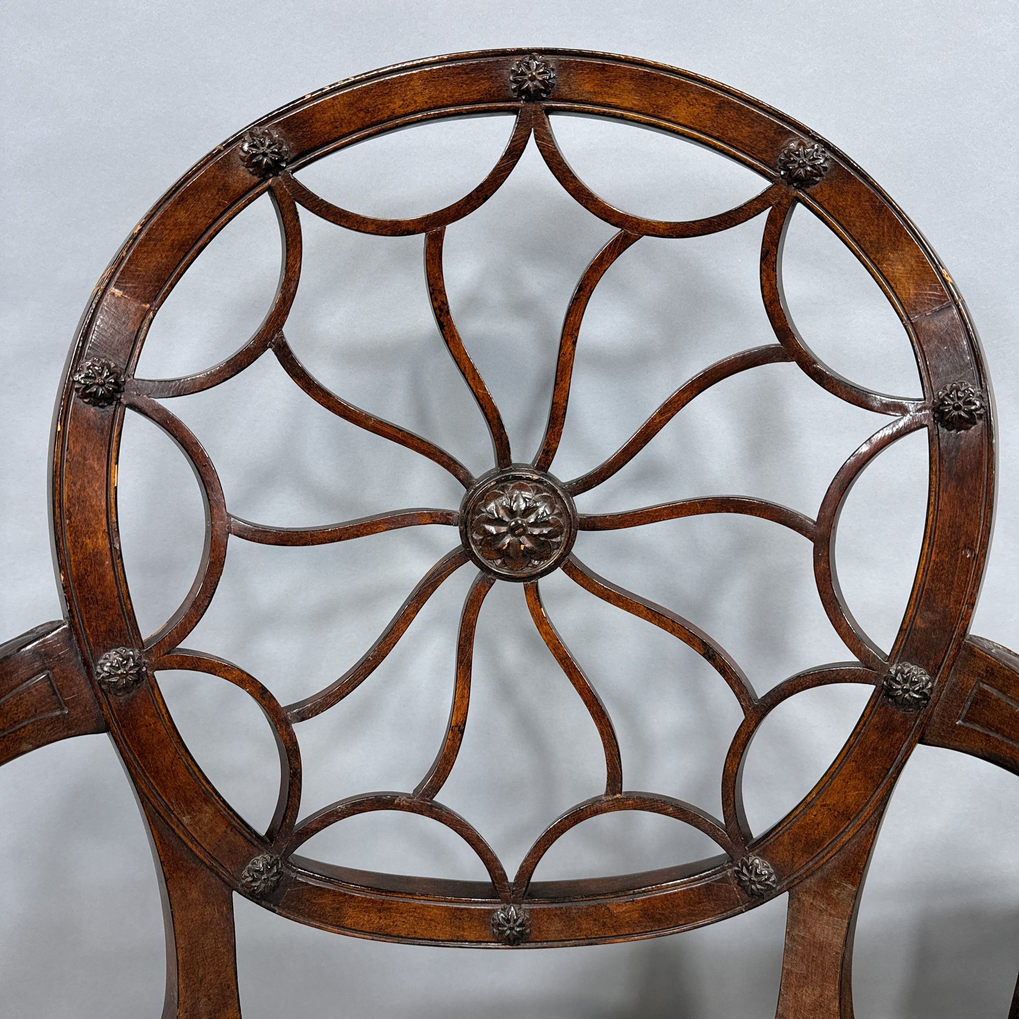 Pair of Hepplewhite Style Mahogany Armchairs, Maitland Smith. Each scalloped and spiraled wheel back centered with a rosette and the frame applied with matching rosettes, above molded out-scrolled arms and downswept supports, the over-upholstered seat raised on molded frontal legs ending in cuff feet.