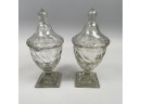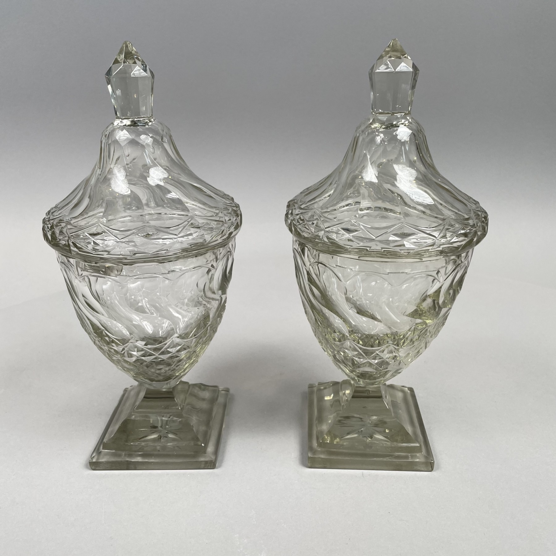 Each of urn form, cut in swirled panel, faceted diamond and lozenge patterned rows, on a stepped square base.