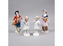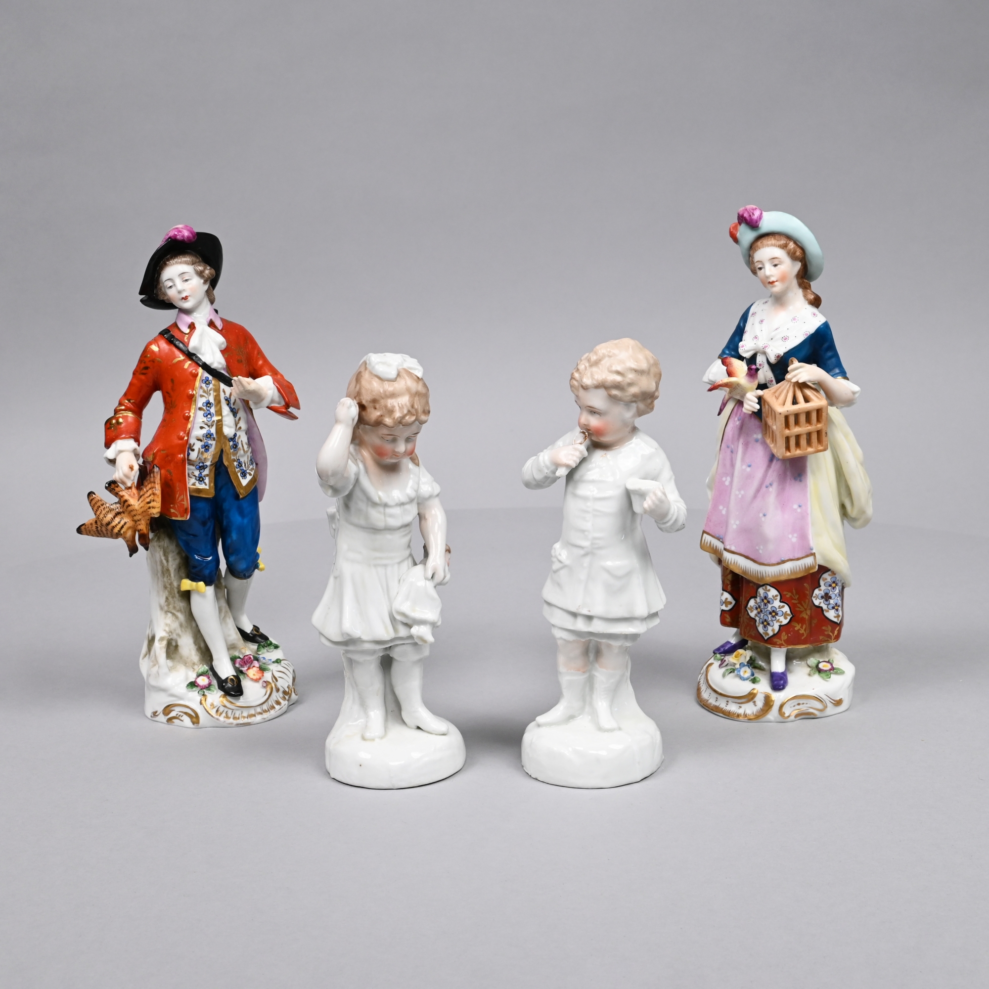 The pair probably Edme Samson, late nineteenth century, and in the style of 18th-century Chelsea, modelled as a huntsman with game and his companion allegorical of 'Fidelity,' a bird perched on her wrist and holding a birdcage, each with gold anchor mark on the back of the base, she impressed with the numeral "4;" the pair of children late nineteenth-early twentieth century, modeled as a girl spanking her doll and a boy eating porridge, she with impressed circle mark, both with painted parallel orange lines. Height of 'Fidelity:' 9.5 in., W: 4 in., D:3.75 in. Height of girl: 7.5 in., W: 3 in., D: 2.75 in.