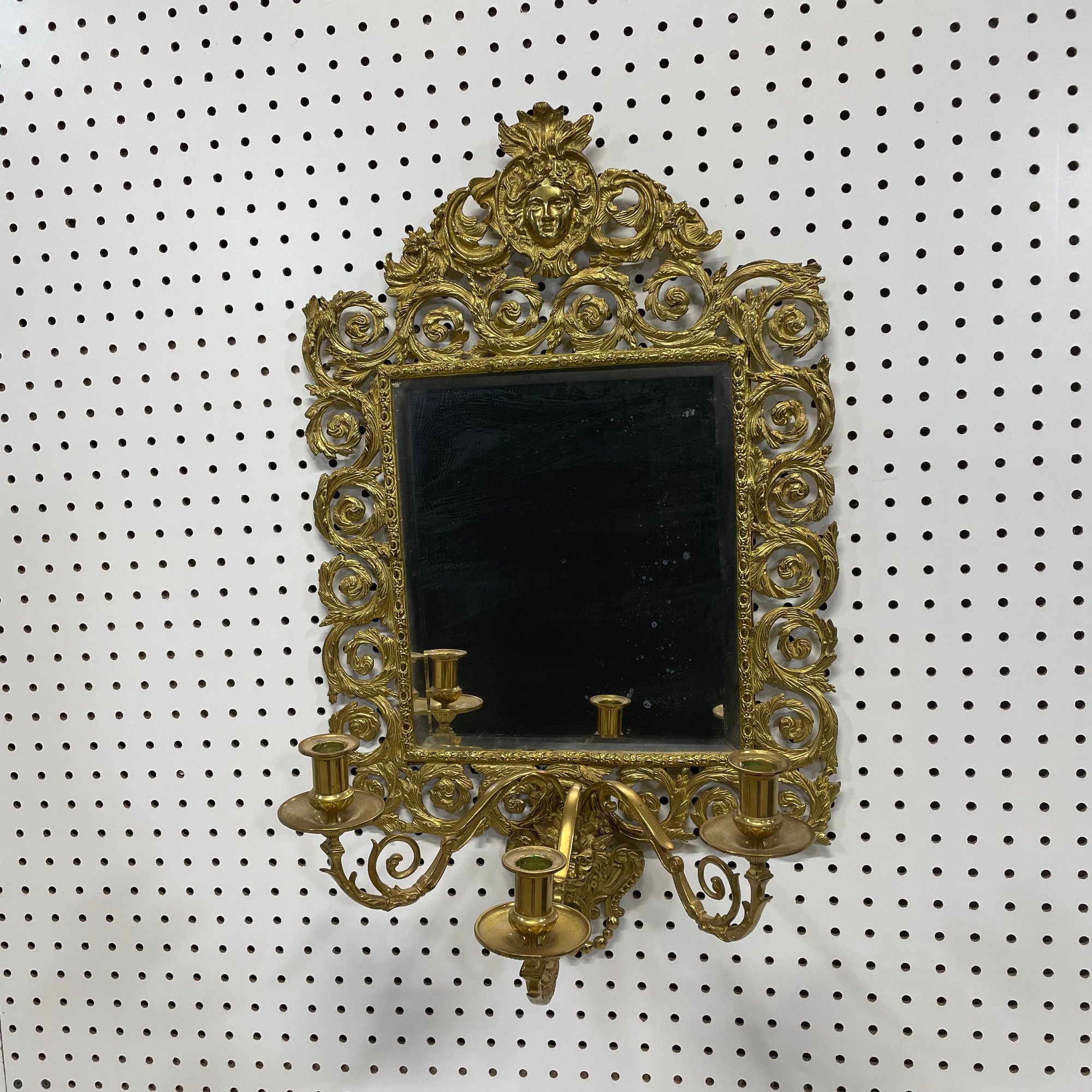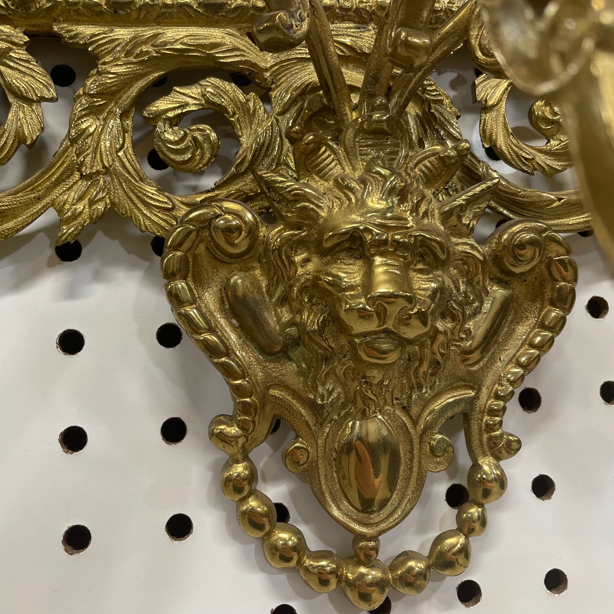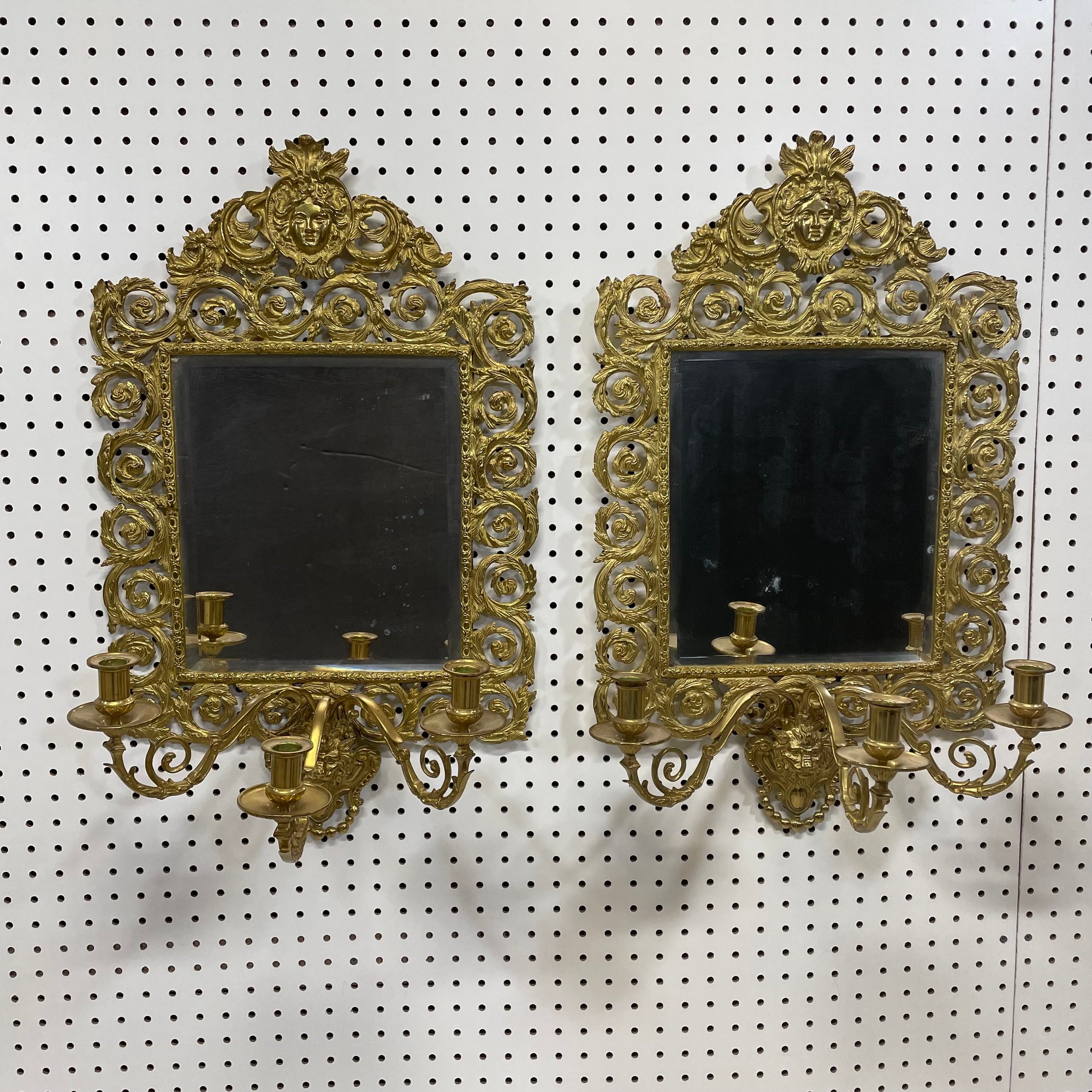 Pair of Renaissance Revival Style Cast and Pierced Brass Three-Light Girandoles, Twentieth Century.