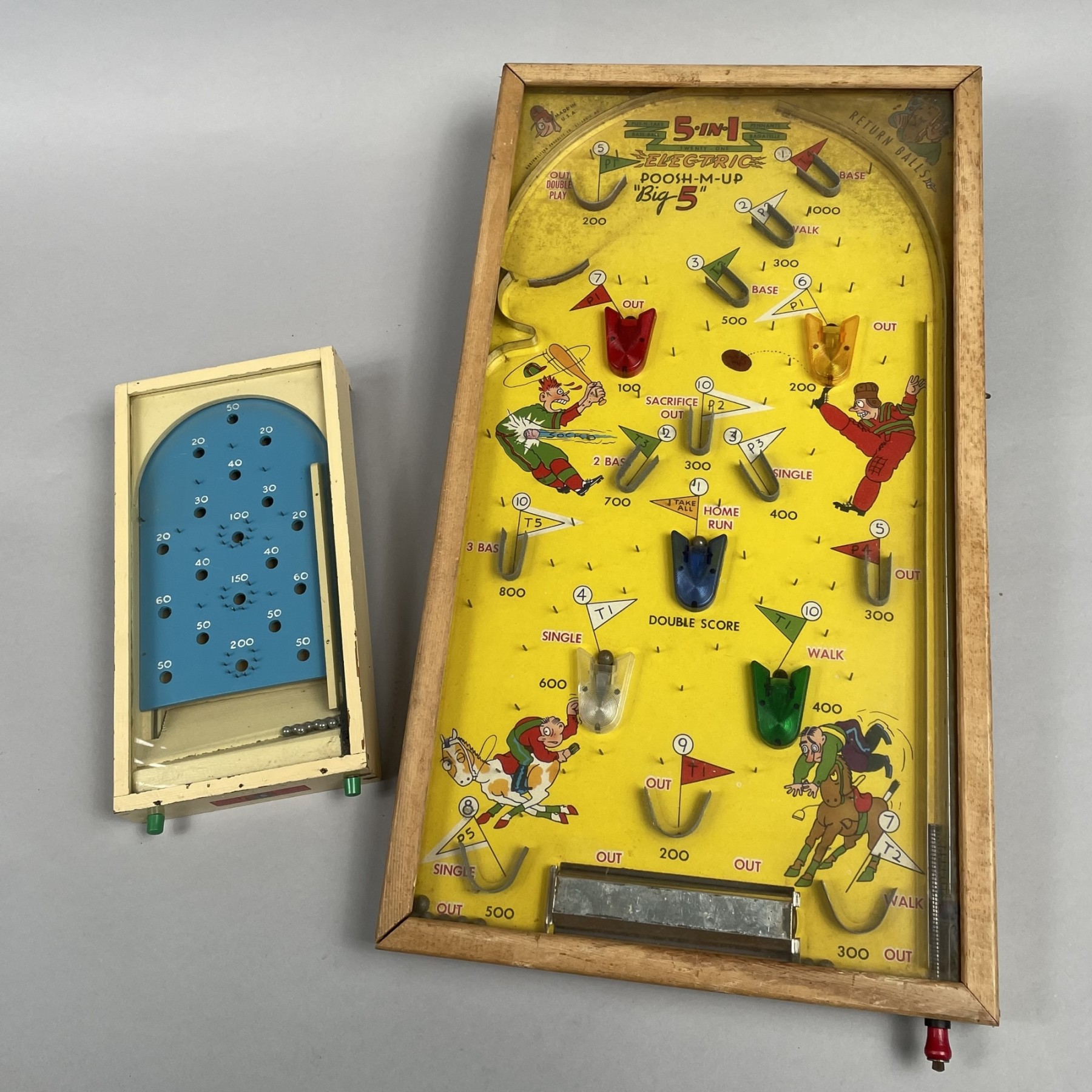 The first a "5-in-1 ELECTRIC POOSH-M-UP BIG 5" game with steel balls, Northwestern Products Co., St. Louis, MO." and a hand-held pinball game with steel balls, factory mark printed with the royal coat-of-arms flanked by "THE CHAD VALLEY CO., LTD., HARBORNE, ENGLAND" and 'BY APPOINTMENT TOYMAKERS TO H.M. THE QUEEN."