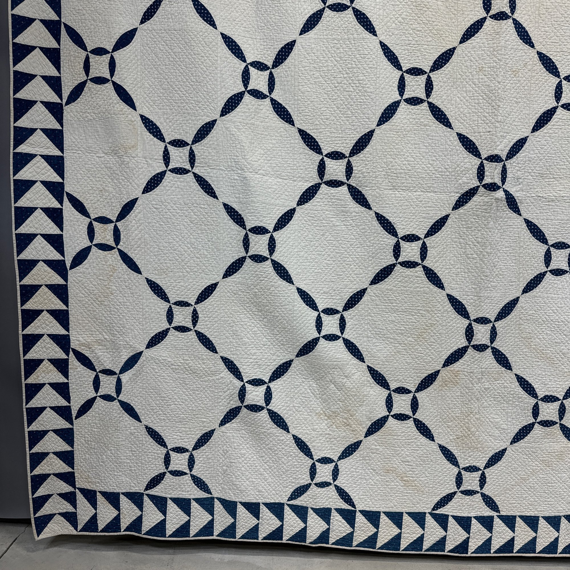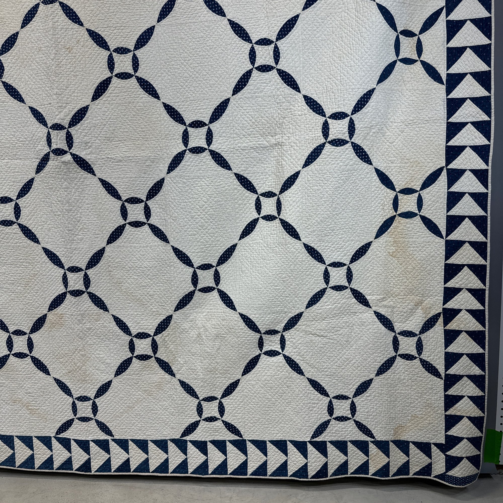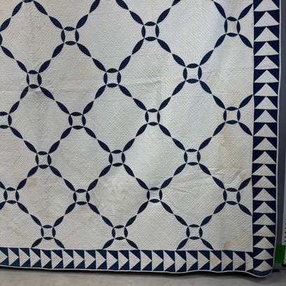 American Blue and White Cotton Piece Work Quilt. Worked in a variant 'Orange Peel' pattern within triangle borders.
