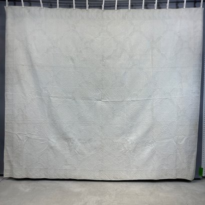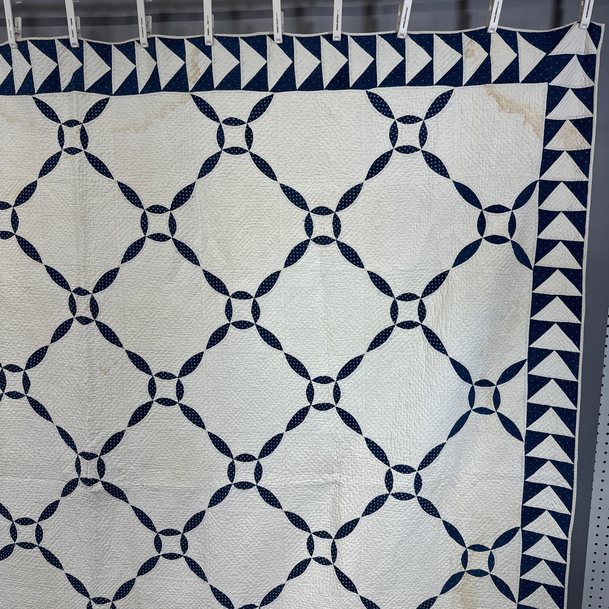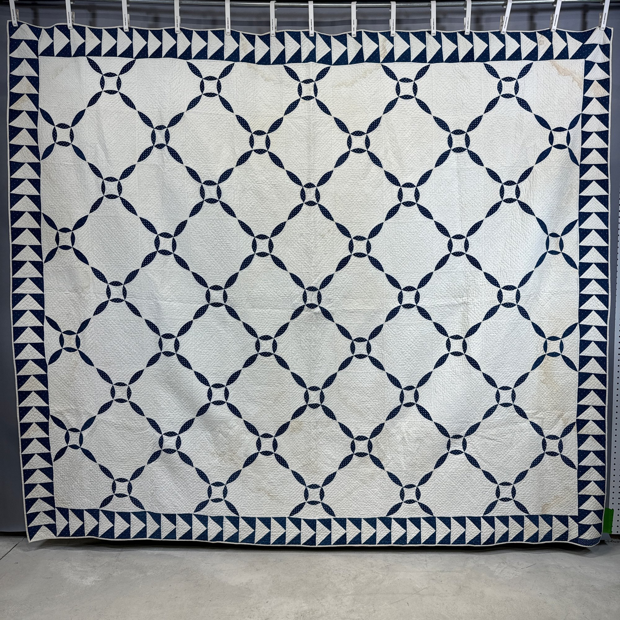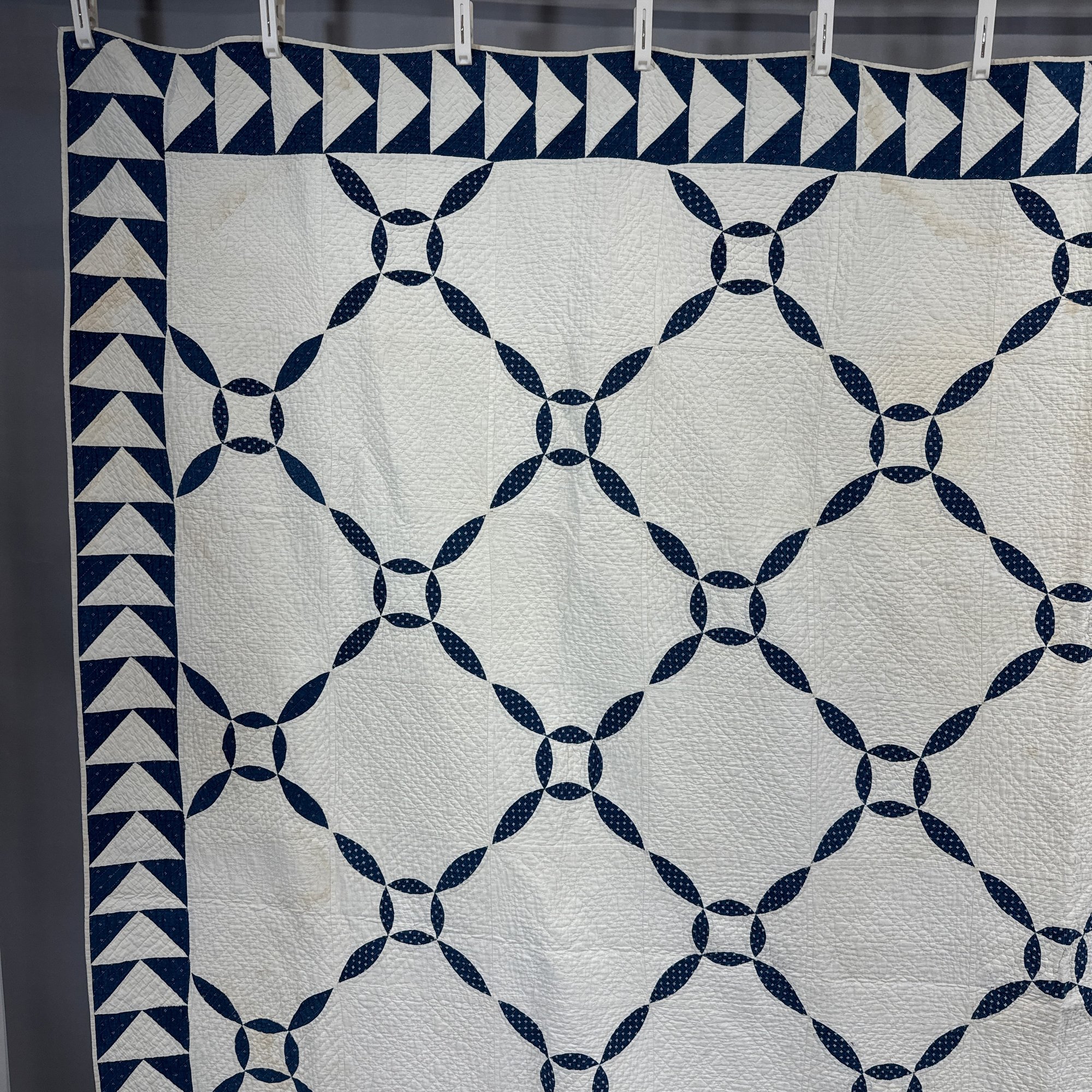 American Blue and White Cotton Piece Work Quilt. Worked in a variant 'Orange Peel' pattern within triangle borders.