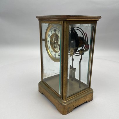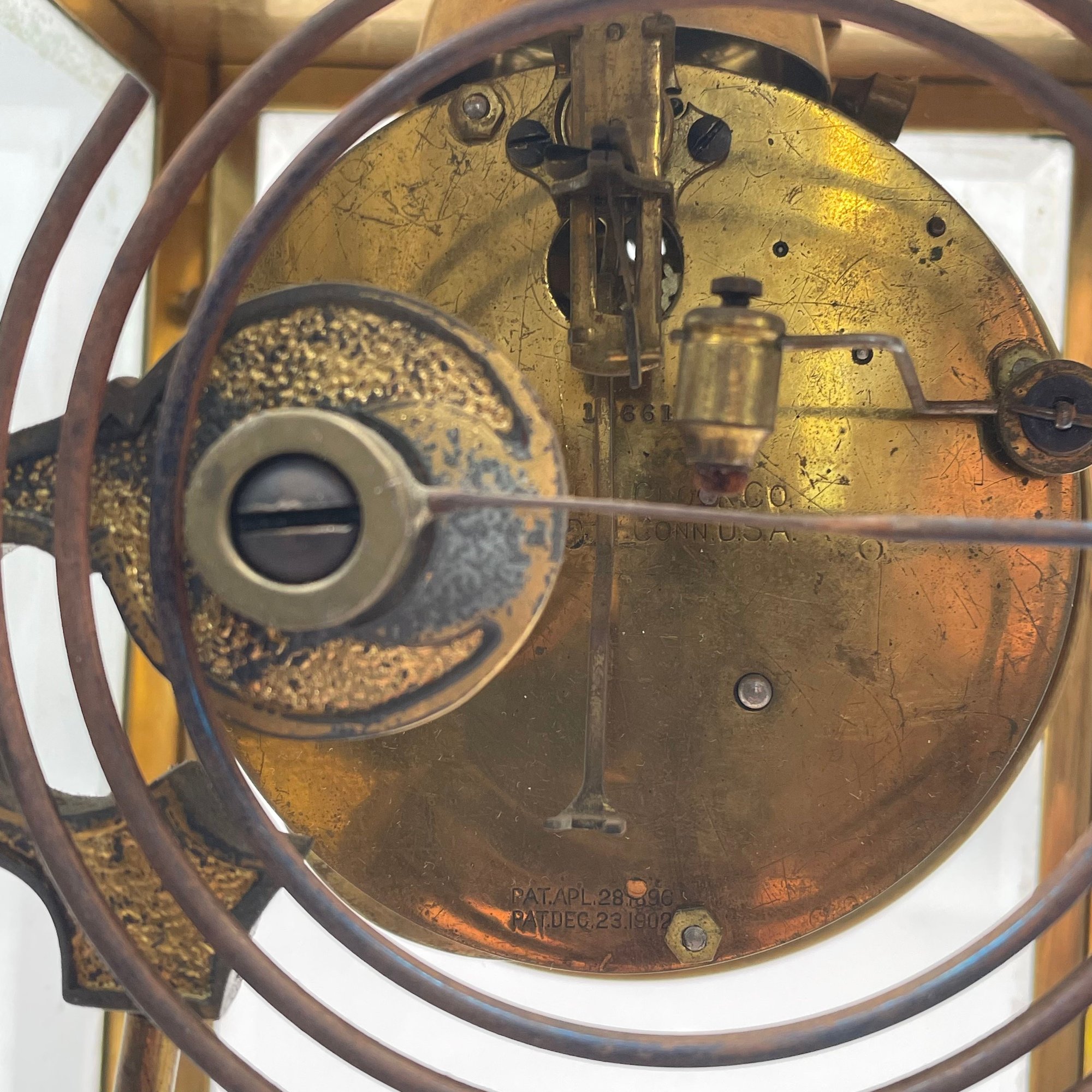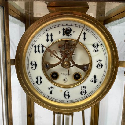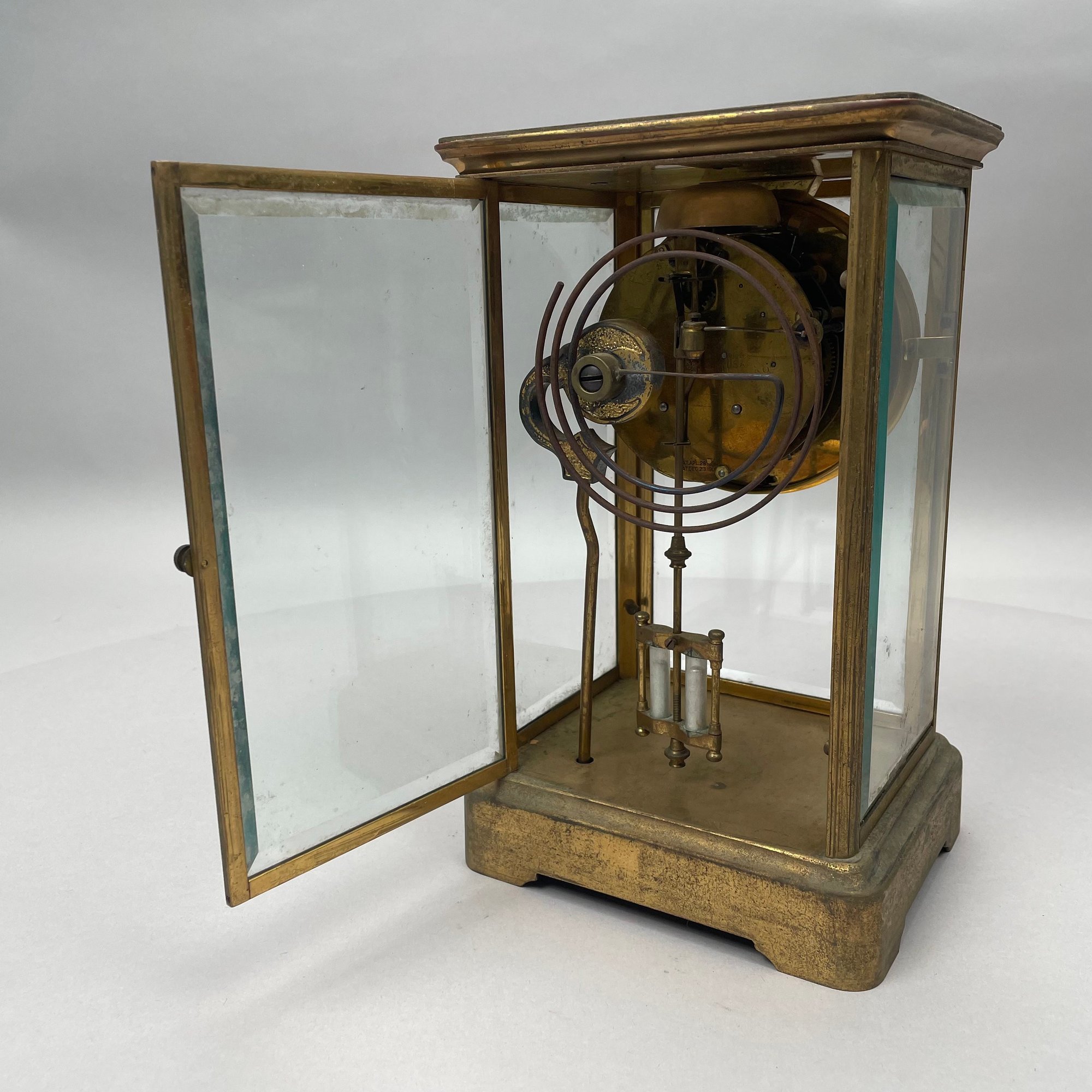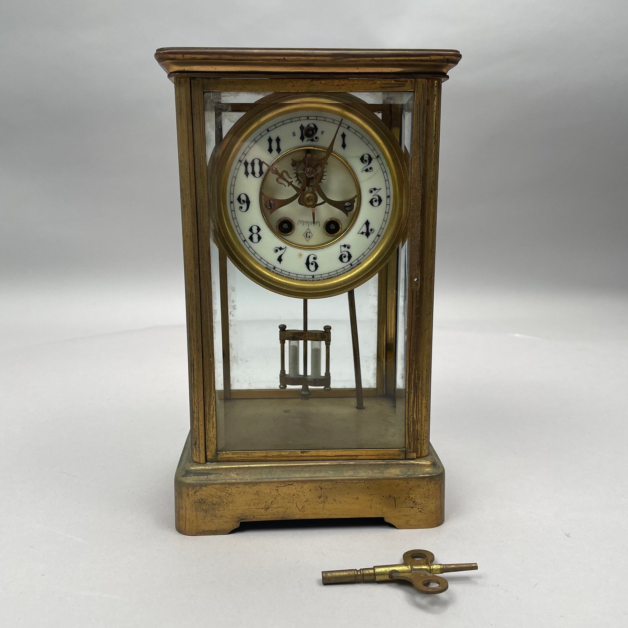 American Brass Cased Crystal Regulator Mantle Clock, Gilbert Clock Factory, Winsted, Connecticut. Serial number 13661, signed "GILBERT CLOCK CO./ WINSTED, CONN. USA" and patent dates.