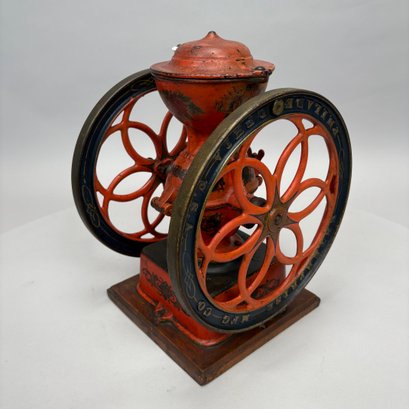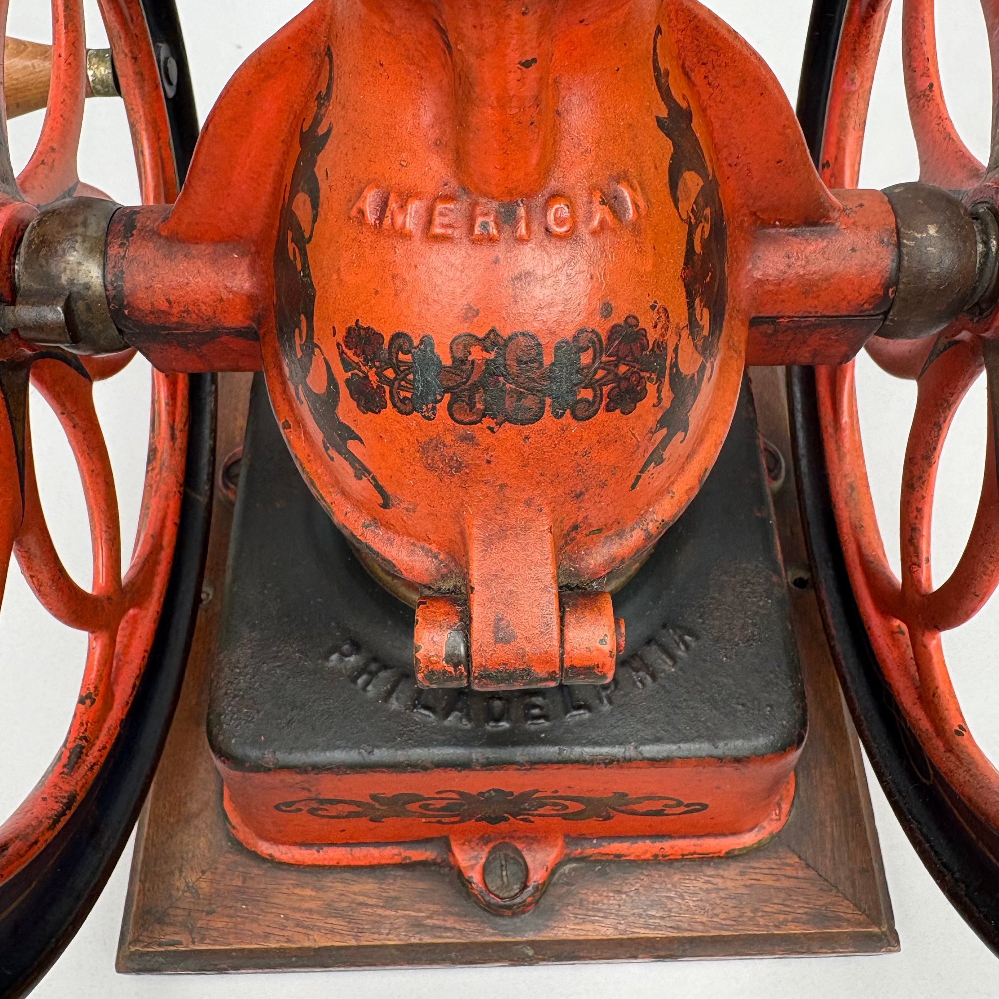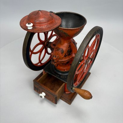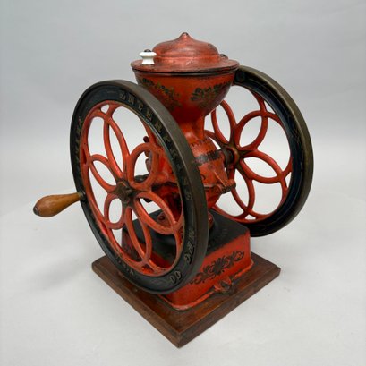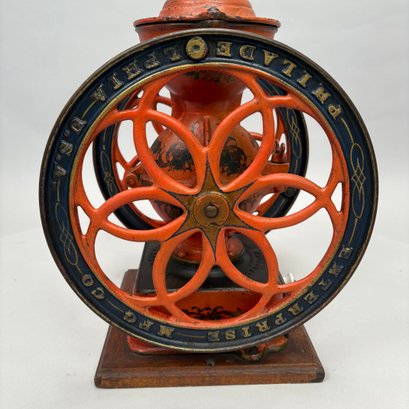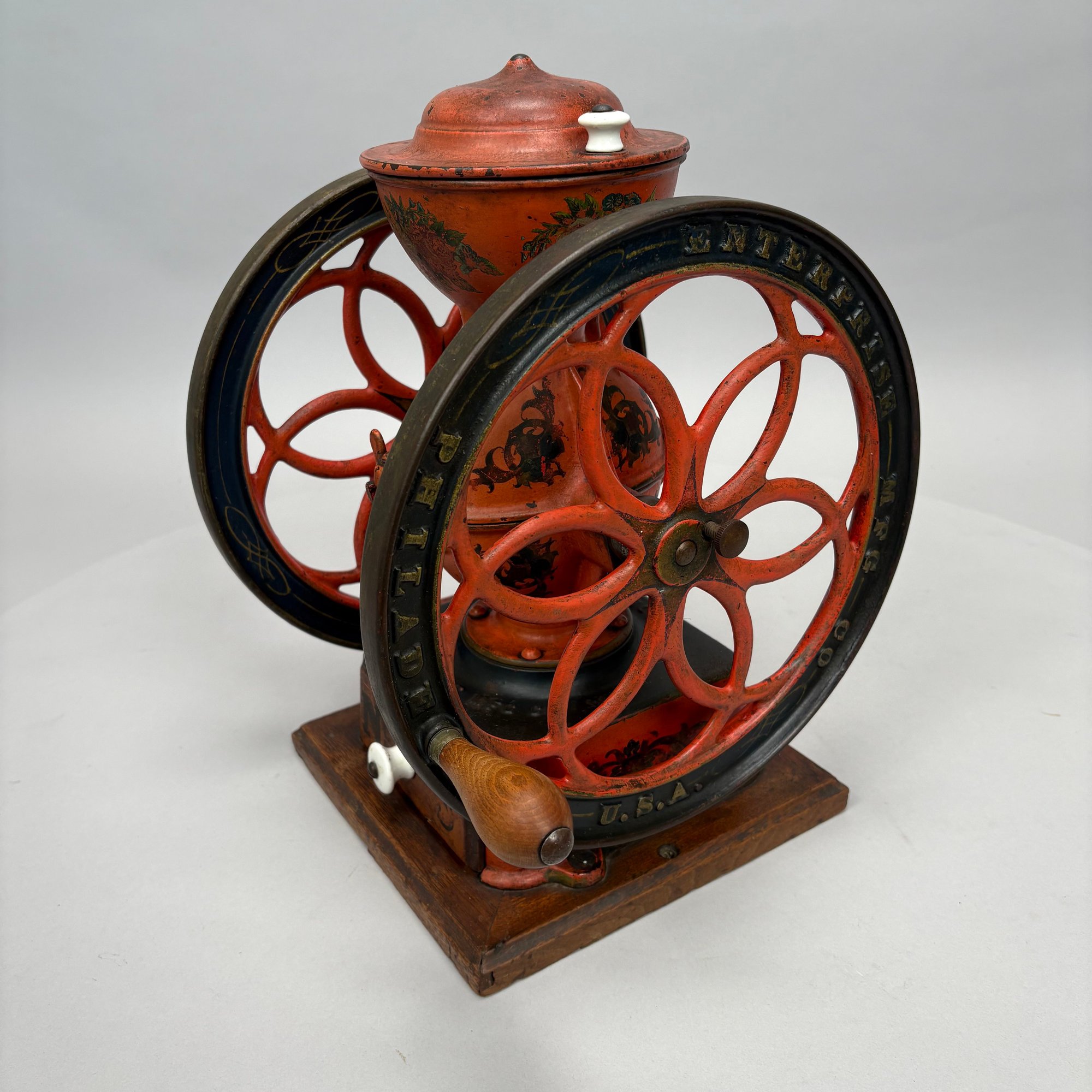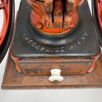 American Cast-Iron N.3 Double-Wheel Coffee Grinder/ Mill, The Enterprise Mfg. Co., Philadelphia, Pennsylvania, Circa 1898. Stencilled "No. 3" on the wood drawer, the base and each wheel marked "ENTERPRISE MFG. CO/ PHILADELPHIA U.S.A." and the body marked "AMERICAN."