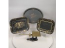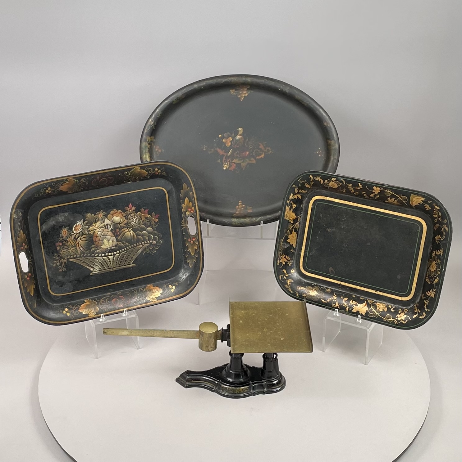 Stencilled "FAIRBANKS"(Erastus And Thaddeus) on each side of the base. Together with three painted or stencilled tin trays. (4)
