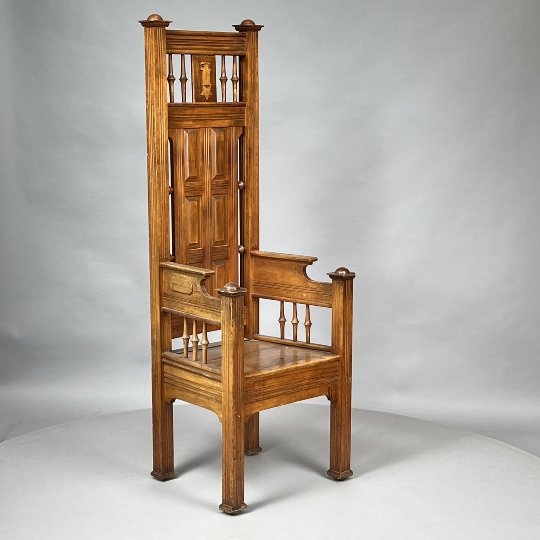 Fitted at the top with turned spindles centering an applied symbol, above a rectangular panelled back and drop arms ending in ball hand grips, the trapezoidal seat raised on straight square legs.
