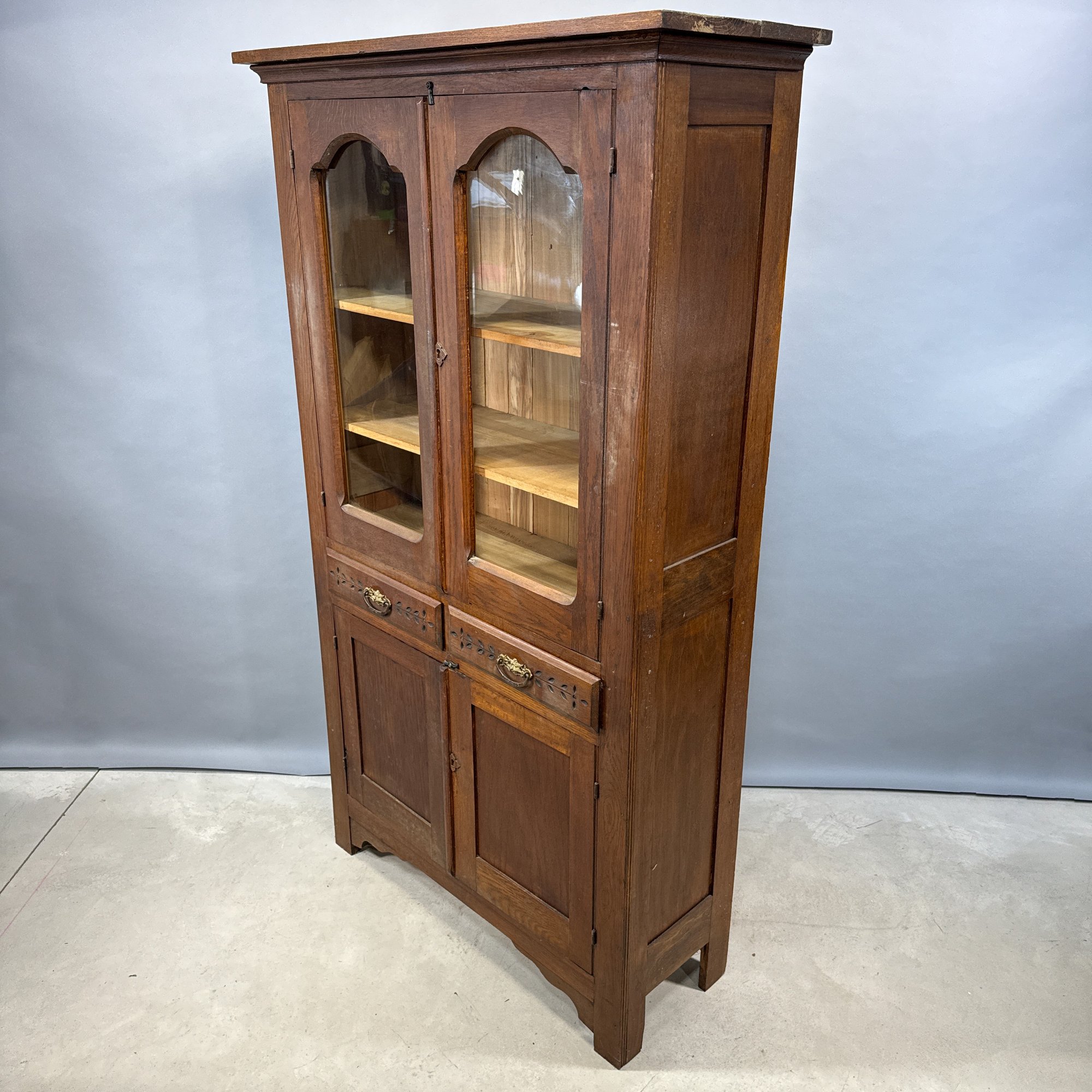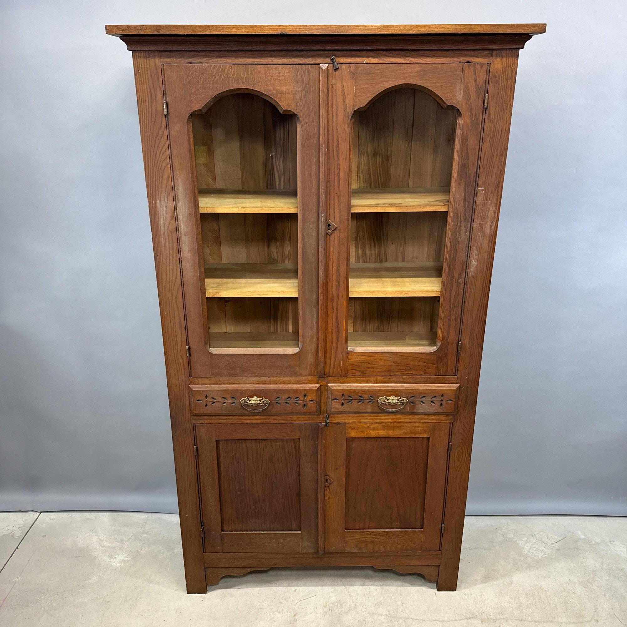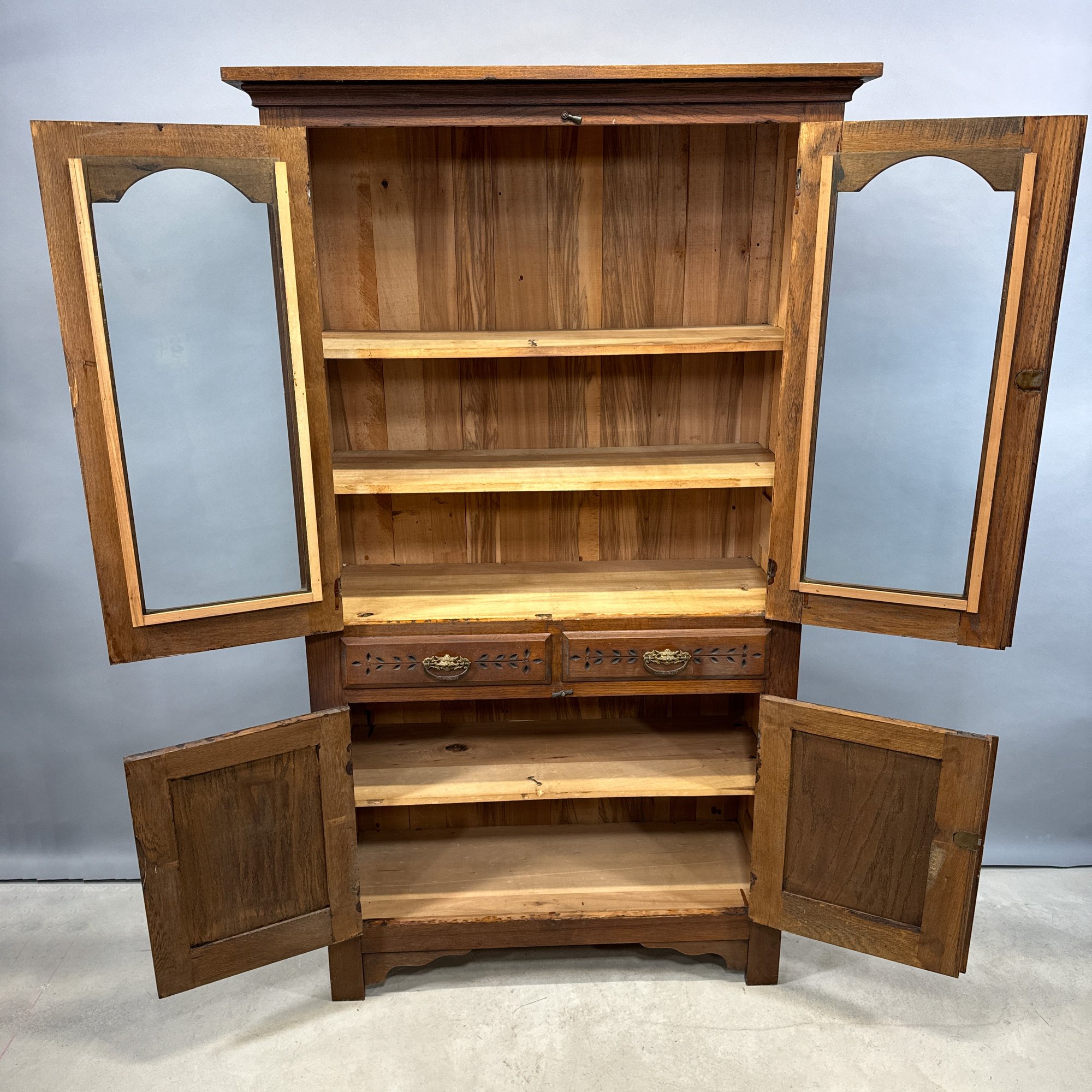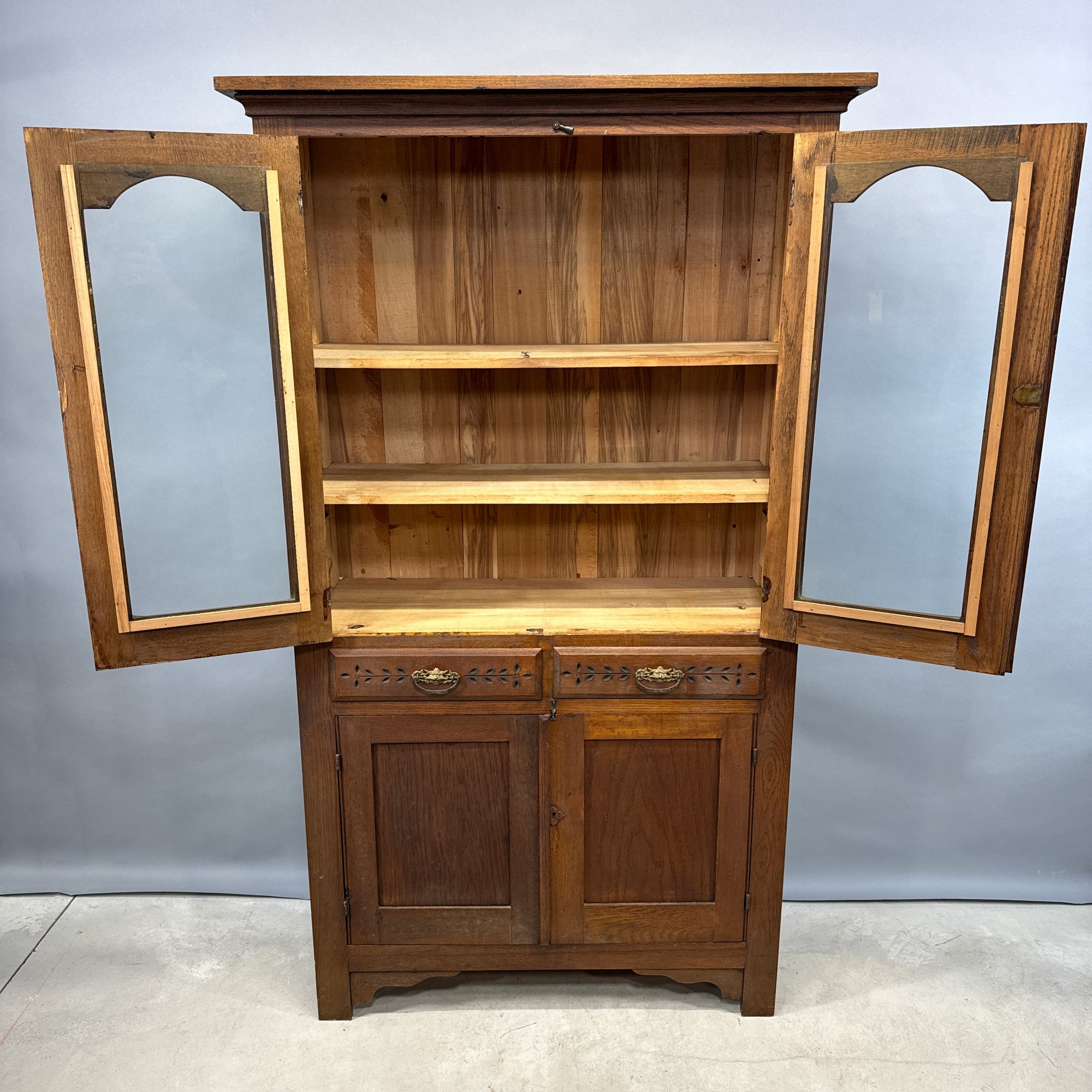 American Country Oak China Cupboard, Late 19th Century and Later. The rectangular cornice above a pair of glazed arched doors opening to two shelves, above two incise-carved aligned drawers, pair of panelled cupboard doors opening to a shelf and a shaped skirt.