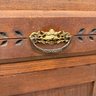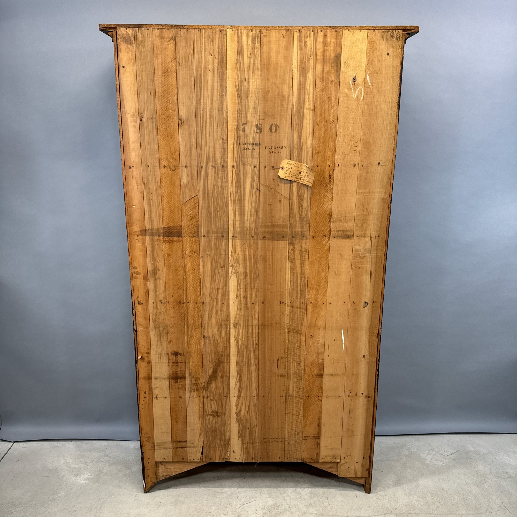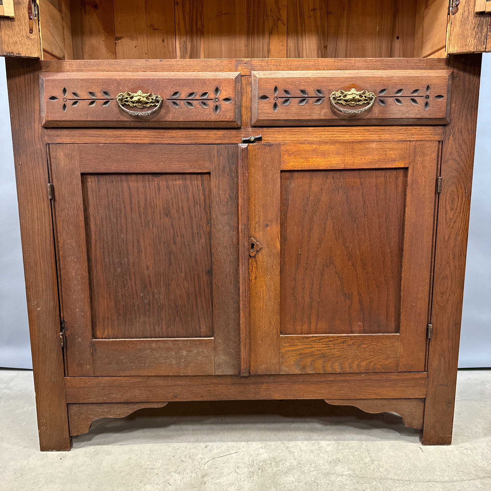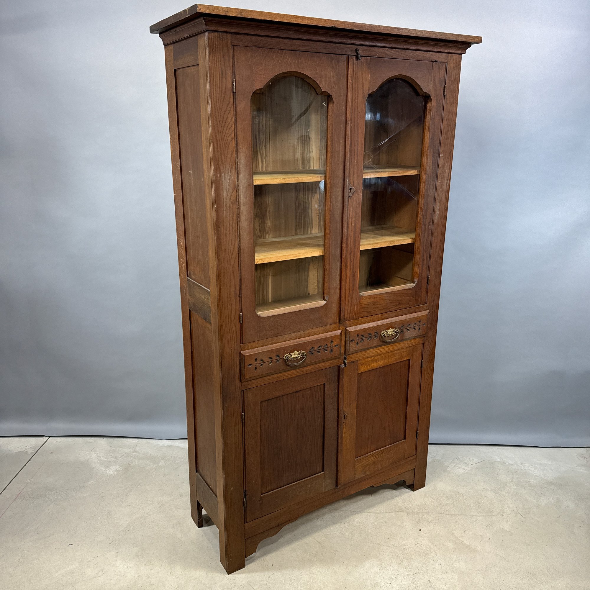 American Country Oak China Cupboard, Late 19th Century and Later. The rectangular cornice above a pair of glazed arched doors opening to two shelves, above two incise-carved aligned drawers, pair of panelled cupboard doors opening to a shelf and a shaped skirt.