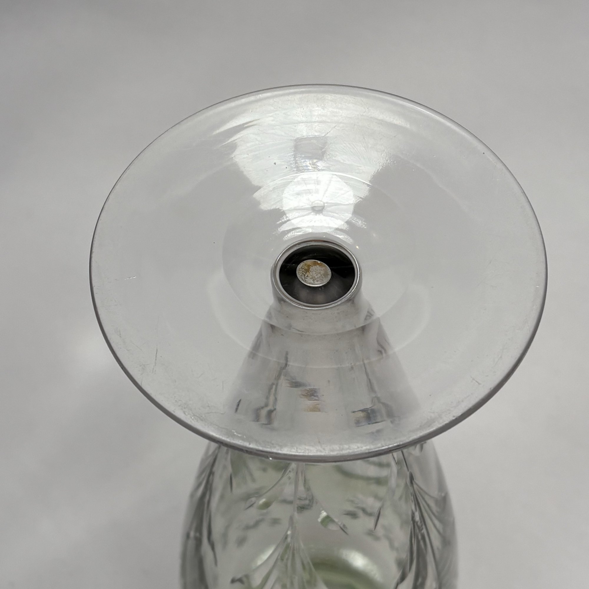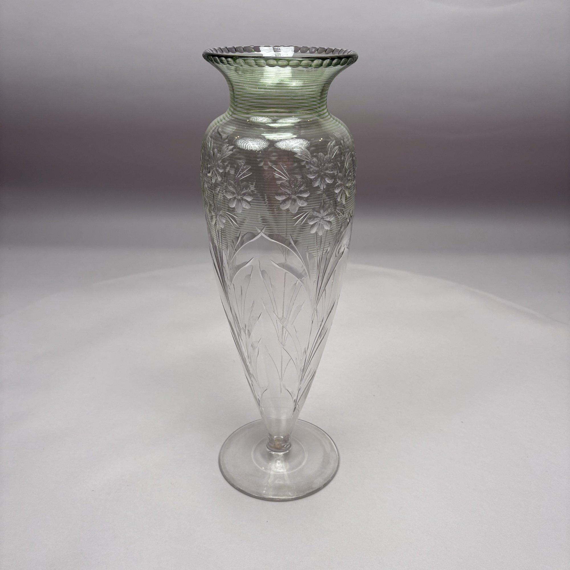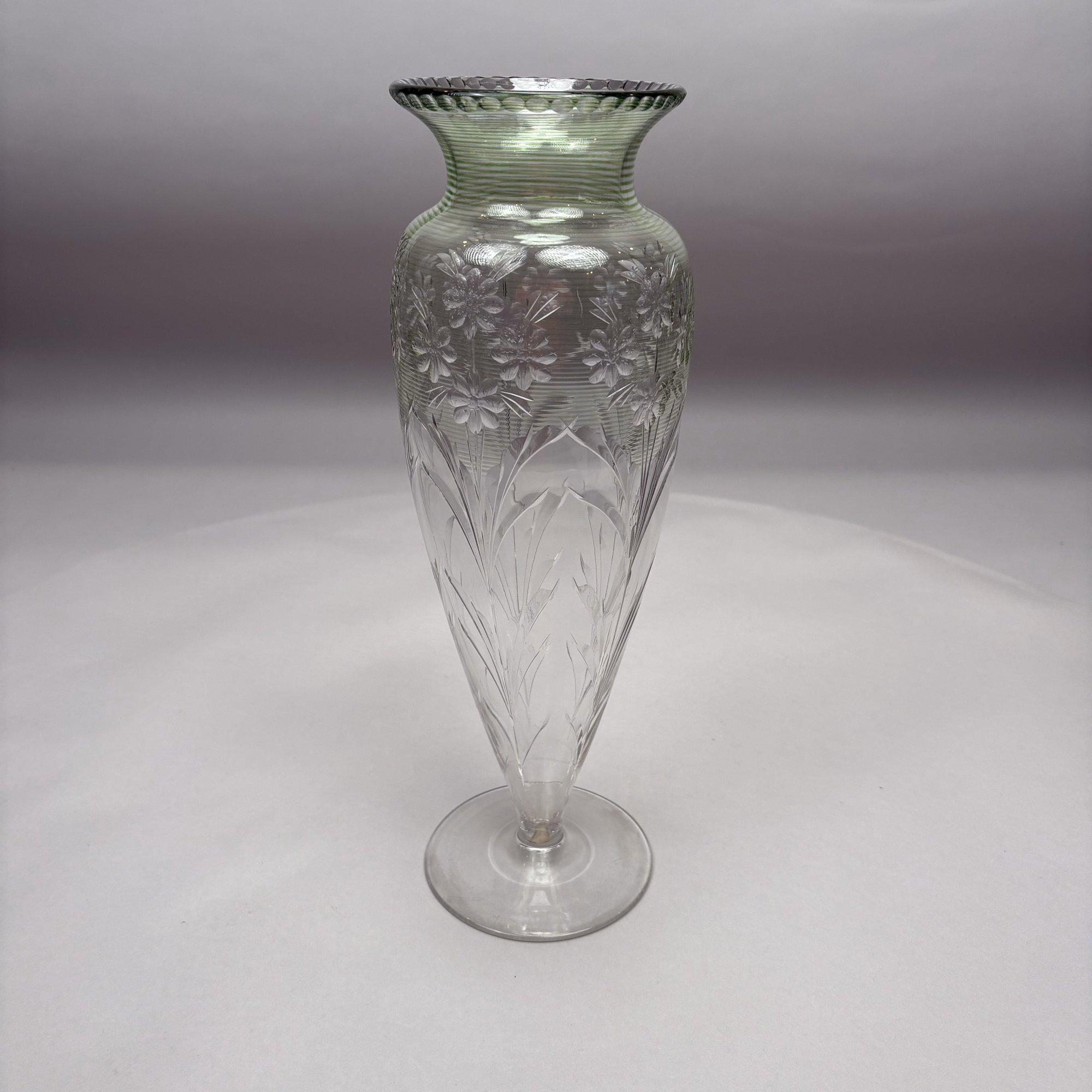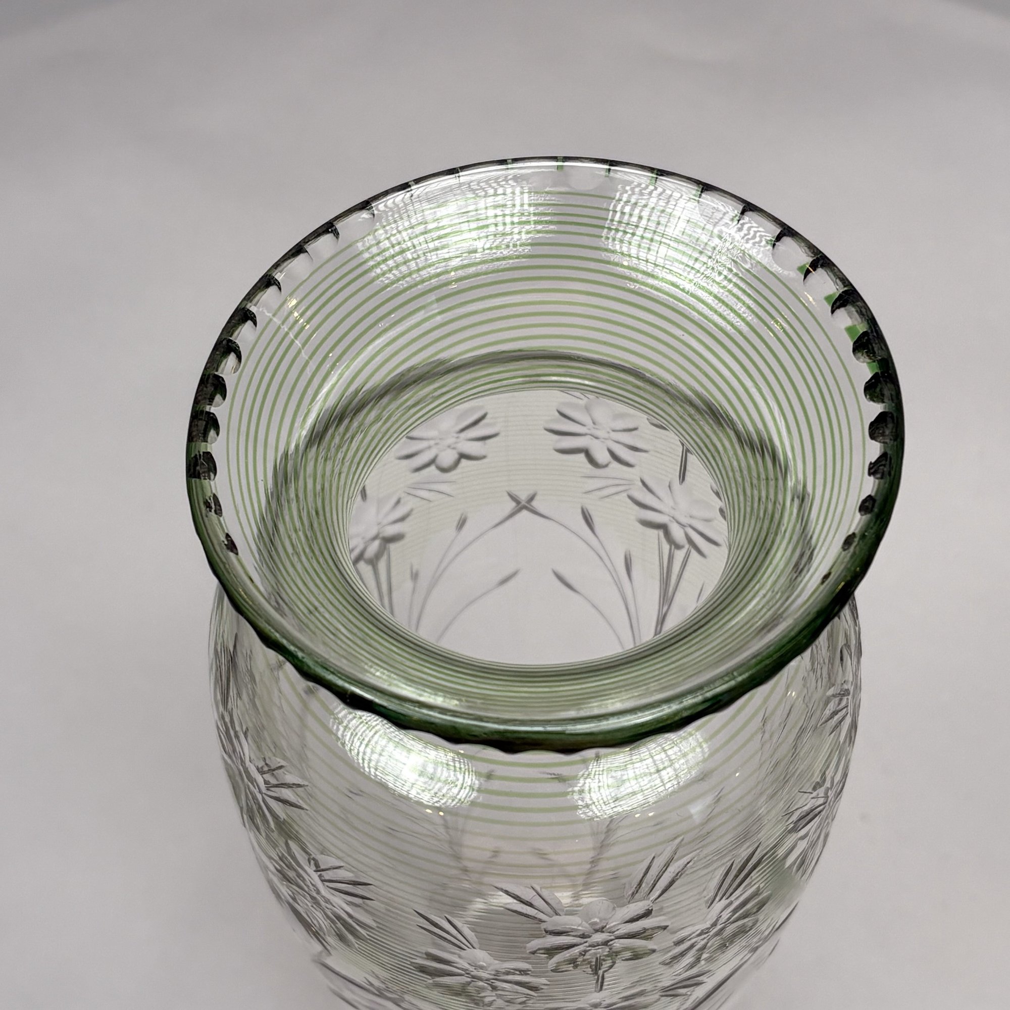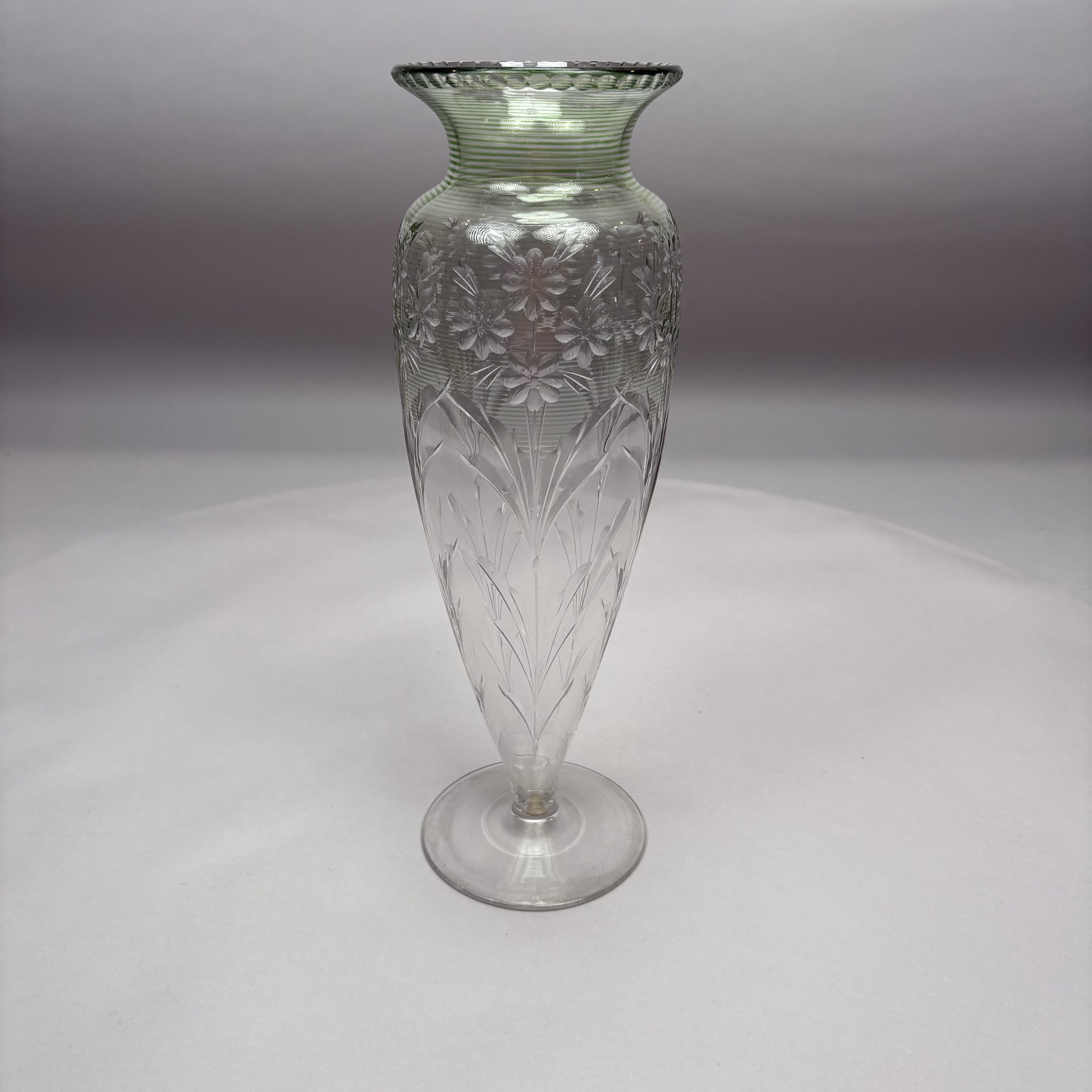American Cut Glass Vase, Late 19th - Early 20th Century. The sides cut with tall flower stems, each bearing four blossoms, the neck surrounded by green rings beneath the rim cut notched with concave ovals.