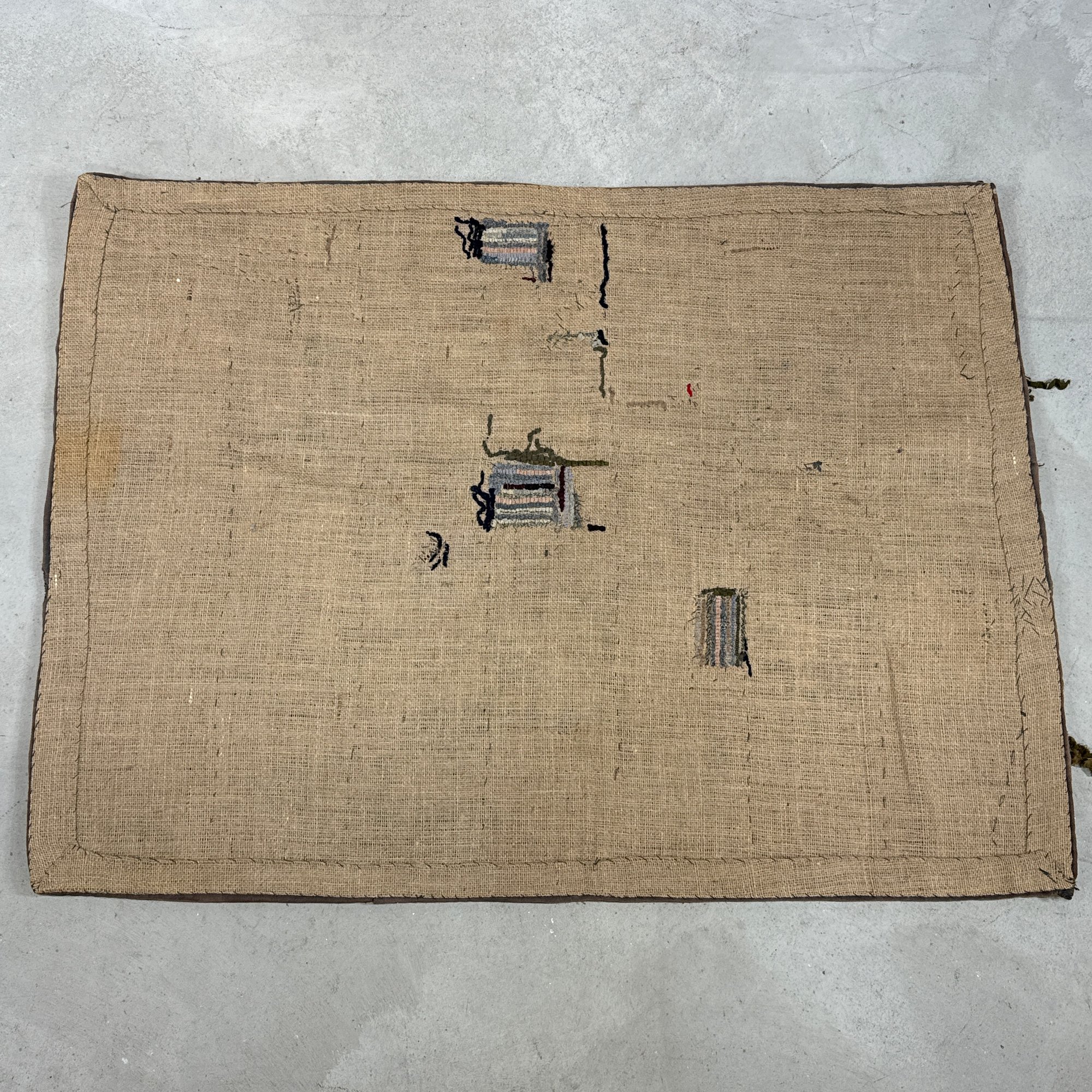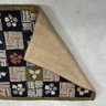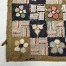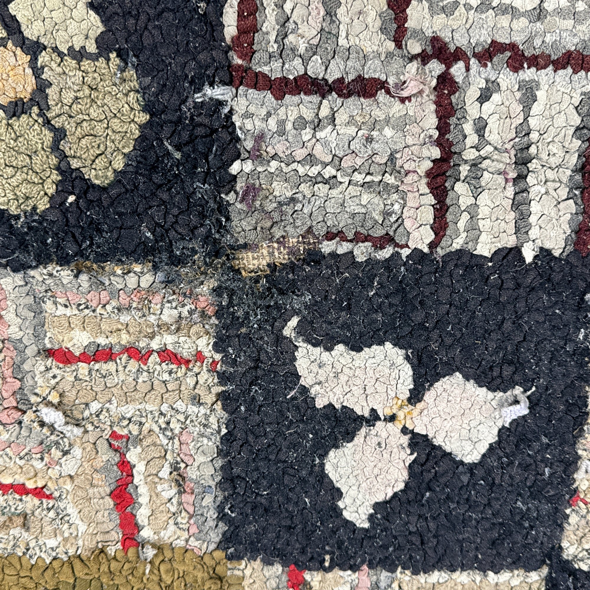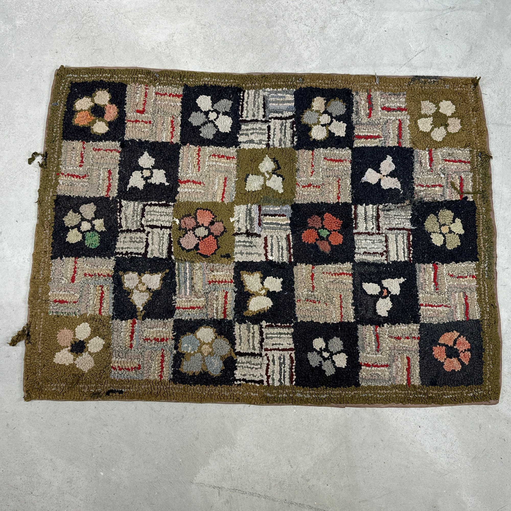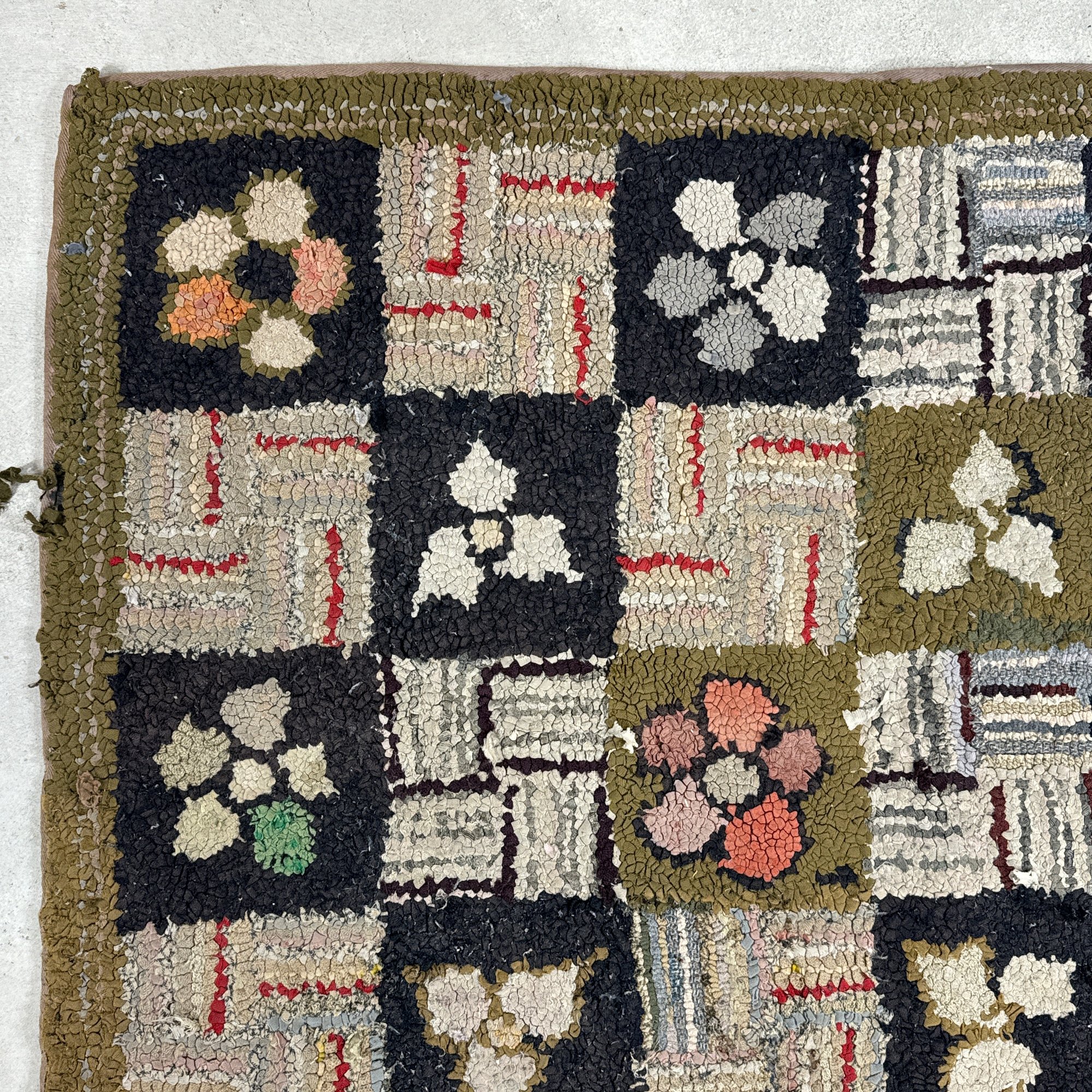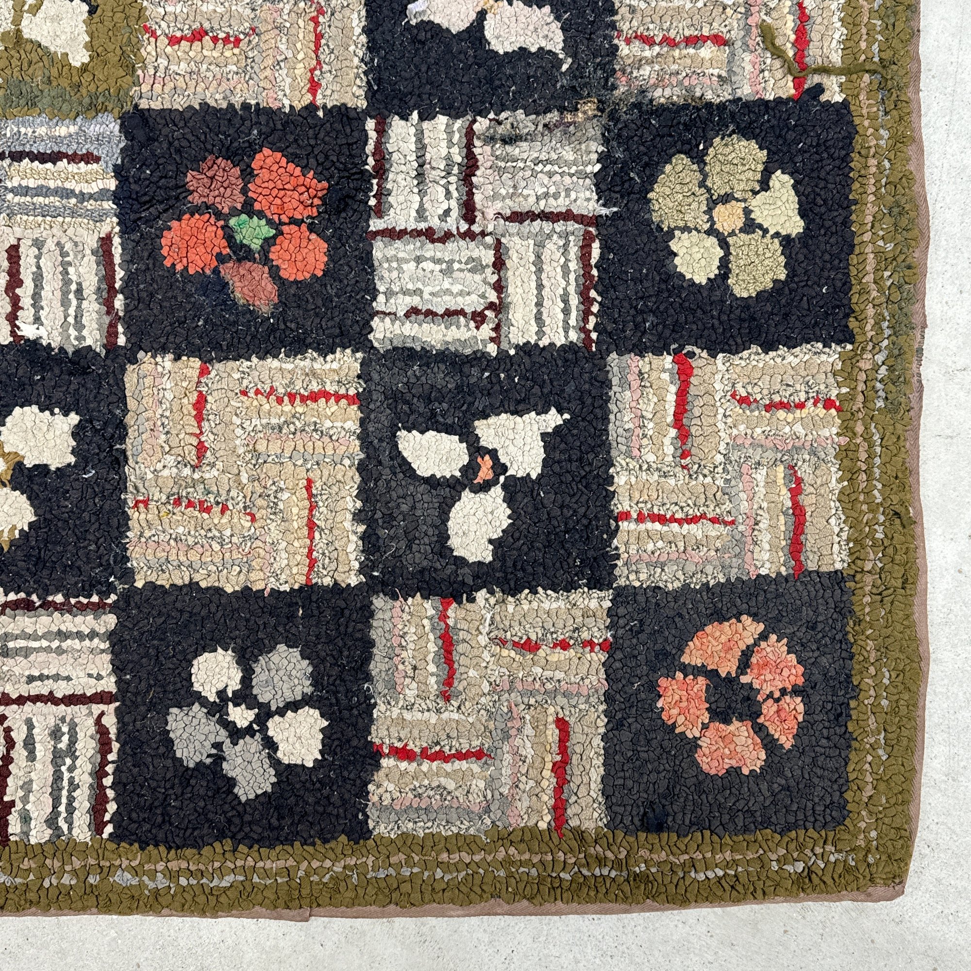 American Hooked Rug, Late 19th-Early 20th Century. Worked in green, red, blue, grey, black and white yarn with blocks containing four shifting squares, alternating with blocks of blossoms and leaves, within a green border.