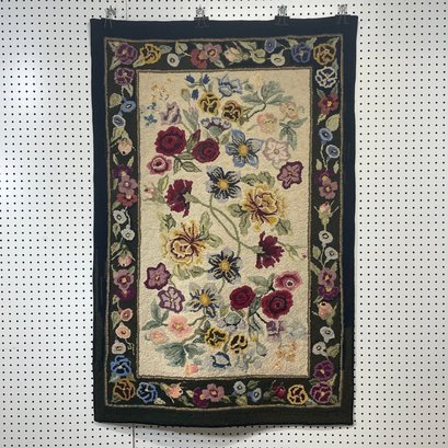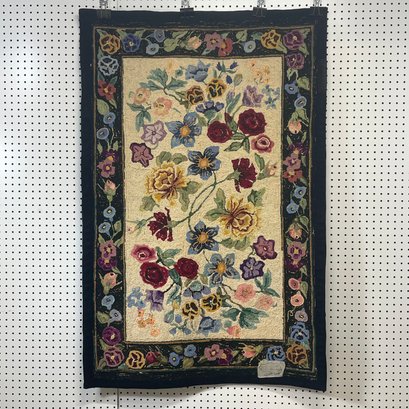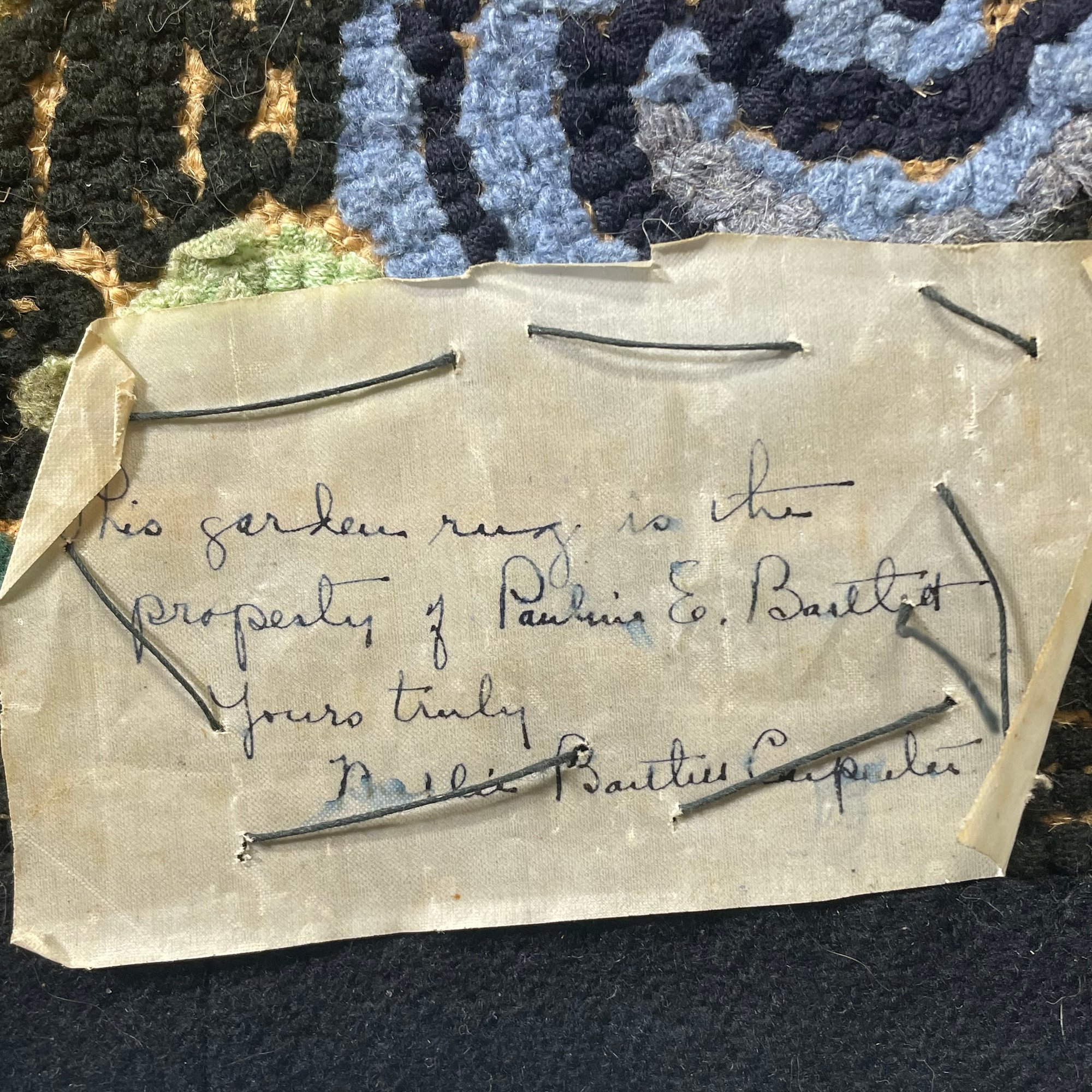 American Hooked Rug, Mollie Elizabeth Bartlett Carpenter, 1940-50. Worked with floral sprays within a border of blossoms, affixed with a tag inscribed "This garden rug is the property of Pauline E. Bartlett, Yours truly, Mollie Bartlett Carpenter."