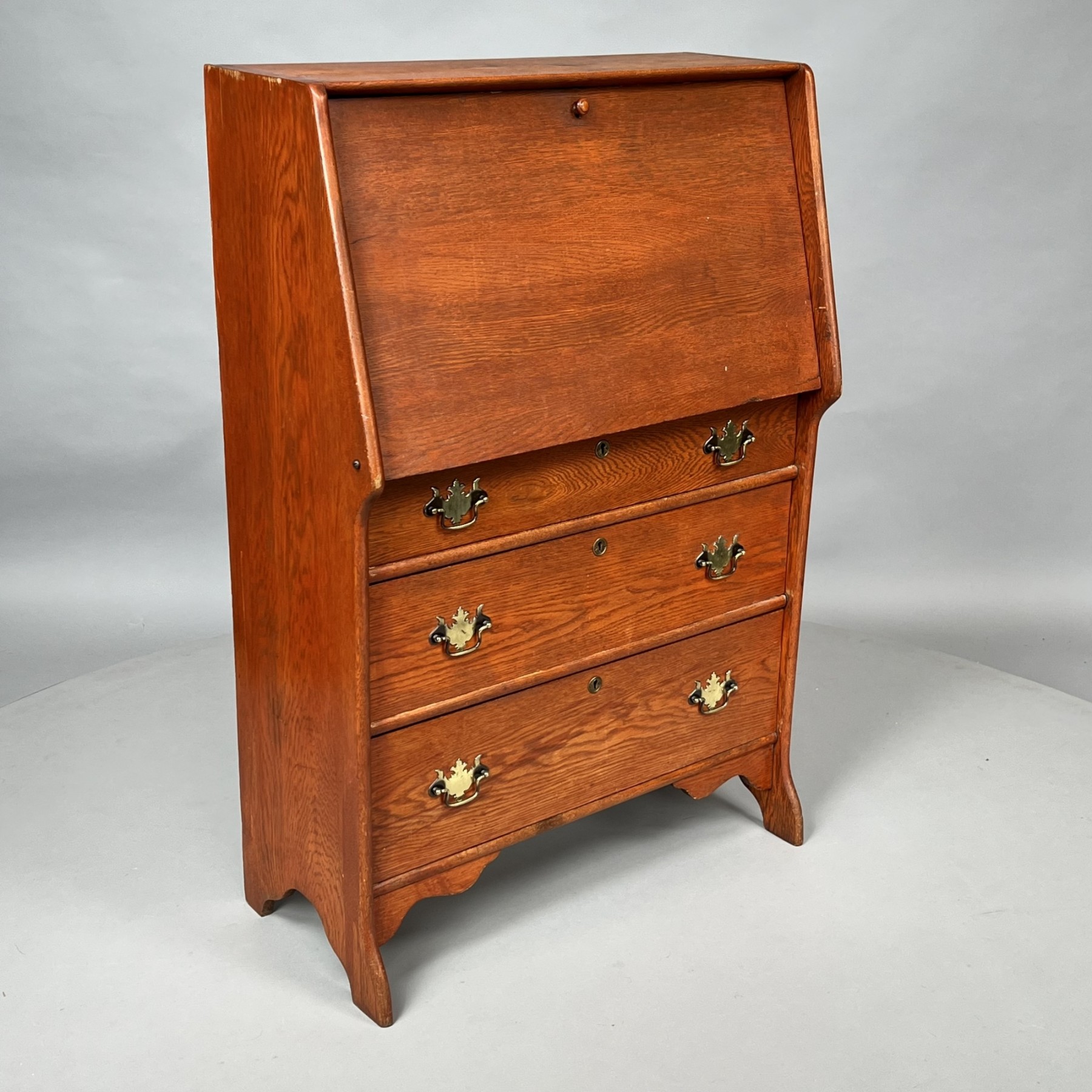 The rectangular top above a hinged door opening to a writing surface and fitted interior, above three long drawers, raised on cut-out legs with shaped returns.