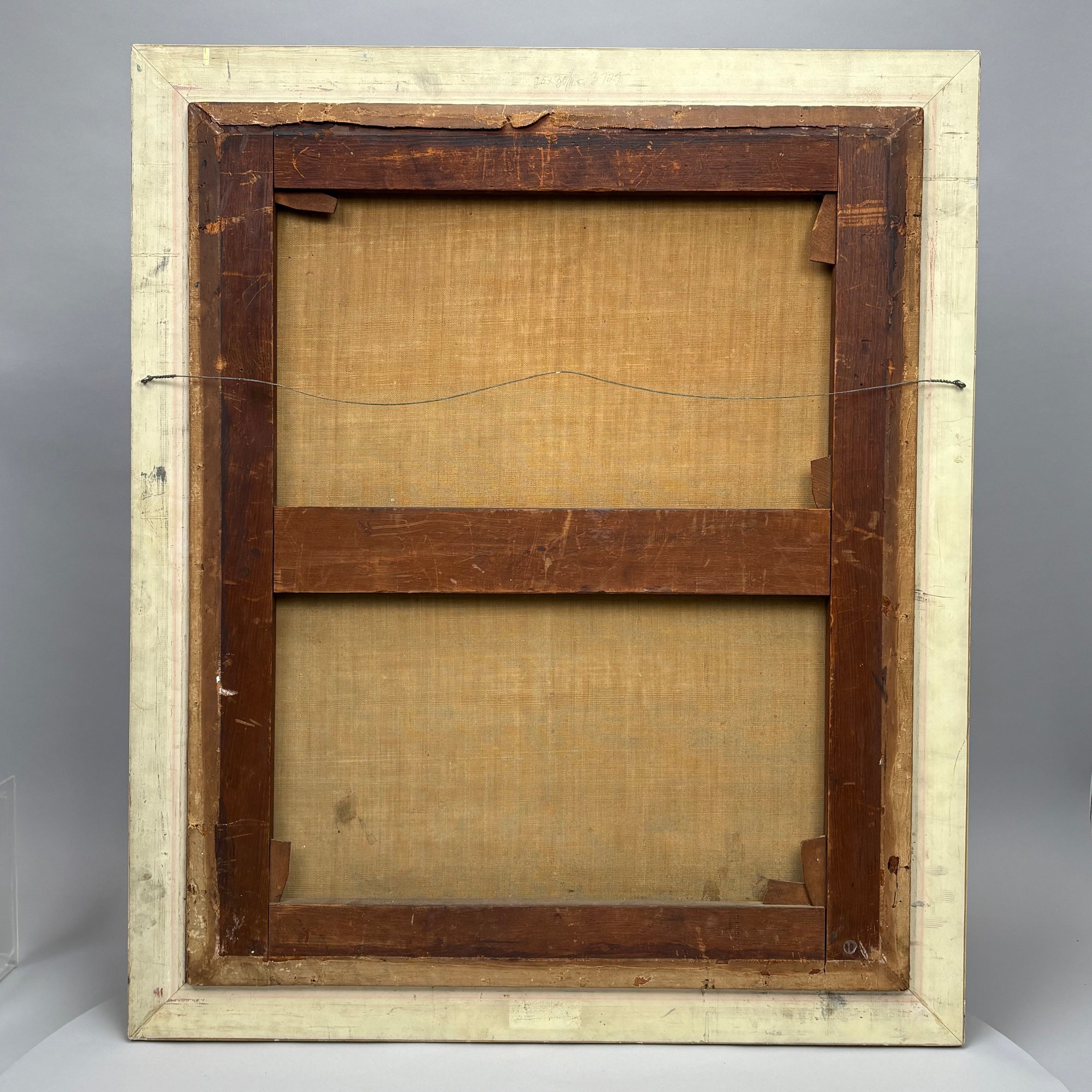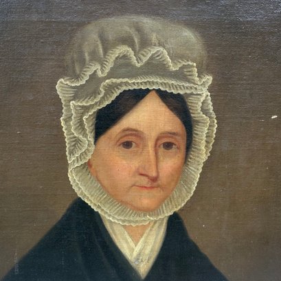 American or British School. Portrait of a Lady, 19th Century. Oil on canvas, wearing a lace bonnet and holding a silver circular box (30.5 x 25 inches).