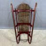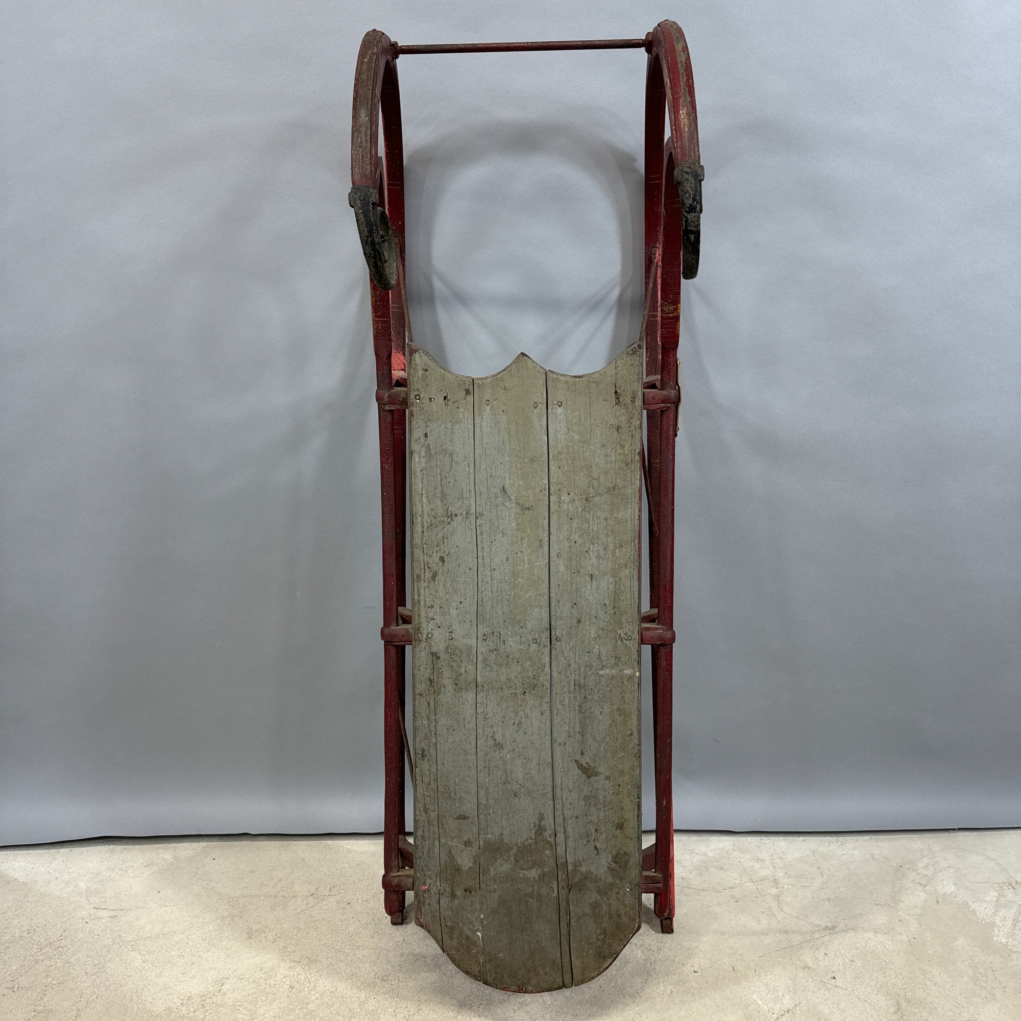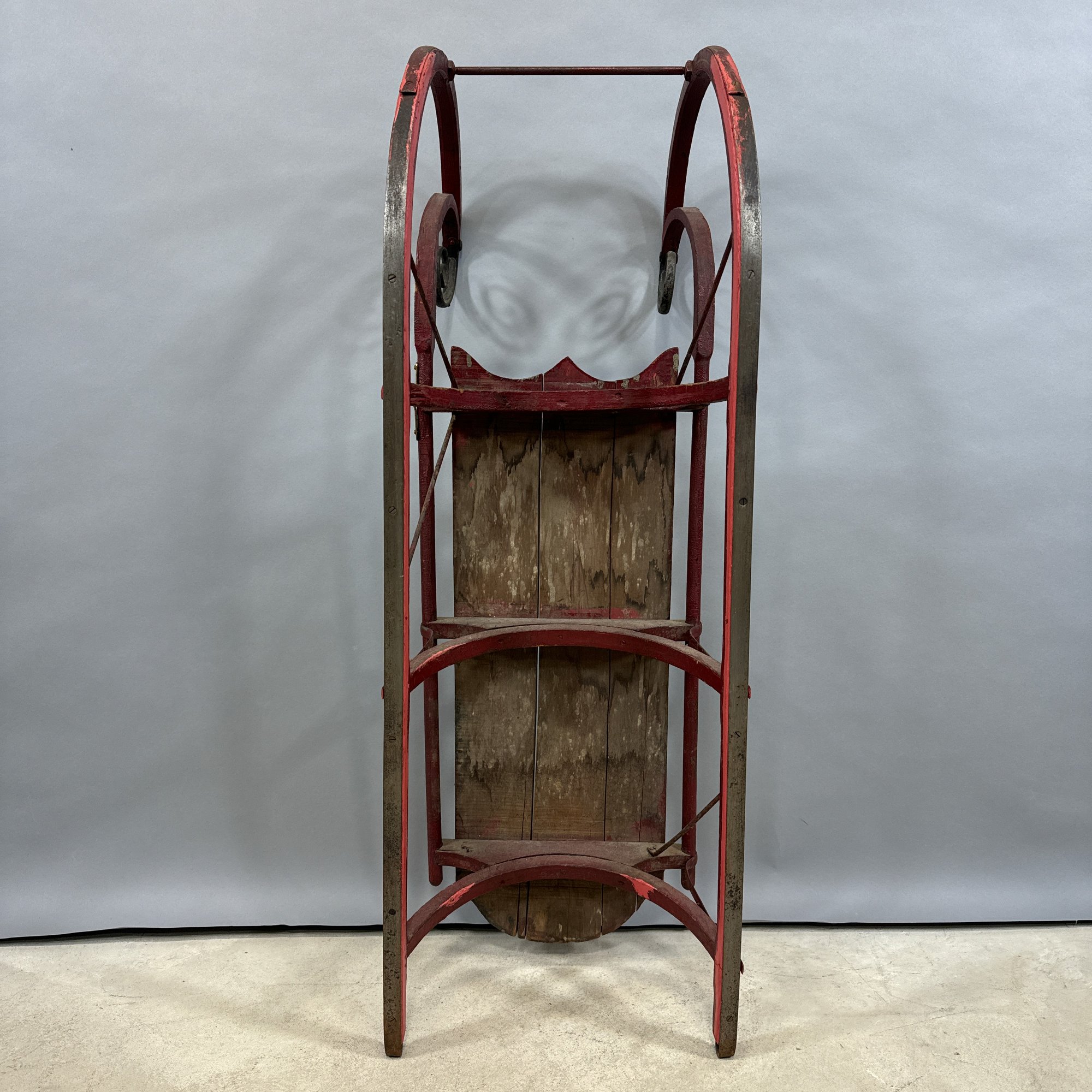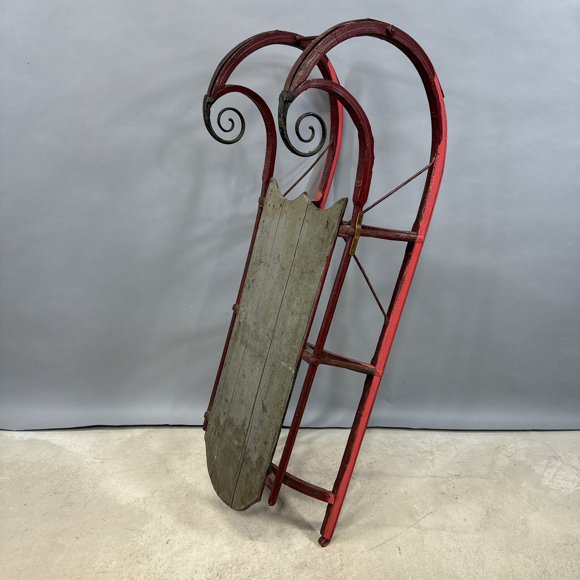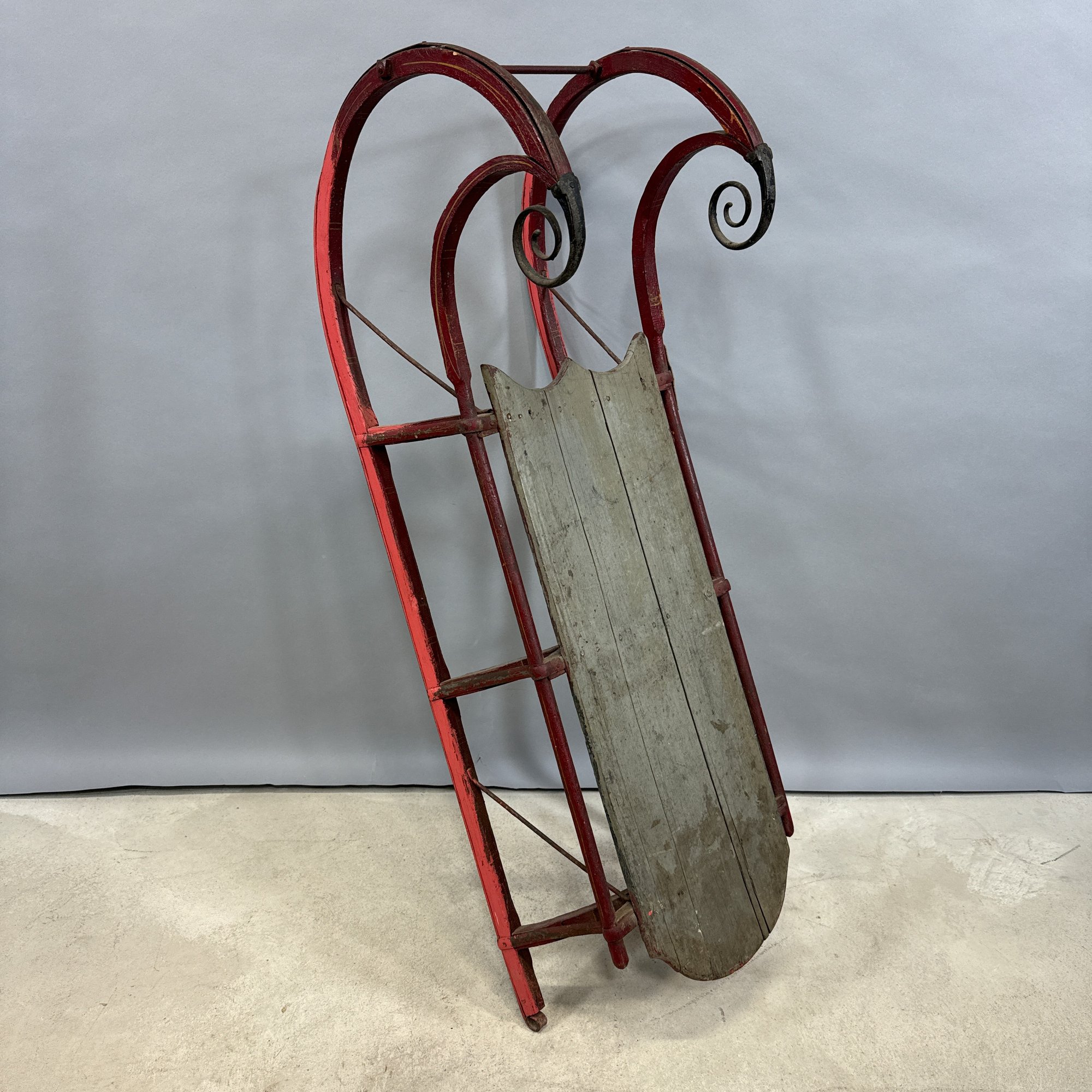 American Paint-Decorated Wood and Iron Children's Sled, 19th Century. In green paint, the wood and wrought-iron runners in red paint outlined in yellow.
