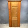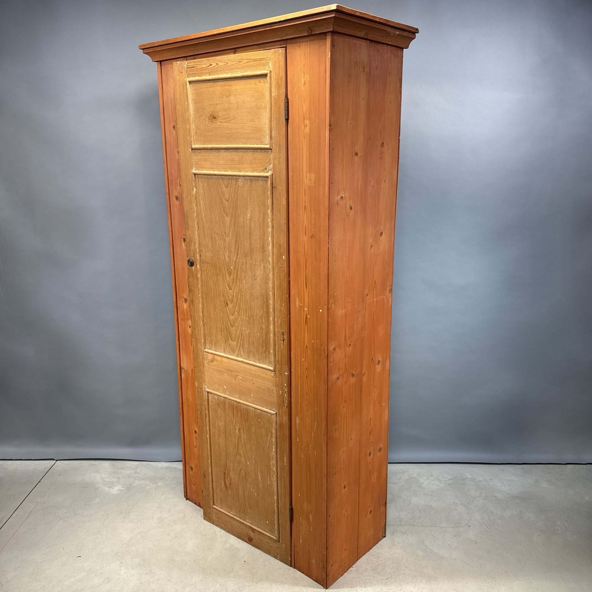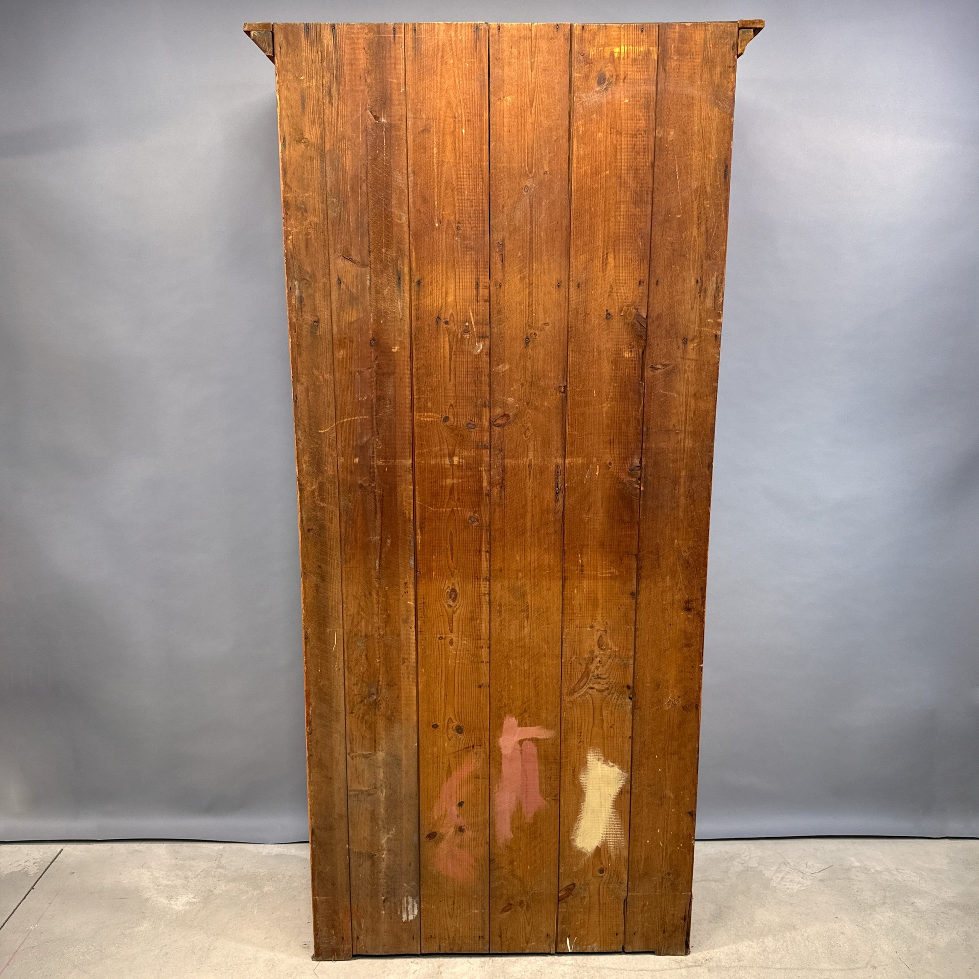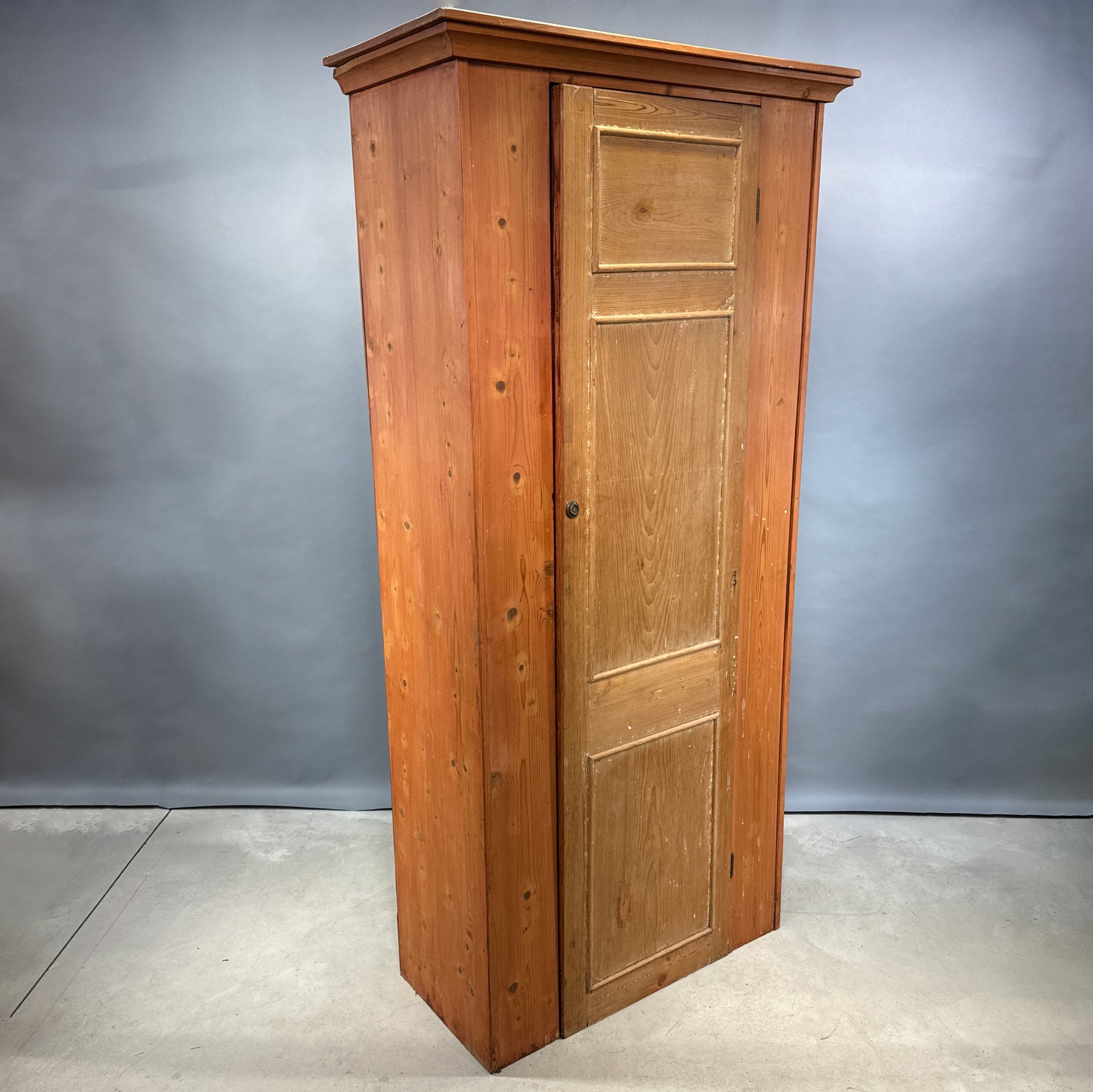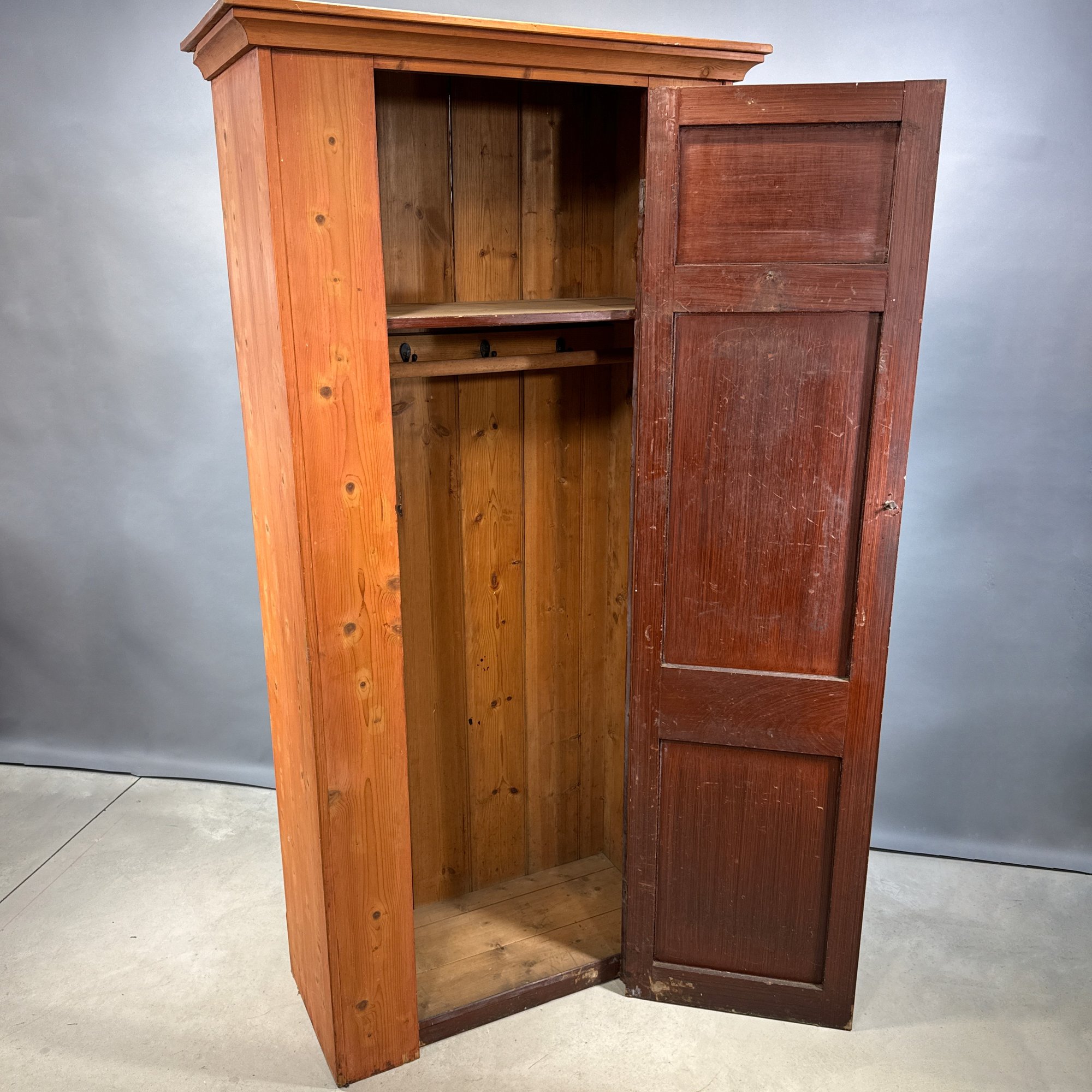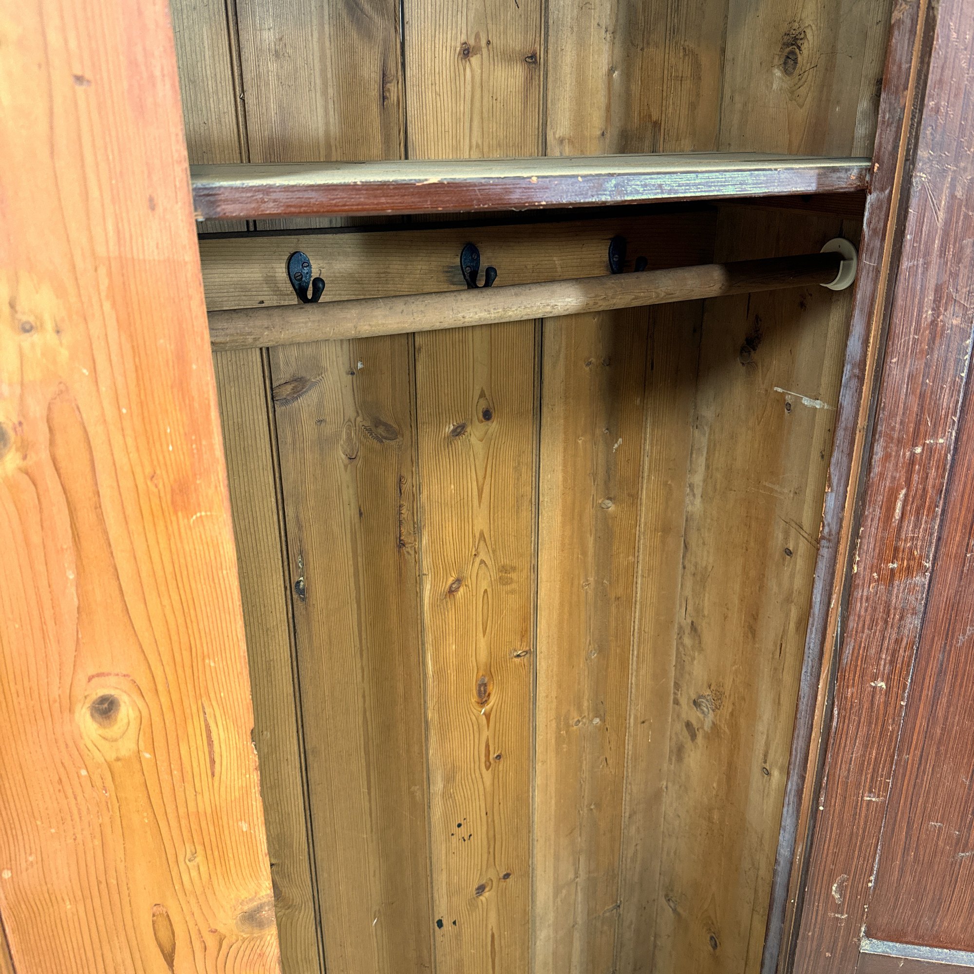 American Pine Wardrobe. The rectangular molded cornice above a panelled cupboard door, opening to a shelf over a closet rod for clothing storage.